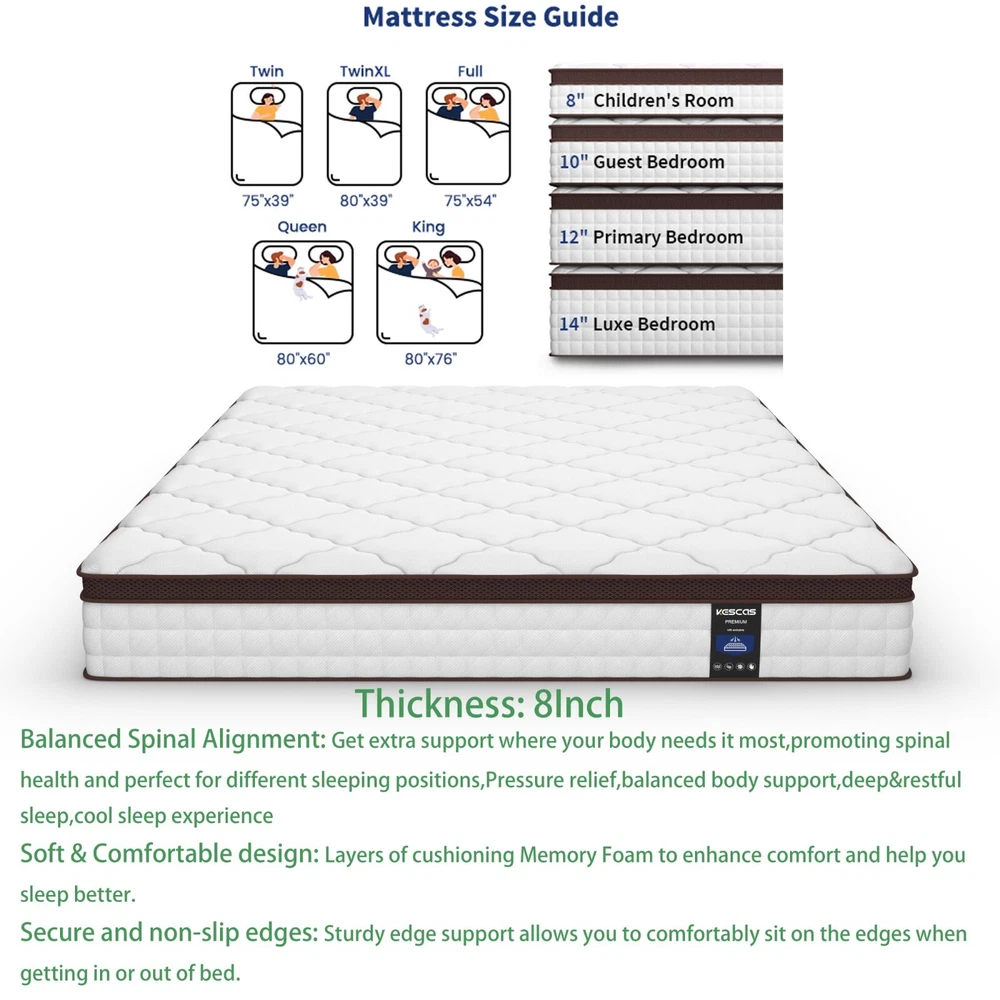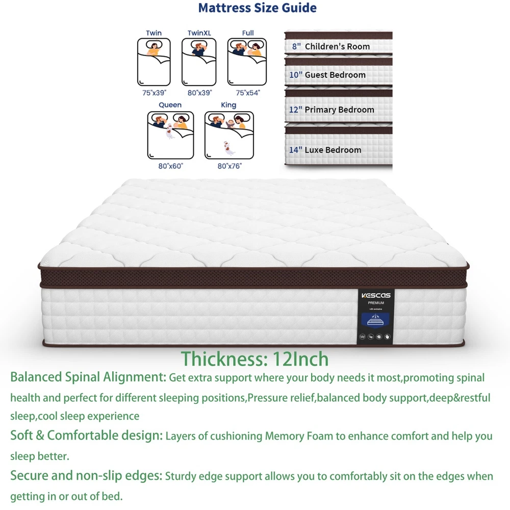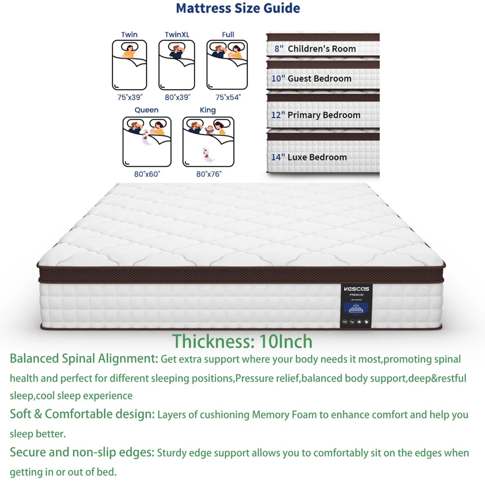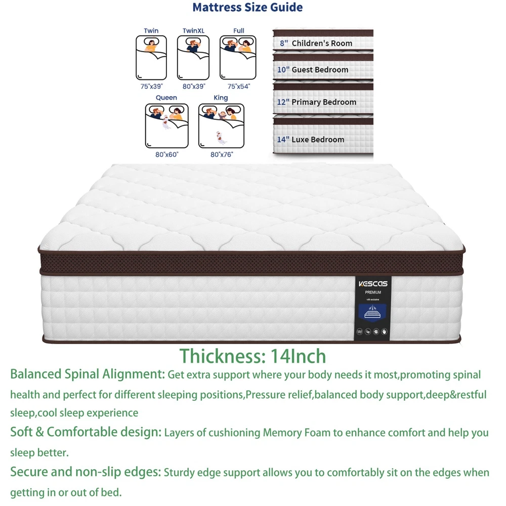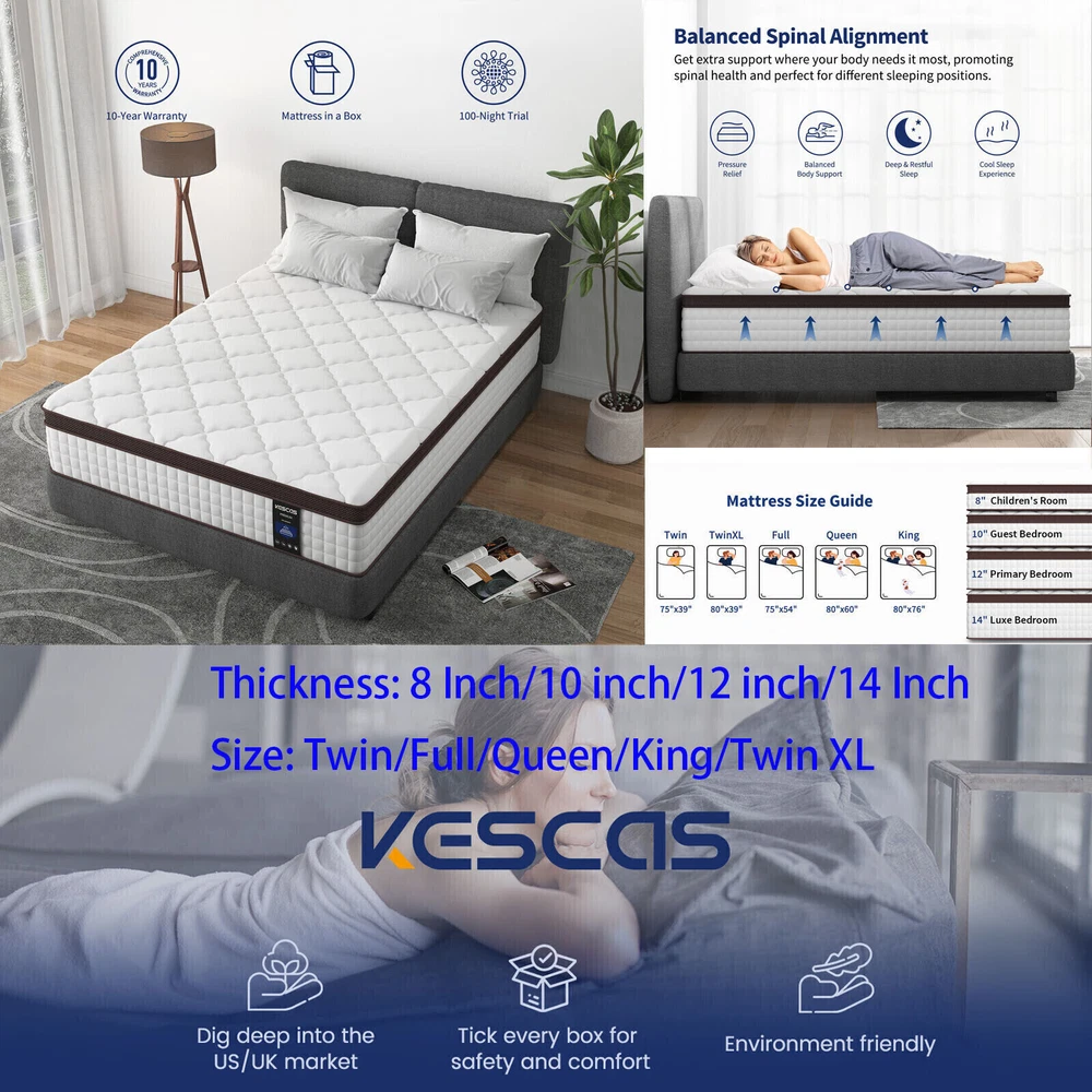 You may also like 14" King Hybrid 5-Zone Pocket Coils Spring Gel Memory Foam Mattress In A Box US 459.99 USD Free shipping King 12In Size Spring Gel Memory Foam Hybrid Mattress Pocket Coils Bed in a Box 329.99 USD Free shipping Product Description 8"10"12"14" Twin Full Queen Twin XL King Size, Gel Memory Foam Mattress In A Box Feature Brand: Kescas Thickness: 8/10/12/14 Inch Size: Twin/Full/Queen/King/Twin XL Construction Type: Inner_spring Item Firmness Description: Medium Material: Memory Foam Comfort Layer Material: Memory foam Fill Material: Individually Pocket Spring About this item 3D KNITTED BREATHABLE FABRIC - Made with 3D soft knitted fabric, this breathable mattress helps to promote airflow and provide a healthy sleeping surface. Its fireproof layer adopts flame-retardant non-woven fabric, which does NOT as well contain any glass fiber. More than that, Kescas hybrid mattress brings you luxurious rest experience of comfort at night with pocket innerspring design. DUAL GEL-INFUSED MEMORY FOAM - Kescas mattress uses dual gel-infused memory foam to regulate your body temperature and bring a cloud-like sleeping experience of coolness, so that you will wake up feeling refreshed. When rendering pressure relief, no reflection of motion will be transferred to sleeping partners. EURO TOP DESIGN - Mattress with dual rows of specially reinforced coils along the edge of the bed makes us easy to sit on it comfortably without slipping off. 690 pocket springs offer perfect support to your spine throughout the night, which is suitable for all kinds of sleeping positions, help to relieve pressure and improve sleeping quality. PACKAGE & FASHION - This mattress is compressed, rolled, and shipped in a box for a convenient delivery. It will accent your bedroom with style, while providing you with the most comfortable sleep experience you can imagine. KESCAS AFTER-SALES - Kescas mattress is efficiently compressed into a box that’s shipped right to your door, simply unbox, unroll and the mattress does the rest, expanding to its original shape within 72 hours. 100 hassle-free night trial, 100-Days Money Back and worry-free 10 year limited warranty included. Please don't hesitate to contact us if there is any question, we will reply to you within 24 hours. SUPPORTIVE FOAM & POCKET SPRINGS - Our firmest mattress ever is engineered with heavier gauge steel independent pocket innersprings for added stability and medium firmness. With soft comfort foam, durable high-density foam and motion-isolating independent pocket springs with a quilted jacquard cover offer a medium firm feel that's perfect for stomach sleepers, and plus-sized individuals and those who enjoy a very medium firm mattress. CERTIPUR US CERTIFIED & PRESSURE RELIEVING - Highest quality foam is CertiPUR-US Certified for durability, performance, and content. 4 foam layers for optimal softness and support. Provide cushioning and serve as protective buffer, relieve painful pressure points on the body. Ideal for stomach sleepers and those who suffer from back and neck pains. HIGH PERMEABILITY & STRONG EDGE SUPPORT - Knitted fabric cover offers the softest touch and luxurious feel. Made of dual-layered soft knitted fabrics, super breathable! Help to release heat and regulate sleeping climate. Airy mesh on the side promotes heat dissipation and independently encased coils beneath enhances airflow, which makes the sleeping cool and comfortable. MADE IN CENTURY-OLD BRAND FACTORY FOAM AND GLOBAL MATERIAL - Innovative performance in every layer, manufactured right here. Our R&D Center located in South Carolina of USA. Customized according to North American customer standards. Straight out of our first ever, state-of-the-art, global production technology in North American. EXPERTLY PACKAGED AND GENERAL NOTE - Kescas mattress is efficiently compressed into a box that's shipped right to your door, simply unbox, unroll and the mattress does the rest, expanding to its original shape within 72 hours. 100 hassle-free night trial, 100-Days Money Back and worry-free 10 year limited warranty included. Please don't hesitate to contact us if there is any question, we will reply to you within 24 hours. Packing list: 1x Kescas 8/10/12/14 Inch Twin/Full/Queen/King/Twin XL Size Mattress Mattress Size Information Size Specific size Firmness Weight 8 inch Twin Size 75''L × 39''W × 8''H Medium 38.03 lbs 8 inch Full Size 75''L × 54''W × 8''H Medium 53.90 lbs 8 inch Queen Size 80''L × 60''W × 8''H Medium 59.88 lbs 10 inch Twin Size 75''L × 39''W × 10''H Medium 42.99 lbs 10 inch Full Size 75''L × 54''W × 10''H Medium 57.14 lbs 10 inch Queen Size 80''L × 60''W × 10''H Medium 63.07 lbs 10 inch Twin XL Size 80''L × 39''W × 10''H Medium 46.41 lbs 12 inch Twin Size 75''L × 39''W × 12''H Medium 51.92 lbs 12 inch Full Size 75''L × 54''W × 12''H Medium 68.78 lbs 12 inch Queen Size 80''L × 60''W × 12''H Medium 77.71 lbs 12 inch King Size 80''L × 76''W × 12''H Medium 94.80 lbs 12 inch Twin XL Size 80''L × 39''W × 12''H Medium 55.12 lbs 14 inch Queen Size 80''L × 60''W × 14''H Medium 78.37 lbs 14 inch King Size 80''L × 76''W × 14''H Medium 95.68 lbs Product Description Highly mixes the traditional support of built-in spring mattress and comfort of memory foam to bring moderate comfortable experience. Dual-layer memory foam creates the optimum softness and support to relieve your pain points on the body. Airy mesh on the side promotes heat dissipation and independently encased coils beneath enhances airflow, which makes the sleeping cool and comfortable. CERTIPUR US CERTIFIED 4 FOAM LAYERS for optimal softness and support. Provide cushioning and serve as a protective buffer, relieving painful pressure points on the body. Ideal for stomach sleepers and those who suffer from back and neck pains. MADE IN NORTH AMERICAN FOAM AND GLOBAL MATERIAL - Innovative performance in every layer, manufactured right here. Customized according to North American customer stan