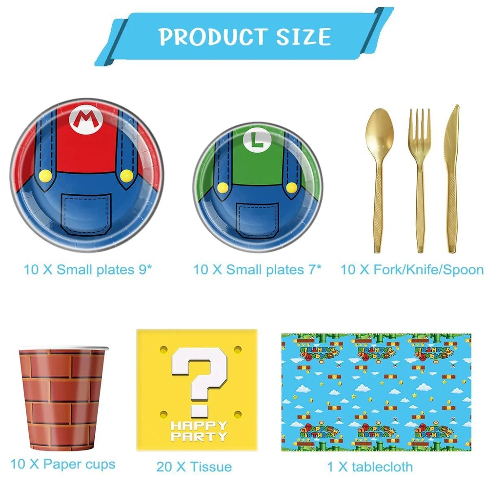 81Pcs Party Tableware Set For Super Mario, Super Brother Party Decoration, Super Brother Birthday Party Supplies 1.Super Brother Party Decoration Packaging includes:You will receive 1Pcs 42inch× 71inch tablecloth 10Pcs 7inch dessert plates,10Pcs 9inch dinner plates,20Pcs 6.5 x 6.5 inch napkins ,10Pcs fork,10Pcs spoons,10Pcs knives, 10Pcs Cup. 2.Super Brother Theme Element Design:These party decorations can be used for birthday parties,super brother theme parties, family gatherings, christmas parties, video game party, graduation ceremonies, outdoor picnics, baby showers and more to create a fun and cheerful atmosphere for your party, leaving you and your family and friends with a memorable and happy impression for photo shoots. 3.High-Quality Material:Birthday Party Supplies made from recyclable 100% Food Grade,BPA-Free heavy duty paper,firm,non-toxic,eco-friendly,won't folded,teared or broken easily. 4.Enjoy The Party:these super brother happy birthday party tableware is disposable that no needs washing up,simply throw out to the garbage after party,It is biodegradable and will not pollute the environment,which can reduces clean-up time and enjoy more time with friends and guests,Please don't microwave paper plates. 5.Ou Guan promises: If you are not satisfied, we will refund 100%. If you have any ideas, please contact us in time. We will reply within 24 hours. 1.Super Brother Party Decoration Packaging includes:You will receive 1Pcs 42inch× 71inch tablecloth 10Pcs 7inch dessert plates,10Pcs 9inch dinner plates,20Pcs 6.5 x 6.5 inch napkins ,10Pcs fork,10Pcs spoons,10Pcs knives, 10Pcs Cup. 2.Super Brother Theme Element Design:These party decorations can be used for birthday parties,super brother theme parties, family gatherings, christmas parties, video game party, graduation ceremonies, outdoor picnics, baby showers and more to create a fun and cheerful atmosphere for your party, leaving you and your family and friends with a memorable and happy impression for photo shoots. 3.High-Quality Material:Birthday Party Supplies made from recyclable 100% Food Grade,BPA-Free heavy duty paper,firm,non-toxic,eco-friendly,won't folded,teared or broken easily. 4.Enjoy The Party:these super brother happy birthday party tableware is disposable that no needs washing up,simply throw out to the garbage after party,It is biodegradable and will not pollute the environment,which can reduces clean-up time and enjoy more time with friends and guests,Please don't microwave paper plates. 5.Ou Guan promises: If you are not satisfied, we will refund 100%. If you have any ideas, please contact us in time. We will reply within 24 hours. Shipping from the USA All of our products are shipped from the USA, ensuring quick delivery to your destination. Payment We offer the following payment methods: PayPal, credit card, bank transfer, and eBay's secure payment system. Free Shipping & Free Returns Shipping within the USA is FREE. Additionally, any return is absolutely free for you. Risk-Free Purchase You have the option to return an item within 30 days without any justification. We cover the return shipping costs! Fast Shipping We ship immediately upon receipt of payment. Generally, the package is delivered within 2-3 days in the USA. If it takes longer, we will contact you. Quality and Costs Made in Europe, USA, China No customs fees or additional charges Total satisfaction guarantee Invoice with declared VAT available upon request in .pdf format Feedback Your feedback is very important to us. After you pay for your purchase, you will automatically receive positive feedback from us.