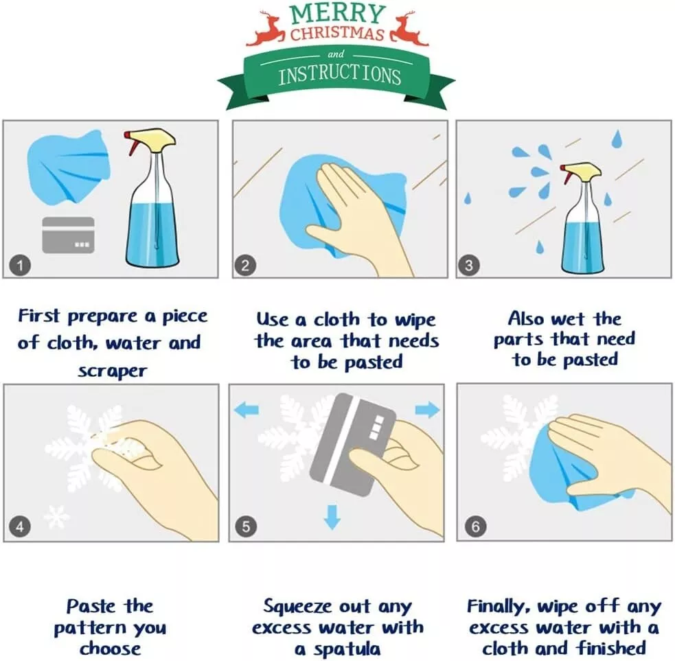 82PCS Christmas Snowflake Window Clings Stickers for Glass, Decals Decoration About this item Packing Include: 5 sheets Christmas style window clings, 1sheet Santa Claus, 1sheet moose, 1sheet snowman 1sheet child and 1sheet snow , total 82 pcs, and each clings size is 7.9"x11.5". Quality Christmas Window Stickers: These Christmas stickers are made of PVC materials. They could stick to window or smooth surfaces with water for a long time and don't fall off easily. Double-Side Christmas Window Clings: These window clings have Double-Side patterns, the means that you can see him when you stick them on the window, no matter indoor or outdoor. Easy To Stick And Remove: There is no adhesive for Christmas window stickers, you just need to clean the surface and stick the window stickers on with water. Of course, you can easily take it off without leaving a trace. Perfect Holiday Decorations: The package contains lots of different styles pattern, which can add the festive atmosphere and make your Christmas party memorable.