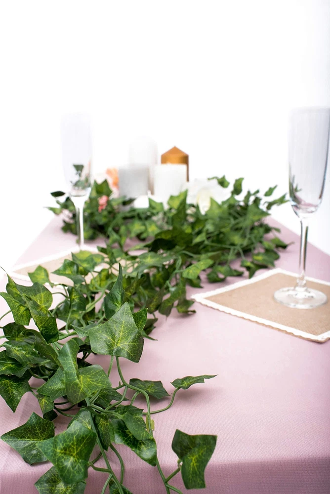 QUALITY artificial ivy garlands for wedding party decor - ivy table runner, backdrop or ballon arch INDOOR OUTDOOR USE. Christmas and Halloween faux decoration plants vines. Poison Ivy cosplay costume Fake leaves greenery decor. Plant wall decor - Green leaves room decor. Wall vines for bedroom Green Color. Looks lifelike, made from Plastic and Silk. Rain Resistant. Leaf vines room decor Will last longer than we will - looking good year after year and the deer will not eat them 😃