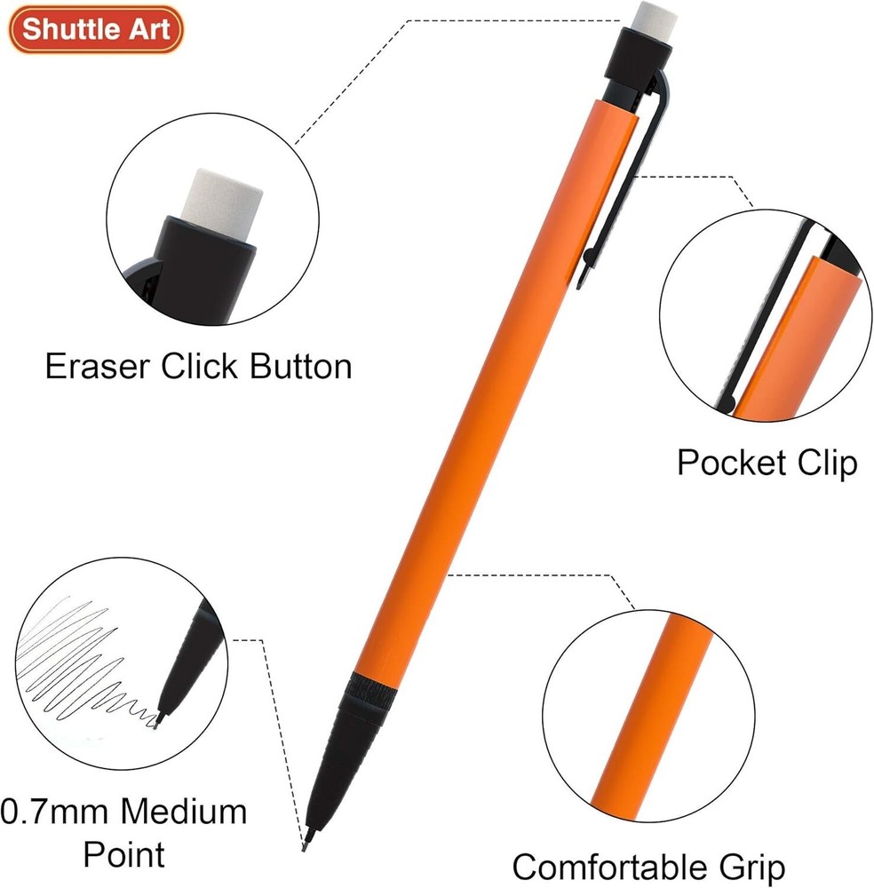 Bulk Mechanical Pencils 84 Pack 0.7mm HB #2 Assorted Colors for School Office Number of Items:84 Writing Instrument Form: Mechanical Graphite Pencil Color: Black Ink Color: Black Age Range (Description): Kids, Teens & Adults 84 PACK VALUE SET: Shuttle Art 0.7mm Mechanical Pencils bulk set comes with 84 pack HB #2 mechanical pencils in 6 different barrel colors (14 pack of each color), perfect for daily writing and drawing at home, school and office ALWAYS READY TO USE: Pre-loaded with pencil lead, you can start writing at any time without the trouble of sharpening, ideal for testing, sketching, writhing on notebooks, journals, papers, etc SMOOTH WRITING & BREAK RESISTANT: High quality pencil leads are sturdy enough for long time writing. They goes smoothly and clearly on papers without smudging or smearing, and are break resistant even you press hard, quite suitable for kids and students. Conforms to ASTM-D4236, non-toxic and acid-free, safe for kids and adults END ERASER COME IN HANDY : Each lead pencil comes with an end eraser on the click button, with gentle rub, you can erase pencil marks easily and cleanly, and it’s durable enough for normal use Return Policy: We offer a 30 day return policy from the receiving date. Please contact us for a Free Return Label. Please use our return label so it will go back to our supplier and we can do a refund or replacement afterwards. Feedback: Your satisfaction is very important to us! If you have any problem with your order, please contact us and we will do our very best to make you satisfied. As long as you are happy with your purchase, please leave a positive feedback for us. We will always leave you a positive feedback in return. If you have any problem with your purchase, please do not leave a negative feedback. Please Contact us ... and your issue will be solved quickly and positively We are a small family-owned business trying to make a living, not a huge company that does not care ... We will ALWAYS do our best for you!