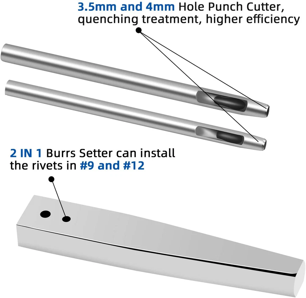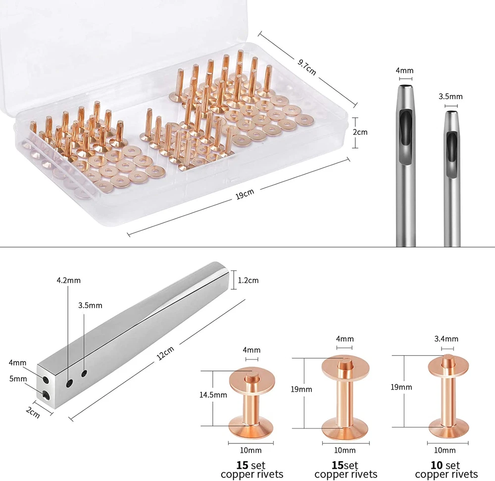 [Unbelievable! 40 Set Solid Copper Rivets and Burrs for Leather] Totally 40 rivets and burrs set: 15 x copper rivets and burrs(11mm x 4mm x 19 mm), 15 x copper rivets and burrs(11mm x 4mm x 14.5 mm), 10 x copper rivets and burrs(10mm x 3.4mm x 19 mm), 1 x 2 IN 1 rivet and burr setter is used for both size 9 and size 12 burrs rivet. 2 x leather hole punch cutters(Dia. 3.5mm and Dia. 4mm). [Stunning Size 9 and Size 12 Copper Rivet Fastener Install Setting Tool and Extra Dia. 3.5mm and Dia. 4mm Precision Round Leather Hole Punch] 2 IN 1 Stainless steel heavy duty setter, one tool can install the rivets in No. 9 Size, No. 12 Size. Bigger convenient and higher efficient. Size: 4.7"x 0.79" x 0.43"(L x W x H); 2Pcs Heavy-duty permanent round hollow hole punch cutters, quenching treatment, more rigid and durable. [In Less Than Few Mintues, Make A Nice Finished Rivet, Enjoyed The Happiness Brought By Leather Craftsmanship] Whether you are a hobbyist of leather crafts or a professional, it is worth having the copper rivets kit, which is EASY to operate and QUICK to install. Don't worry about installation failure. [More Quantity & It Is Far More Cost-effective, 40 Set, 2 Lengths, 2 Sizes Copper Rivets for Leather] 40 x Rivet and burr set, more quantity than the other market ones. Two lengths in 19mm and 14.5mm, two sizes in tube diameter 4mm and 3.3mm, and the most commonly used copper color, perfectly meet your daily needs, and bring you more fun with leather crafts. [Large Range Of Applications, This Exquisitely Leather Craft Kit Is Not To Be Missed] Good rivet tool set bring you more happiness. Leather tools for art manual crafts, leather repairs, rivets for leather, jeans, keychain, bag, strap, purse, belts, wallets, collars, shoes, boat canvas and so on. Really nice leather working kit. Product Description JUNESunShine Copper Rivet and Burr with 2 IN 1 Stainless Steel Burr Setter, Round Punch Cutters Ideal for: leather DIY, leather crafts, leather repair, tack repairs. Great for embellishment or strength, leather reinforcement. Use on: leather belts, halters, bridles, purses, handbag, backpacks, bags, bracelets, leather-crafting, leather ornaments, canvas and so on. What is the reason for choosing JUNESunShine copper rivets w/ setter? SAVE: Luxury matching, 40 sets of copper rivets, 1pc heavy duty 2 IN 1 stainless steel burr setter, 2pcs leather hole punch cutters. Large quantity, high cost performance. NO WORRY: We have specially matched the materials needed for red copper rivet installation. Customers only need to prepare the hammer and rivet plier. No need to spend extra time shopping for accessories. EASY: Very simple installation method. There are pictures of installation instructions on the product list. Please take a few minutes to browse it. QUICK: Within a few minutes, customers can quickly install rivets. Please: The copper rivet and burr setter kit is specially matched by JUNESunShine, and it takes time for manual sorting and packing. The red copper color is bright. When people concentrate on 2 to 4 hours of sorting and packing work, the eyes may be a little tired; If you receive the copper rivets and find a defect or any problem, please e-mail us, we will provide the good solution; What's in the package? 15 set copper rivet and burr (Shaft: 5/32"(4mm). Length: 3/4"(19mm). Head cap: 11mm); 15 set copper rivet and burr (Shaft: 5/32"(4mm). Length: 9/16"(14.5mm). Head cap: 11mm); 15 set copper rivet and burr (Shaft: 0.13"(3.4mm). Length: 3/4"(19mm). Head cap: 10mm); 1pc #9 and #12 stainless steel burr setter; 1pc hollow punch (Dia. 3.5mm); 1pc hollow punch (Dia. 4mm)