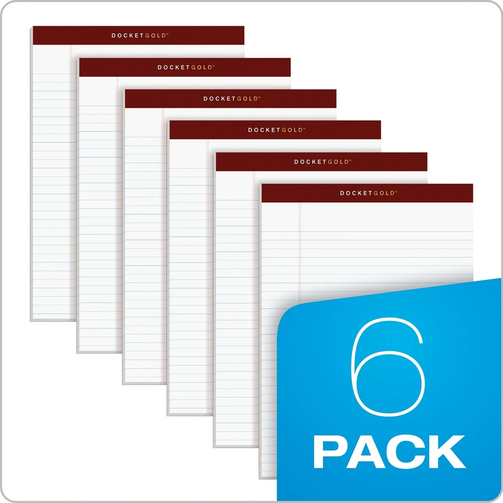 Docket Gold legal pads are a step up from your average legal pad. The thicker, higher-quality paper prevents ink bleed through and is smoother than standard paper. The backer is also twice as thick, making it less bendable and easier to write on when you're away from a desk or table. Docket Gold legal pads are made in America—manufactured in Covington, TN. You'll get 6 letter size legal pads, each with 50 sheets of white paper. Each sheet is perforated, so you can always remove it cleanly and start notes on the next page. These legal pads are wide ruled, also known as legal ruled (11/32" spacing between lines) so you can write a little larger. Each legal pad is 8.5 x 11.75 inches overall, and each sheet tears out to letter size (8.5 x 11 inches). The front of the page and the back of the page are the same. These Docket Gold writing pads are a professional choice for meeting notes, general notes, legal notes, and more. Stock up on a 6 pack of 8.5 x 11 legal pads; each white legal pad has 50 perforated, wide ruled sheets Docket Gold is a premium brand of legal pads; the chipboard back is thicker than your standard legal pad and the paper is a heavier weight to prevent write-though These legal pads are proudly made in the USA; all Docket Gold professional writing pads are manufactured in Tennessee The overall dimension of each pad is 8.5" x 11.75"; each perforated sheet tears off to letter size (8.5" x 11"); pages are wide rule for larger, more legible writing The premium paper and extra-sturdy backer is ideal for a professional environment; from legal notes to meeting notes, these Docket Gold legal pads are above the standard