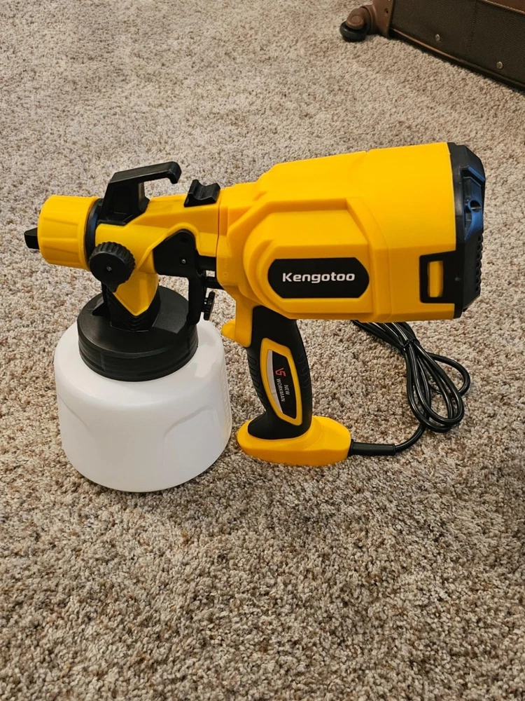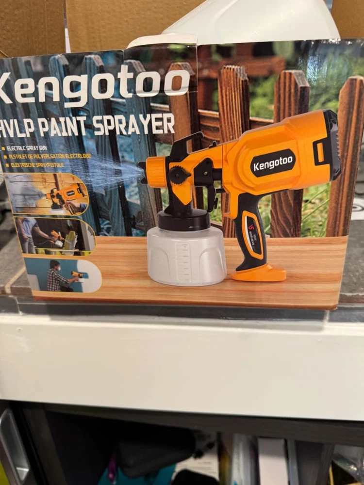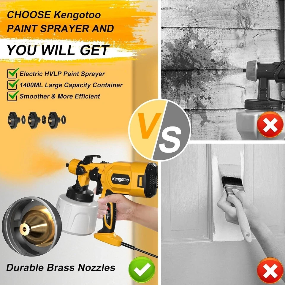 BETTER THAN A BRUSH - The Kengotoo HVLP Paint Sprayer is an easy to use electric paint sprayer that gives a smooth finish with no brush marks. It's the best paint sprayer option for painting furniture, cabinets, walls, fences and more 4 NOZZLES & 3 SPRAY PATTERNS - 850W paint sprayer equipped with 4 sizes of nozzles (1.0mm, 1.2mm, 1.8mm, 2.5mm) for most painting projects such as furniture, walls, doors, garden tables and chairs etc. Can be set to 3 different spray patterns: horizontal, vertical and circular, so it can be used for a wide range of applications CONVEBIENT DUST BLOWING FUNCTION - Before spraying the project, you can use the dust blower on the sprayer to blow away any dust or debris on the surface of the sprayed project. Clean the surface of the spray project and you will get better spray results EASY TO USE & CLEAN - The paint sprayer requires no tools and is easy to assemble, making it suitable for beginners. It comes with instructions for use. The inclusion of a cleaning brush and needle ensures efficient removal of hardened paint residue from the nozzle. Remember to clean the sprayer thoroughly after each use ADJUST FLOW CONTROL - The amount of paint output can be controlled by adjusting the flow control knob to suit a wide variety of projects. According to different spray effect requirements, proper control of paint flow can achieve better effect and avoid paint waste ADVANCED TECHNOLOGY & DESIGN - The 850W HVLP Paint Sprayer comes with a large 1400ml container that is more efficient. The maximum viscosity has been upgraded to 100 Din-s, and the spraying effect is also greatly improved, resulting in a smooth and superior finish WHAT YOU WILL GET - 1X Paint Sprayer, 4X Size Copper Nozzles, 5 X Paint Filters, 1X Viscosity Cup , 1X Cleaning Needle, 1X Cleaning Brush, 1X Gasket, 1X Filter, 1X User Manual. If you have any questions, please contact us via your order, you will get a reply in 12 hours, our after-sales team are always behind you
