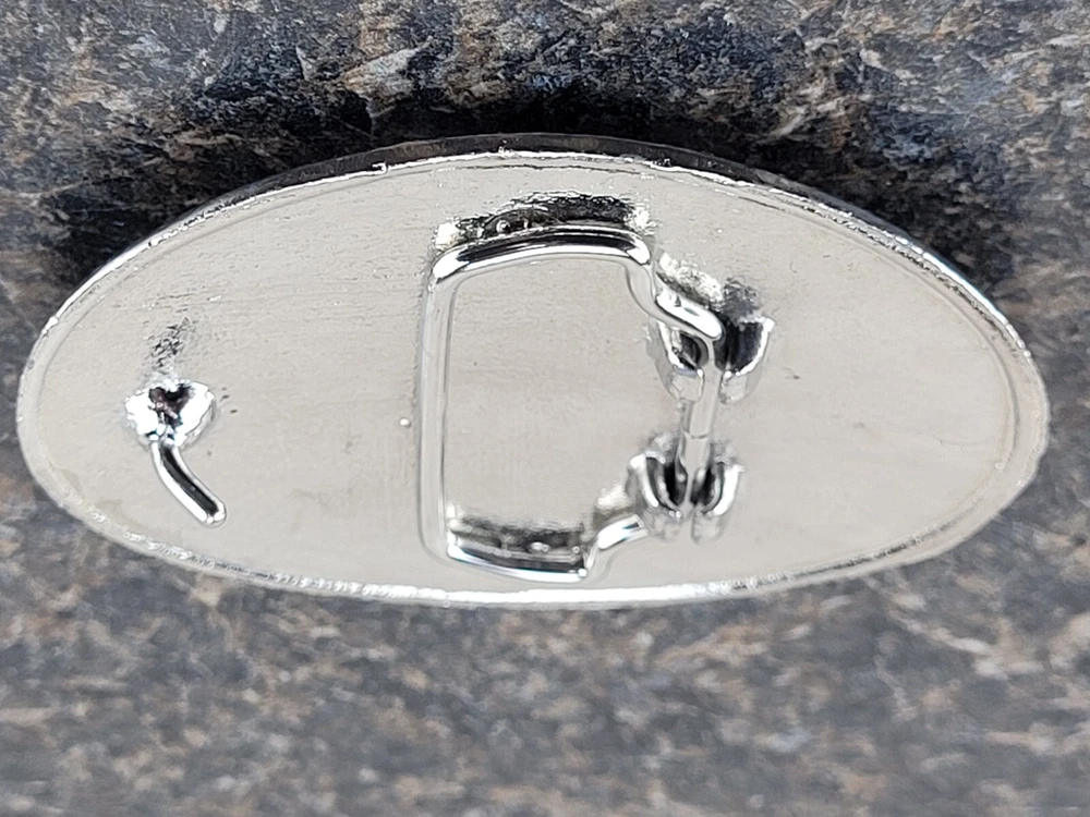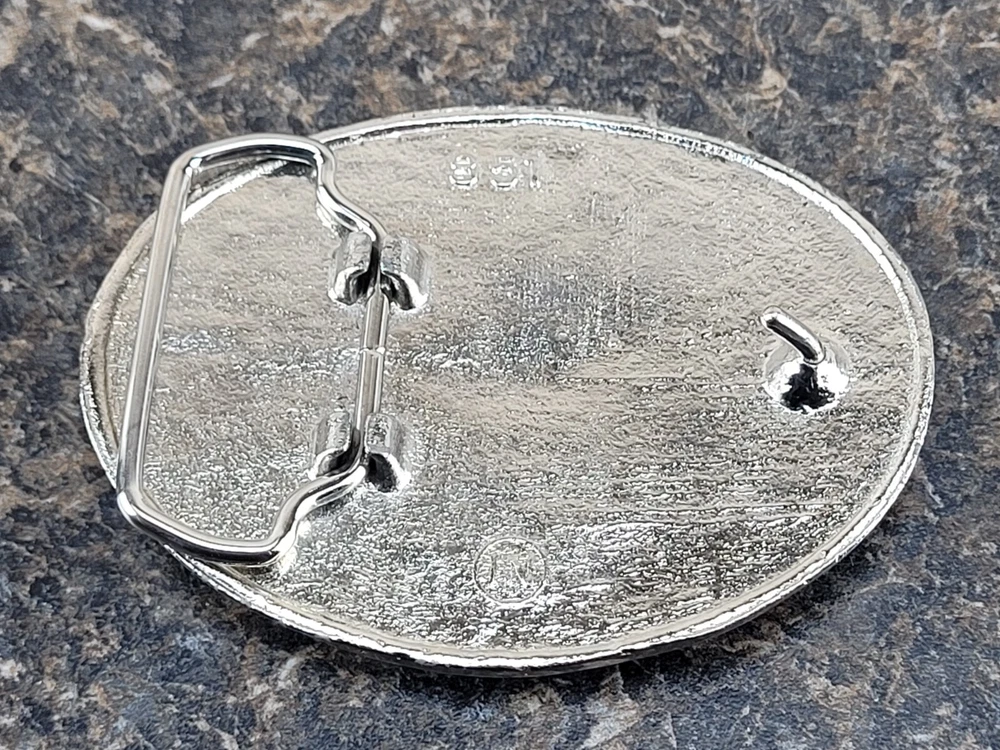 This belt buckle is approximately 9 cm x 6.5 cm.