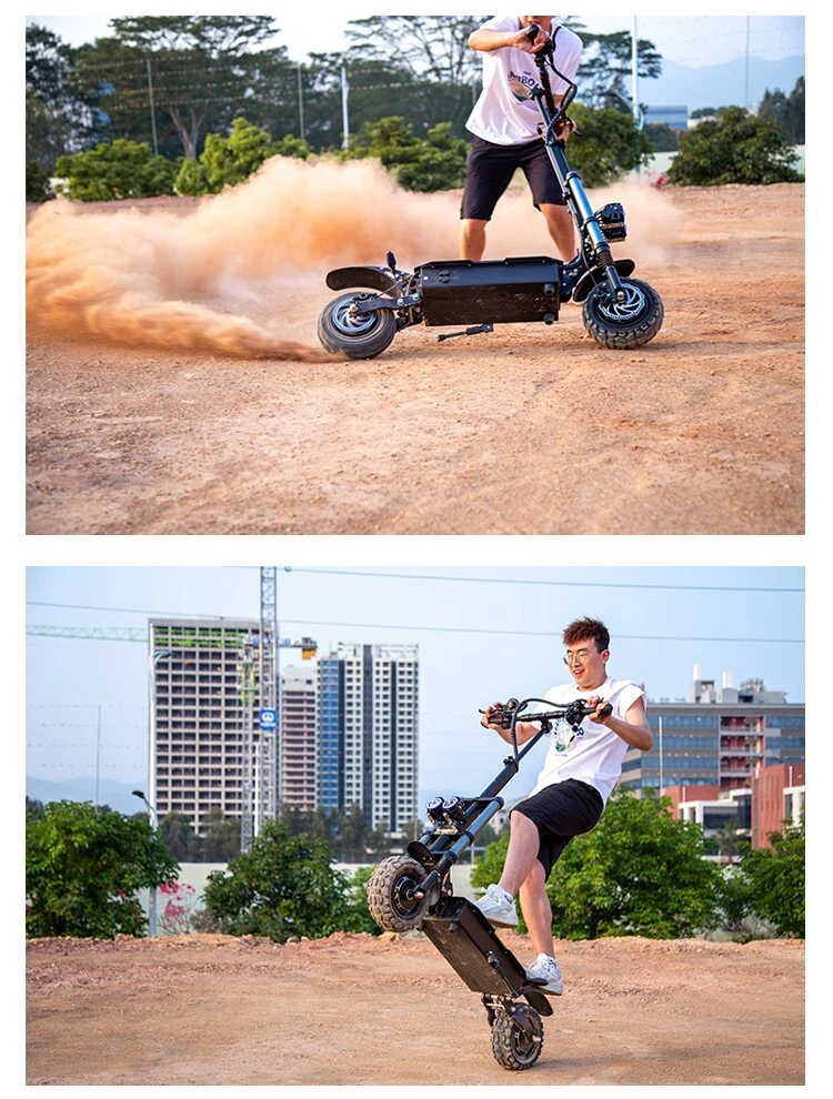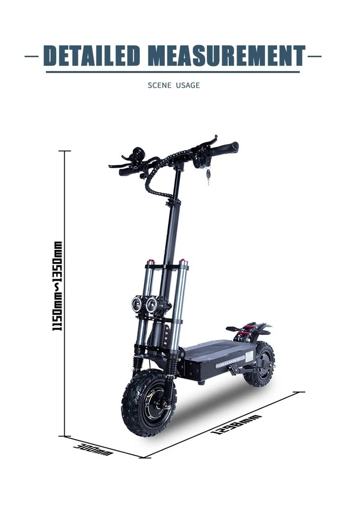 This electric scooter is a beast! The dual 6000W motors deliver insane 85km/h speed, and the 11" off-road tires handle rough terrain smoothly. With a 100km range, hydraulic suspension, and double disc brakes, it's powerful yet safe. The bright lights and IPX5 rating make it great for any condition. Perfect for thrill-seekers who want speed and durability!