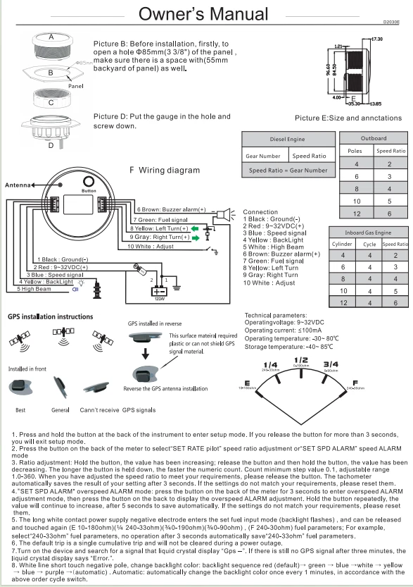 85MM 3 IN 1 Gauge GPS Speedometer 0-200MPH Tachometer Fuel Gauge For Car Boat 85mm 3 IN 1 Gauge GPS Speedometer 200MPH with Tacho 0-8000RPM Fuel Level Gauge Features: Fit for Car/Truck/ Boat/Diesel Generator Engine/Gasoline Engine Waterproof:IP 67 Excellent anti-fogging function; 316 Stainless steel bezel with curved glass; Convenient Installation by multi-plug socket connecting way; With curved glass( with anti-fog function). 7.colors baclight for your choose (red (default)→green→blue→white→yellow→cyan→Purple→(automatic)),customers can adjust any color that you like. Specification: Size:85mm GPS Speedometer:0-200KM/H Tachometer:0-8000RPM Fuel level:0-190ohms,240-33ohms,10-180ohms,0-90ohms(Can be adjusted) Working voltage:9-32VDC Working current:<100mA Working temperature:-30-80℃ Storage temperature:-40-85℃ Backlight :7 Color backlight Color:Black&Silver Pack age Included: 1 x 85mm 3 IN 1 Multifunctional Gauge 1 x Cable 1 x Installation Instruction