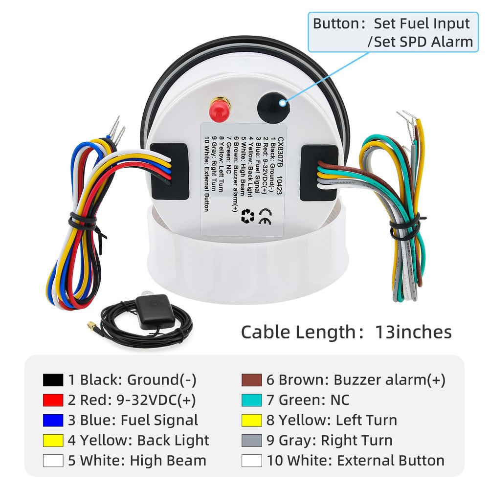 85MM 3IN 1 Car Boat GPS Speedometer 120MPH Fuel Level Gauge Voltage 7 Colors LED 85mm 3 in 1 Gauge GPS Speedometer 0-120MPH Fuel Level Gauge Voltage for Marine Boat Features: Fit for Car /Truck/ Boat /Diesel Generator Engine /Gasoline Engine Waterproof:IP 67 Excellent anti-fogging function; 316 Stainless steel bezel with curved glass; Convenient Installation by multi-plug socket connecting way; With curved glass( with anti-fog function). 7 colors baclight for your choose (red (default)→green →blue →white →yellow →cyan →Purple→(automatic)),customers can adjust any color that you like Specification: Size: 85mm GPS Speedometer: 0-120MPH Fuel level: 0-190ohms, 240-33ohms, 10-180ohms, 0-90ohms(Can be adjusted) Voltage: 8-16V Working voltage: 9-32VDC Working current: <100mA Working temperature: -30-80℃ Storage temperature: -40-85℃ Backlight :7 Color backlight Color: Black Connection 1 Black: Ground(-) 2 Red: 9~32vDc(+) 3 Blue: Fuel signal 4 Yellow: BackLight 5 White: High Beam 6 Brown: Buzzer alarm(+) 7 Green: Nc 8 Yellow: Left Turn 9 Gray: Right Turn 10 white: External Button Package Included: 1 x 85mm 3 in 1 Multifunctional Gauge 1 x Cable 1 x Installation Instruction