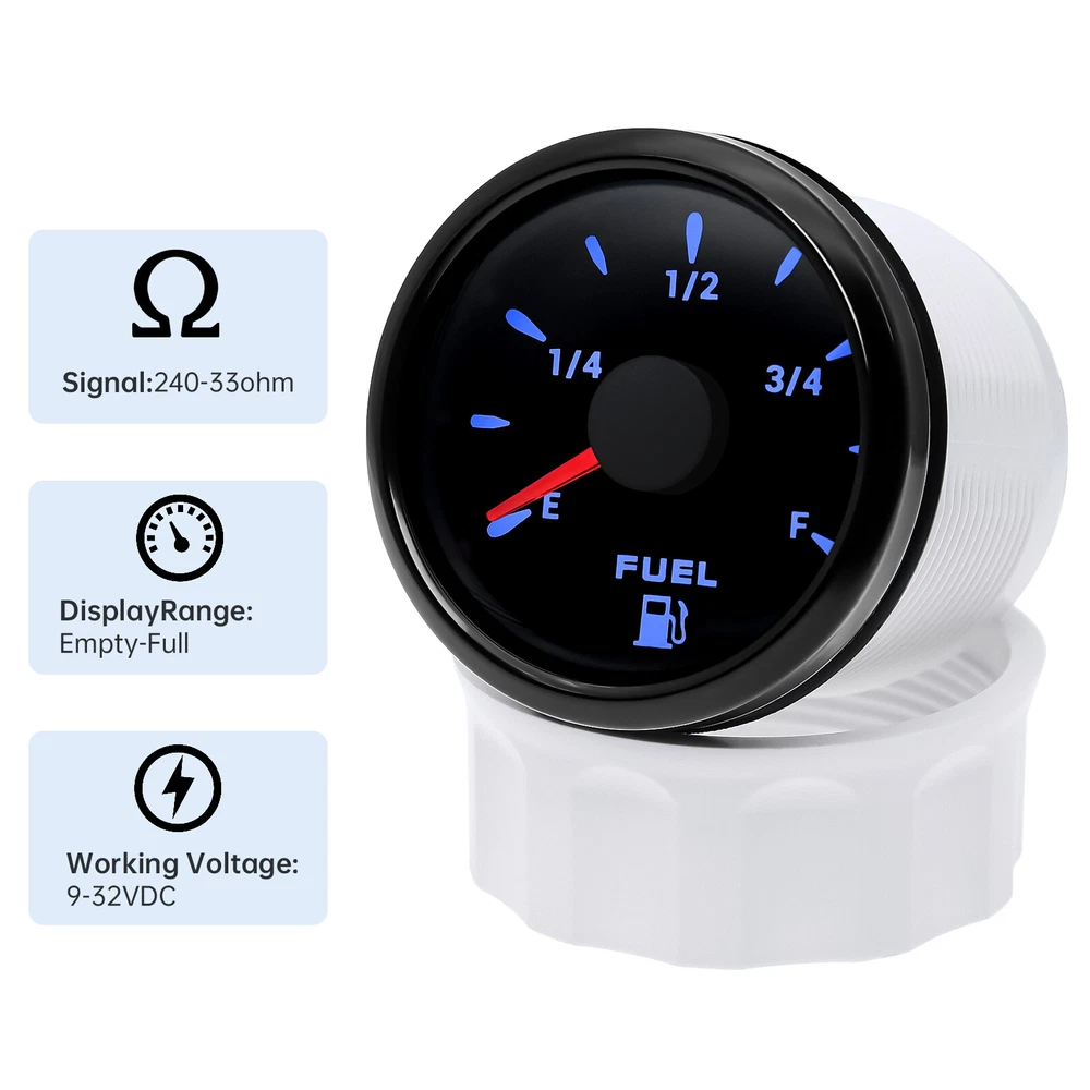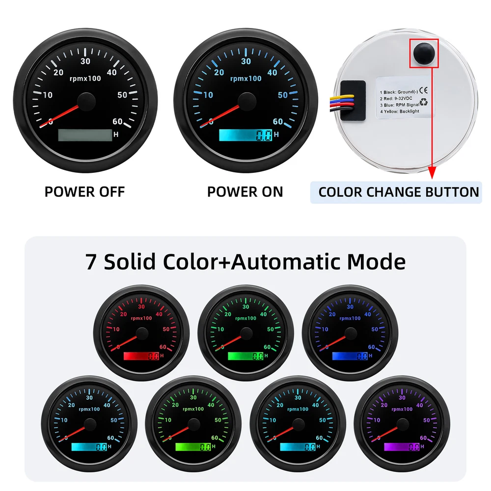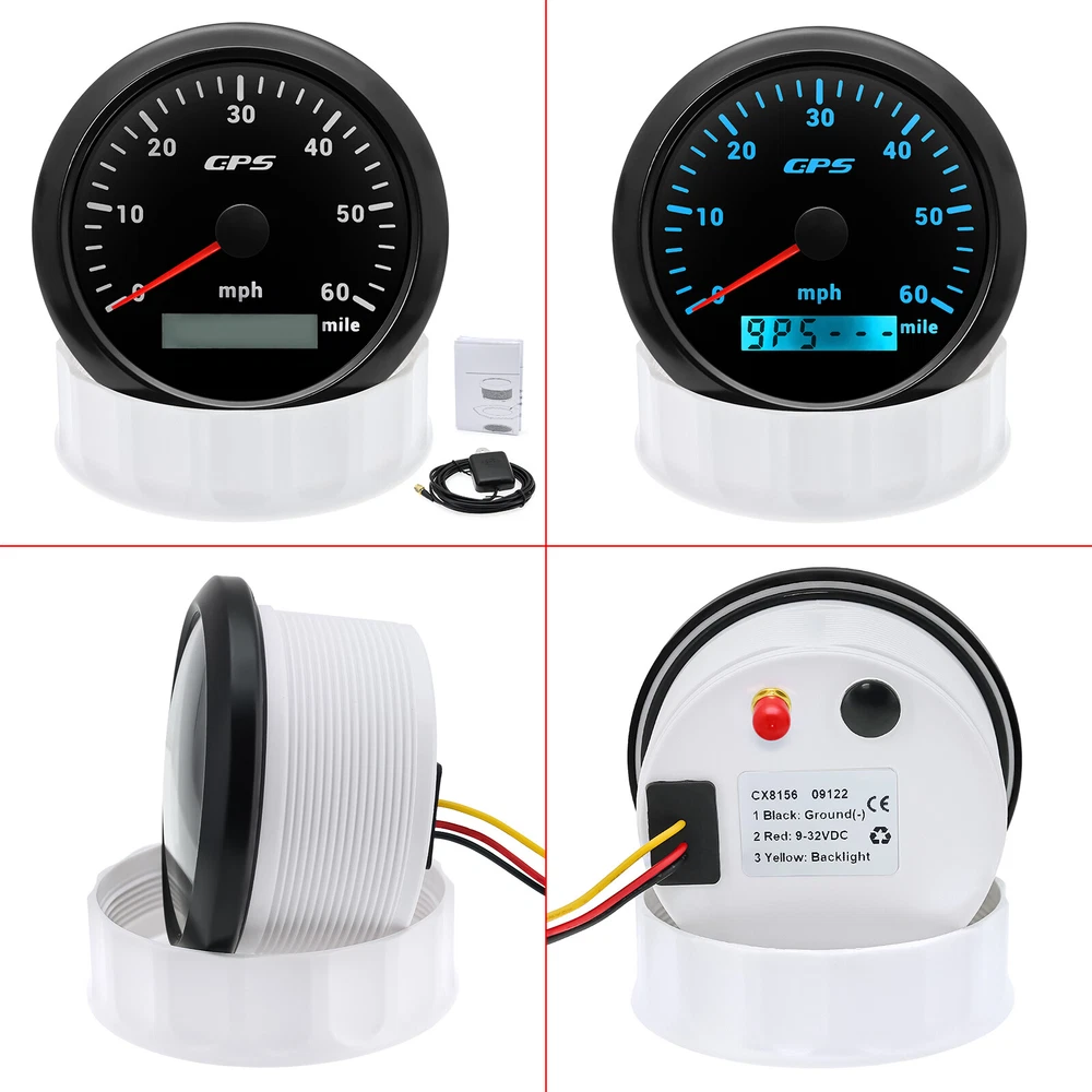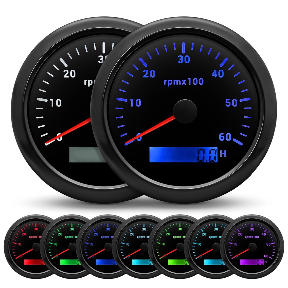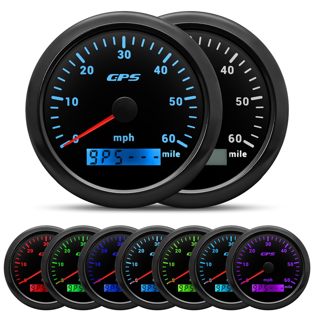 85MM GPS Speedometer 0-60MPH w/Tachometer & 52mm Fuel Water Oil Pressure Voltage 6 Gauge Set 85mm GPS Speedometer 0-60MPH Tachometer & 52mm Fuel Water Temp Oil Press Volt Gauge For Car Boat Feature: High-brightness LED backlight. 316 stainless steel for long-term use even in acid-base, humid environment. IP67 waterproof and dust-proof grade. With curved glass( with anti-fog function). Suitable for all kinds of vehicle modification. Using stepper motor drive pointer, accurate display of the engine speed, and with the LCD display clear display mileage. Gauges have many kinds backlight color (red,yellow,orange,green,blue,purple,white),customers can adjust any color that you like. GPS Speedometer Gauge Install Diameter: Φ85mm or 3-3/8" Signal: GPS Working Voltage: 9~32V DC Size: 12x8x12cm / 4.72x3.1x4.75 inch Indication Range: 0-60MPH Backlight:7 Colors Backlight Tachometer Install Diameter: Φ85mm or 3-3/8" Engine hours: 0.0-99999.9H Backlight :7 Color backlight Indicating Range: 0~6000 RPM Signal: Pulse For Tachometer, you can substitute for different unit, please contact us before / after purchase or note on the order. Tachometer: 0-3000rpm/0-4000RPM/6000RPM/7000RPM/8000RPM Fuel Level Gauge Sizes: 52 mm (2-1/16") Measuring Range: Empty - Full Resistance: 240 (E) - 33 (F) ohms Backlight: 7 Colors Water Temperature Gauge Install diameter: Φ52mm Indication range: 0~120℃/30-250℉ Input signal: 287.4~22.4 ohms Storage temperature: -40~+85℃ Backlight: 7 Colors Oil Pressure Gauge Install diameter:Φ52mm or 2-1/16" Indication range:0~10bar / 0-150 PSI Input signal: 10-184 ohms Operating temperature:-30~+75℃ Storage temperature:-40~+85℃ Backlight: 7 Colors Volt Gauge Sizes: 52 mm (2-1/16") Measuring Range: 8 - 16 (V) Backlight: 7 Colors Package Includes: 1X 85MM Digital GPS Speedometer Gauge 1X GPS Antenna 1X 85MM Tachometer 1X 52MM Fuel level gauge 1X 52MM Voltmeter 1X 52MM Water temp gauge 1X 52MM Oil Pressure gauge 6X Installation Instruction