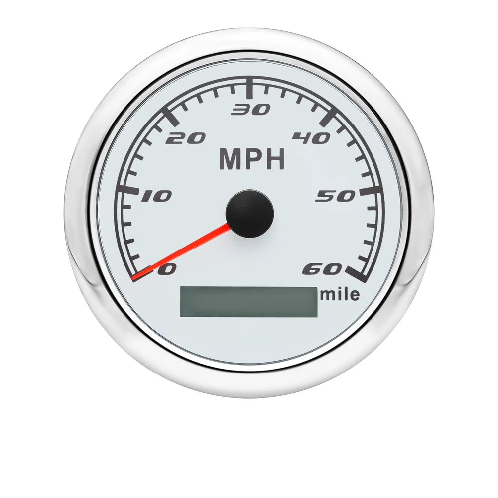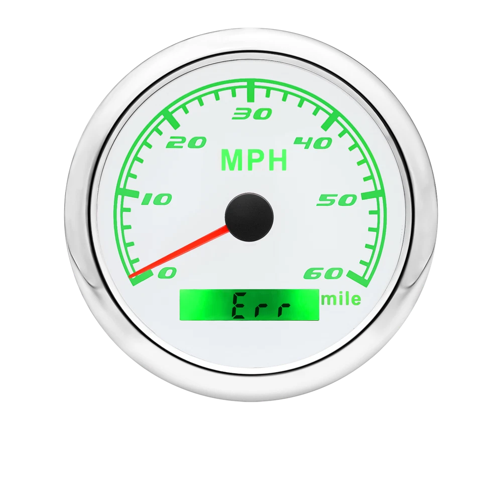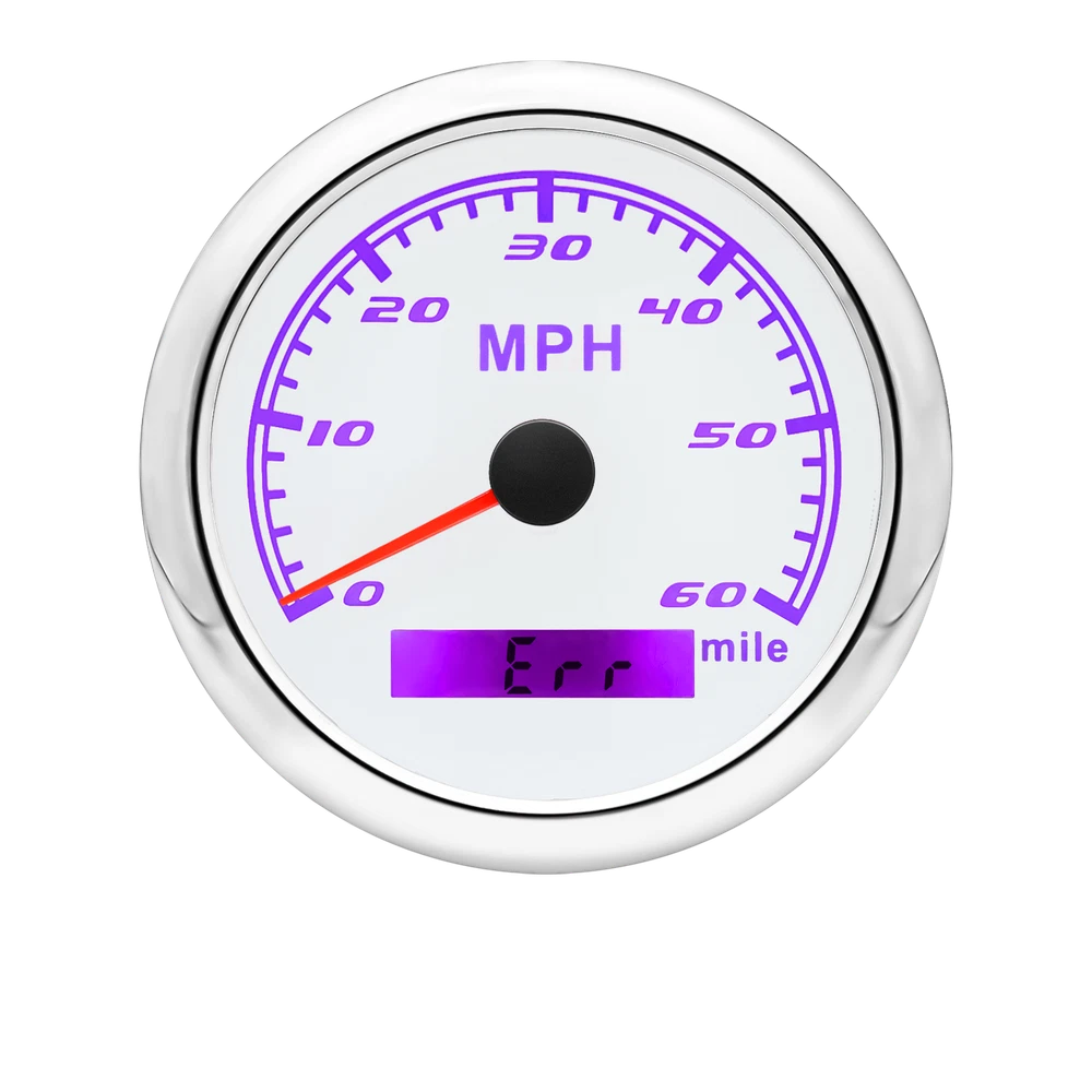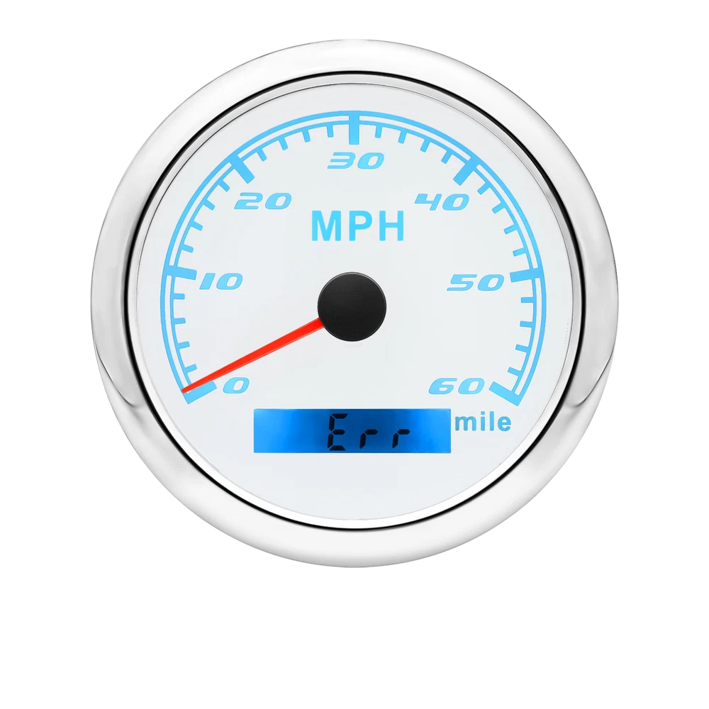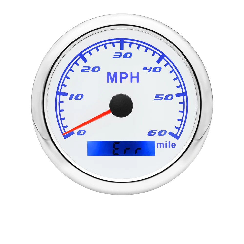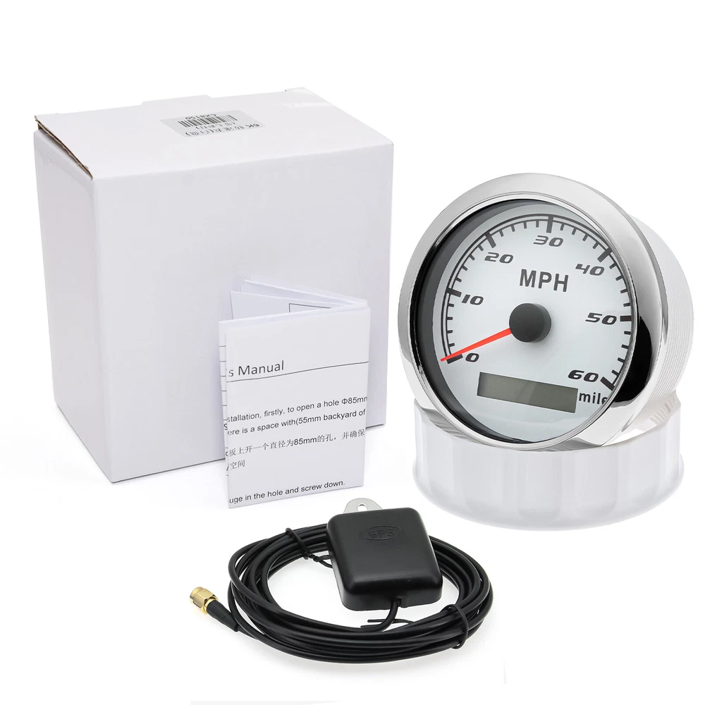 85MM GPS Speedometer 0-60MPH Odometer Gauge For Boat Car Truck ATV Motorcycle 85mm GPS Speedometer Gauge Odometer 0-60MPH 7 Colors LED for Car Boat Motorcycle Specifications: Dial: White Material: Stainless Steel 316L Bezel + Anti-fog Glass Install Diameter: Φ85mm or 3-3/8" Signal: GPS Working Voltage: 9~32V DC Working Current: ≤100mA Operating Temperature: -30℃ ~ 75℃ Storage Temperature: -40℃ ~ 85℃ Size: 12x8x12cm / 4.72x3.1x4.75 inch IP67 waterproof and dustproof grade Indication Range: 0-60 MPH Backlight:7 Colors Backligt Product Descriptions High-brightness LED backlight. 316 stainless steel for long-term use even in acid-base, humid environment. IP67 waterproof and dust-proof grade. With curved glass( with anti-fog function). Suitable for all kinds of vehicle modification. Using stepper motor drive pointer, accurate display of the engine speed, and with the LCD display clear display mileage. Gauges have many kinds backlight color (red,yellow,orange,green,blue,purple,white),customers can adjust any color that you like. Package Includes: 1X 85MM Digital GPS Speedometer Gauge 1X Instruction 1X GPS Antenna