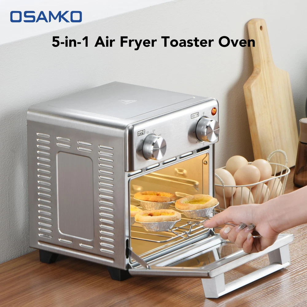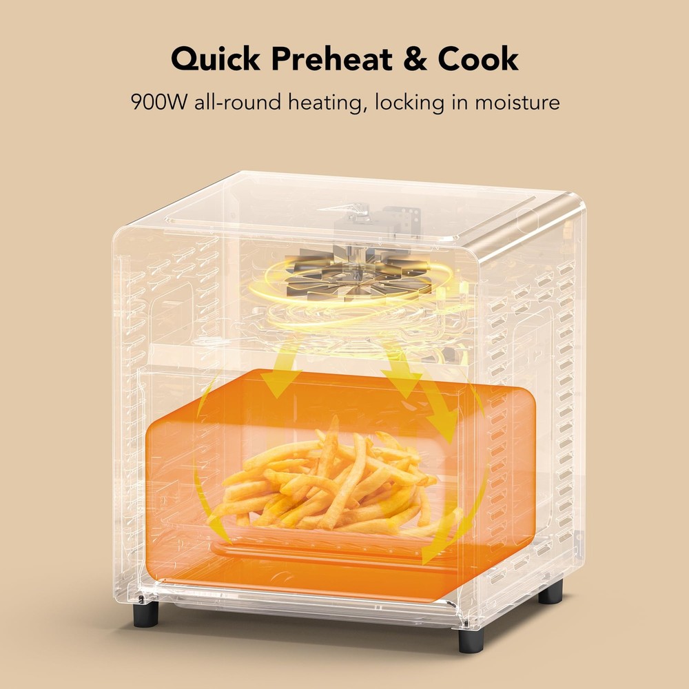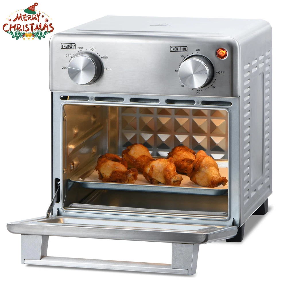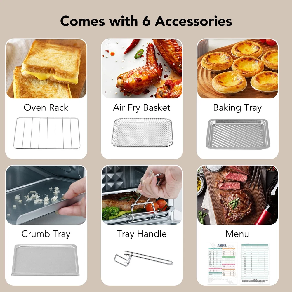 Multi - Purpose Cooking for Every Lifestyle:This horno eléctrico pequeño is a cooking powerhouse designed for diverse needs. Whether you're a single traveler, living in a small space, or a family preparing a feast, it combines air frying, baking, grilling, roasting, and heating functions. Now you can effortlessly make everything from crispy fries for a solo snack, juicy chicken for family dinner, to baked cookies for camping treats. It provides a full range of cooking solutions for every occasion. Ultra - Fast Preheating & Cooking:Save precious time with our airfryer toaster oven combo. It slashes preheating time by 75% and boosts cooking speed by 30%. Whether you're in a rush during a busy morning in your small kitchen, or eager to enjoy a quick meal in your hotel room during travel, the reduced waiting time makes cooking a breeze, allowing you more time to relax and savor your food. Healthy & Tasty Cooking:Embrace a healthier lifestyle without sacrificing flavor. With all - round fast heat circulation technology and a powerful fan, this appliance reduces fat and oil in your food by 75% while maintaining its delicious crispy texture. From air - fried chicken wings to low - fat baked goods, you can enjoy guilt - free, mouthwatering meals that are good for you and your family. Precise Temperature Control for Perfect Results:The air fryer oven combo offers maximum temperature up to 450℉, with a 60 - minute time setting range. This precision ensures that whether you're baking a perfect batch of cookies in your compact kitchen, grilling steaks for a family gathering, or making delicate egg rolls during a camping trip, you can set the optimal cooking temperature and time for any recipe. Convenient Observation Window:Designed with a large transparent window, this air fryer toaster oven allows you to keep an eye on your food without opening the door, preserving heat and preventing uneven cooking. Whether you're cooking in a hotel room, your small office kitchen, or out in the camping trailer, easily monitor the progress of your meal to ensure the perfect cooking effect every time. Perfect for Small Spaces & Solo Cooks: Ideal for singles, couples, or small kitchens, this 8.5L air fryer oven fits comfortably on countertops without crowding. Its compact design delivers full functionality without sacrificing precious space—great for apartments, dorms, RVs, or as a secondary oven. versatile 5-in-1 Cooking Functions: Air fry, bake, toast, broil, and roast with convection—all in one appliance. Enjoy crispy fries, golden toast, roasted veggies, or baked goods with adjustable temperature control and a 60-minute timer for precision cooking every time. Healthy Low-Oil Frying Technology: Get crispy, delicious results using little to no oil. Our rapid air circulation technology evenly cooks food while reducing fat content—perfect for health-conscious users who refuse to compromise on taste. Stainless Steel Build + Easy Cleaning: Crafted in sleek stainless steel with a clear-view glass door, this oven resists stains and wipes clean effortlessly. No more sticky surfaces or hard-to-reach corners—maintenance is quick and simple. Fast Preheating & Even Heating: Skip the wait—our oven preheats rapidly and cooks food faster than conventional ovens. Whether you’re reheating leftovers or preparing a fresh meal, enjoy consistent results without hot spots or cold zones.