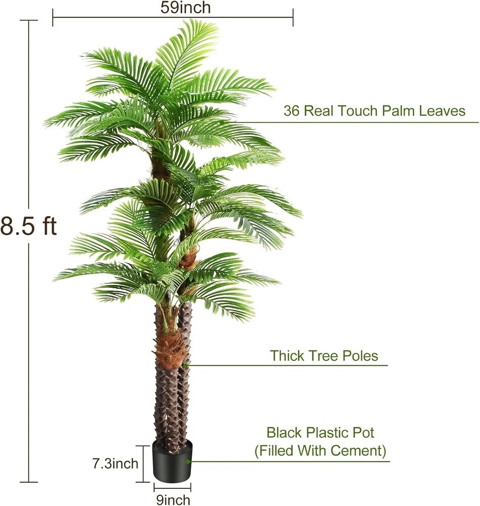 8.5ft Tall Artificial Palm Tree for Outdoors - Triple Phoenix Palm, UV Resistant, Large Fake Silk Palm Tree - Perfect for Patio, Poolside, Home Indoor Aesthetic Decor Product Details Color: Triple Phoenix Palm Size: 8ft 6in Brand: Keeplush MPN: YZS3 UPC: Does not apply EAN: Does not apply Brand: Keeplush Product Dimensions: 60"D x 60"W x 102"H Color: Triple Phoenix Palm Material: Plastic Item Package Quantity: 1 Recommended Uses For Product: Outdoor, Indoor Occasion: Easter, Housewarming, Anniversary, Thanksgiving, Valentine's Day Special Feature: Adjustable leaves and branches, Environment-friendly and odor-free materials, All seasons are green Seasons: All Seasons Tree Type: Palm Brand: Keeplush Product Dimensions: 60"D x 60"W x 102"H Color: Triple Phoenix Palm Material: Plastic Item Package Quantity: 1 Recommended Uses For Product: Outdoor, Indoor Occasion: Easter, Housewarming, Anniversary, Thanksgiving, Valentine's Day Special Feature: Adjustable leaves and branches, Environment-friendly and odor-free materials, All seasons are green Seasons: All Seasons Tree Type: Palm Base Type: Pot Plant or Animal Product Type: Palm Built-in Light: No Light Color: Green Included Components: Brand Brochure, 9 Inch Black Plastic Pot, 8.5ft Tall Artificial Palm Tree, Quick Use Guide Package Information: Pot Number of Items: 1 Manufacturer: Keeplush Item Weight: 35.9 pounds Item model number: YZS3 Date First Available: December 16, 2022 This 8.5 feet majestic triple tropical palm faux tree has 36 large vivid palm fronds filled with countless arching feather-like leaves with realistic palm texture, three thick dragon-scaled trunks are awe-inspiring, it looks so lush and great, it will create a tropical paradise atmosphere for you and those around you, now this extra tall triple palm tree is waiting to dance in the warm tropical breezes This lifelike large artificial palm tree will create a sunny beach summer atmosphere wherever you place it, providing your coastal decor with an authentic look, no need for watering and pruning, looks full and fresh every day, it is the perfect decoration for indoor & outside, big house, office, outsides patio, farmhouse, porch, balcony, entrance, fireplace, doorway, stairway, green garden, yard, dining room, living room, bedroom, modern aesthetic decor, etc To achieve the intended appearance of natural palm tree, it need to be assembled and re-shaped when removed from the box, all the palm branches are outfitted with adjustable sturdy metal wires, they are of good quality and strong enough so that you can bend it with confidence, it is nestled inside a 9" non-decorative black plastic pot for versatile appeal, so we suggest you tuck it into the bigger and more beautiful planter pot of your choice so it fits right into your ensemble Overall Product Dimensions: 60"D x 60"W x 102"H; Black Planter Pot Dimensions: 9"D x 9"W x 7.3"H; Measurements calculated from each furthest outstretched dimension (It depends on how much you bend the palm branches), the black pot is made of heavy solid cement which to prevent children, pets knock it down,these three thick trunks are very strong enough to hang led light strings or decorative pendantss, easily create a more welcoming evening atmosphere To achieve the best look, make sure to buy a good quality faux palm tree that is worth your money. Many different options are realistic and sturdy enough to last for years. Find the best artificial plant that suits your style and place it in your home Shipping We offer FREE shipping on all orders! We ship within Three business days of payment, usually sooner. We use a selection of shipping services such as UPS, FedEx, USPS etc. We only ship to the lower 48 states, no APO/FPO addresses or PO Boxes allowed. Local pickups and combined shipping options are not provided at this time. Return You can return a product for up to 30 days from the date you purchased it. Any product you return must be in the same condition you received it and in the original packaging. Please keep the receipt. Payment We accept payment by any of the following methods: PayPal Please pay as soon as possible after winning an auction, as that will allow us to post your item to you sooner! Feedback Customer satisfaction is very important to us. If you have any problem with your order, please contact us and we will do our best to make you satisfied. Contact Us If you have any queries, please contact us via ebay. We usually respond within 24 hours on weekdays. Please visit our eBay store to check out other items for sale! Thank you for shopping at our store. Disclaimer We are working with different suppliers in USA to deliver the item to your doorstep. If you have any issues regarding the item, Feel free to ask.