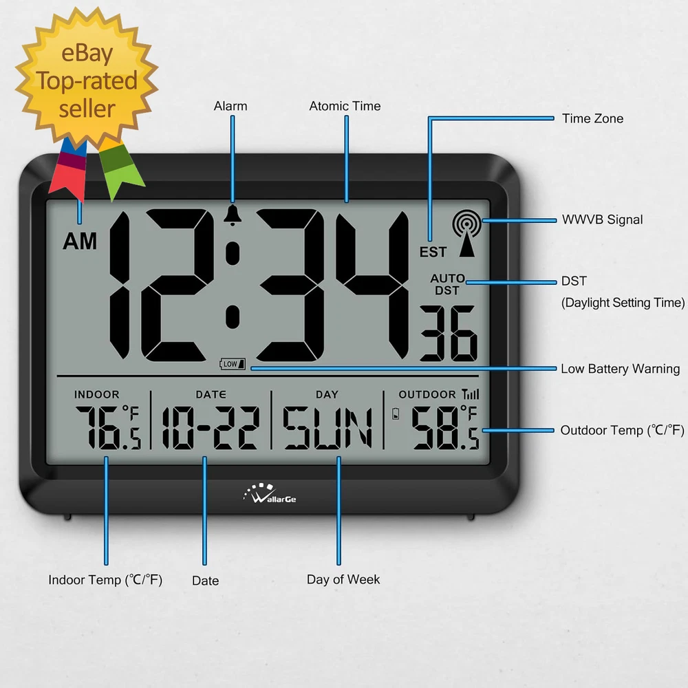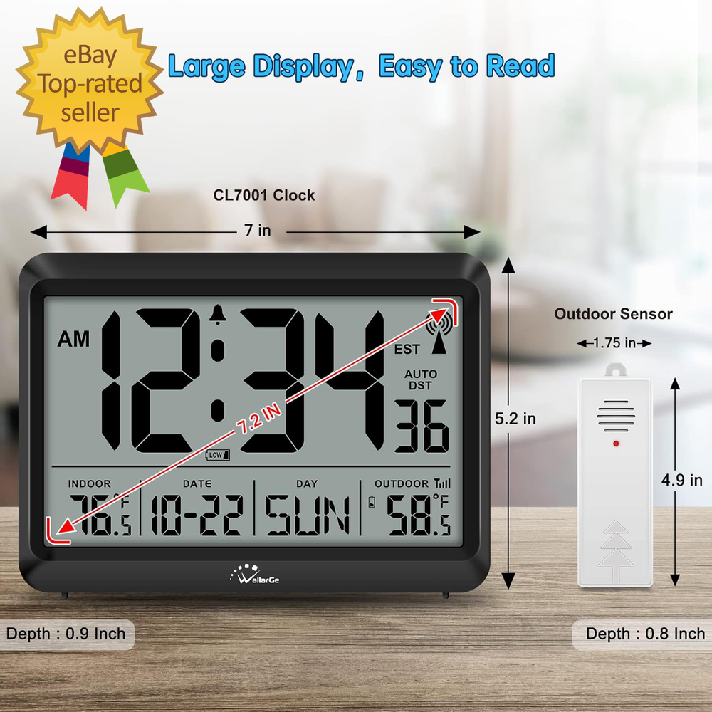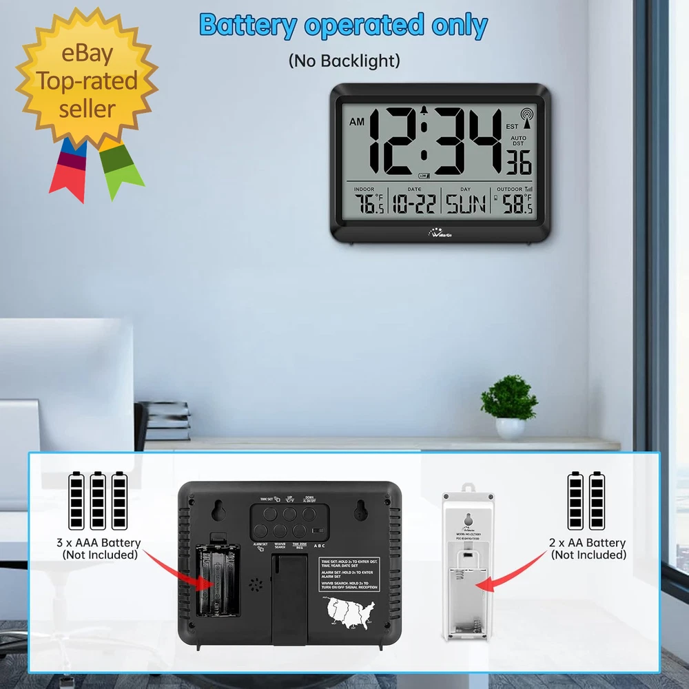 Store New Arrivals Add to Favorite View Feedback Contact Atomic Clock with Indoor Outdoor Temperature - 8.5'' Digital Clock Battery Opera Description Style Modern Are Batteries Included No Power Source Battery Powered Color Carbon Black Sensor Technology RF Product Dimensions 7 x 1.5 x 5.2 inches Display Type Digital Country of Origin China Shape Rectangular Item Weight 16 ounces Connectivity Technology RF Temperature Accuracy 1 ยฐC Upper Temperature Rating 158 Degrees Fahrenheit Included Components Battery Special Feature function(f) {var _np=(window.P._namespace("DetailPageProductOverviewTemplatesJava"));if(_np.guardFatal){_np.guardFatal(f)(_np);}else{f(_np);}}(function(P) { P.when('A').execute(function(A){ A.on('a:truncate:po-attribute-truncate-2:updated', function(data) { var isTruncated = !data.truncateInstance.getIfTextFits(); var seeMoreElement = document.getElementById('po-attribute-see-more-id-2'); if(seeMoreElement) { seeMoreElement.style.display = isTruncated ? '' : 'none'; } }) }); })); Cordless, Atomic Clock, Indoor Outdoor Temperature Display, Date, Day of the Week, Seconds, Time Zone, Auto DST, Wall Clock, Desk Clock See more ๐—”๐—ฐ๐—ฐ๐˜‚๐—ฟ๐—ฎ๐˜๐—ฒ ๐—”๐˜๐—ผ๐—บ๐—ถ๐—ฐ ๐—–๐—น๐—ผ๐—ฐ๐—ธ - The atomic clock has a built-in receiver that automatically synchronizes itself with the WWVB radio broadcast, which will update time automatically every midnight to ensure accurate time. It has 4 time zones: EST, CST, MST, PST. ๐—”๐˜๐—ผ๐—บ๐—ถ๐—ฐ ๐—–๐—น๐—ผ๐—ฐ๐—ธ ๐˜„๐—ถ๐˜๐—ต ๐—œ๐—ป๐—ฑ๐—ผ๐—ผ๐—ฟ ๐—ฎ๐—ป๐—ฑ ๐—ข๐˜‚๐˜๐—ฑ๐—ผ๐—ผ๐—ฟ ๐—ง๐—ฒ๐—บ๐—ฝ๐—ฒ๐—ฟ๐—ฎ๐˜๐˜‚๐—ฟ๐—ฒ - This atomic clock can display both indoor and outdoor temperature, helps you better manage your daily life. The wireless outdoor sensor monitors and transmits the outdoor temperature to the clock to display. The sensor should be placed within 330 feet and out of direct sunlight or rain. ๐——๐—ถ๐—ด๐—ถ๐˜๐—ฎ๐—น ๐—–๐—น๐—ผ๐—ฐ๐—ธ ๐—•๐—ฎ๐˜๐˜๐—ฒ๐—ฟ๐˜† ๐—ข๐—ฝ๐—ฒ๐—ฟ๐—ฎ๐˜๐—ฒ๐—ฑ (๐—ก๐—ผ ๐—•๐—ฎ๐—ฐ๐—ธ๐—น๐—ถ๐—ด๐—ต๐˜) - Both the digital clock and outdoor sensor are supported by non-rechargeable batteries: 3xAAA for clock and 2xAA for outdoor sensor. (Batteries are not included). When batteries of clock or sensor are running low, there would be a low battery symbol appearing on screen and blinking, reminding you to replace new batteries in time. ๐——๐—ถ๐—ด๐—ถ๐˜๐—ฎ๐—น ๐—”๐—น๐—ฎ๐—ฟ๐—บ ๐—–๐—น๐—ผ๐—ฐ๐—ธ ๐˜„๐—ถ๐˜๐—ต ๐—”๐—จ๐—ง๐—ข ๐——๐—ฆ๐—ง - When alarm or DST is set on, there would be a corresponding icon staying on screen. Both of them could be turned off manually if for no need. With DST on, clock will go forward or fall back one hour automatically in daylight saving time. ๐—Ÿ๐—ฎ๐—ฟ๐—ด๐—ฒ ๐——๐—ถ๐˜€๐—ฝ๐—น๐—ฎ๐˜† ๐˜„๐—ถ๐˜๐—ต ๐—ง๐—ฒ๐—บ๐—ฝ๐—ฒ๐—ฟ๐—ฎ๐˜๐˜‚๐—ฟ๐—ฒ, ๐——๐—ฎ๐˜† ๐—ฎ๐—ป๐—ฑ ๐——๐—ฎ๐˜๐—ฒ - The clock shows time with seconds in big bold in the middle of screen, help you read the time easily and quickly. It also displays indoor temp/outdoor temp/day/date on bottom, provides a full information you need on clock. ๐Ÿญ๐Ÿฎ/๐Ÿฎ๐Ÿฐ๐—›๐—ฟ ๐—ง๐—ถ๐—บ๐—ฒ ๐— ๐—ผ๐—ฑ๐—ฒ ๐—ฎ๐—ป๐—ฑ ๐—™๐—ฎ๐—ต๐—ฟ๐—ฒ๐—ป๐—ต๐—ฒ๐—ถ๐˜/๐——๐—ฒ๐—ด๐—ฟ๐—ฒ๐—ฒ ๐—ฆ๐˜„๐—ถ๐˜๐—ฐ๐—ต๐—ฎ๐—ฏ๐—น๐—ฒ - This atomic clock has two display modes (standard time and time). When clock time is set for one mode, the alarm time would be followed same automatically. Also, the temperature display could be exchanged from Fahrenheit to Degree by clicking the button on back. Product Description Get Started Quickly 1. Adjust the outdoor temperature link channel of clock and outdoor sensor to be same๏ผŒlike A-A, B-B, C-C. 2. Install batteries (3xAAA for clock and 2xAA for outdoor sensor) and choose your time zone. 3. Outdoor temperature starts to connect first, once finished, clock starts to search for WWVB signal. 4. Put clock to a place with good signal for better reception and outdoor sensor to a safe place outside within 330feet/100m. 5. Clock updates time automatically when signal received successfully. Tips: In most areas, a signal can only be received at night. If your clock does not receive WWVB signal in daytime, please wait overnight and it will be set in the morning. Outdoor temperature range: -40โ„‰ ~ 158โ„‰ (-40ยฐC to 70ยฐC). Indoor temperature range: 32โ„‰ ~ 122โ„‰ (0ยฐC to 50ยฐC). The outdoor sensor should be placed within 300ft/100m and out of direct sun light or rain. 1 Wall or Desk clock