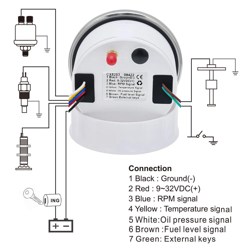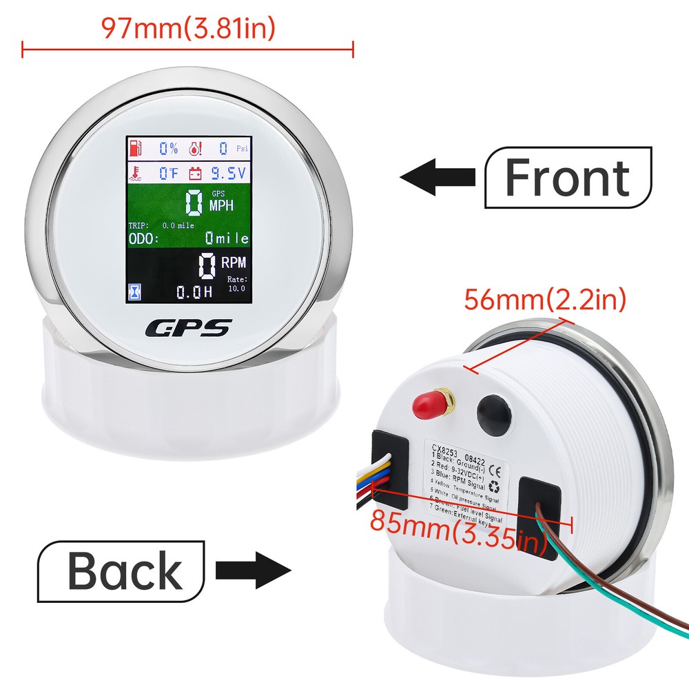 85mm 6 In 1 Boat GPS Speedometer Tachometer Pressure Temp Fuel Gauge With Sender 85MM GPS Speedometer Tachometer Voltage 9-32V Water Temp Fuel Level Oil Pressure 0-10Bar 6 in 1 Multi-functional Digital Gauge with alarm Warmly tips: If any problem after buying, such as some when you install or the parcel received or un-received, please do not open a case and do not hesitate to contact us. We would do our best to give you the best solution. Thank you so much Features: - GPS SOG: Speed Over Ground: 0-600km/h - ODO: odometer: 0-999999km (can be adjusted by the back button.) - TRIP: 0-999.9km (Return Zero When off electricity) - COG: Course Over Ground - Tachometer: 0-9999RPM - Speed Ratio: 1.0-360.0; Step Value: 0.1 - Oil Pressure: 0-10 bar/0-145psi (Pressure sensor: 10-184ohm) (After power on, press the back button to adjust unit, if the oil pressure unit is "psi", the temperature unit will be "℉".) - Water Temperature: 40-120℃/100-250℉ (Temperature sensor: 301-22ohm) (The water temperature is displayed by default. If you need oil temperature, please contact us to customize.) - Voltmeter: 9-32V - Fuel Level: 0-100% (Press the back button to adjust the level signal: 0-190Ω/240-33Ω available.) - Total Engine Hours: 0.0-99999.9H(Press the back button to adjust.) - Sensor Fault Alarm(Chinese and English can be switched) - Degree of Protection: IP67 - Backlight: TFT Screen * Sensor are not provided with this gauge. * Plz. order the sensor separately if you need it. Setting: - Keep on pressing the back button for 3 seconds, and then enter into setting mode, leaving button more than 3 seconds, it will be out of setting mode. - The value will increase when you press the button. When you leave the button and then press it again, the value will decrease. The minimum step value is 0.1 and the adjustable range is 1.0-360.0.(tachometer setting) - When you get the required speed ratio value after adjustment, please leave the button. The tachometers will autoclave your setup after 3 seconds. If the setup doesn't meet your demand, please re-setup. - Must press the button first and power up, can select English or Chinese. Dimensions: - 85mm diameter (3-3/8") - 55mm Depth (2-3/4") Package Included(as picture): - 1X 85mm 6 in 1 Gauge - 1X 1/8NPT Water temp sender - 1X 1/8NPT Oil pressure sender - 1X Multi-plug socket - 1X GPS antenna - 1X Instruction Note: - Please make sure you can Installation,if you need help you can contact your local car repair workshop,Thank you! - Please allow a voltage error of 0.2V, thank you Wholesale and Drop shipping - For wholesale, we will offer the discount or free express shipping which only takes 3-7 days to arrive. - For drop shipping, We could send the goods to your customers directly and won't leave information about us if youd like to.