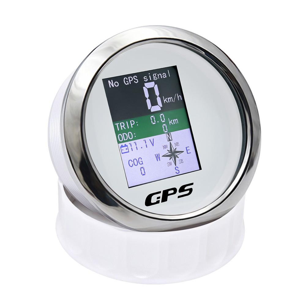 85mm Digital Car Boat GPS Speedometer Odometer Voltmeter Gauge MPH Kmh Knots US 85mm Waterproof Digital GPS Speedometer Odometer Voltmeter for Boat Car Truck US Features: GPS SOG:Speed Over Ground: 0-600km/h ODO: odometer:0-999999km (can be adjusted by the back button.) TRIP: 0-999.9km (Return Zero When off electricity.) COG: Course Over Ground (Orientation Pointer) Battery voltage: 9~32VDC Three unit can be swicthed:knot;mph;km/h Degree of Protection:IP67 Backlight: TFT Screen Input Parameter: GPS signal GPS antenna length 3 meter Dimensions: 85mm diameter (3-3/8") 55mm Depth (2-3/4") Package Included: 1*GPS Speedometer 1*GPS Antenna 1*Multi-plug socket 1*Instruction