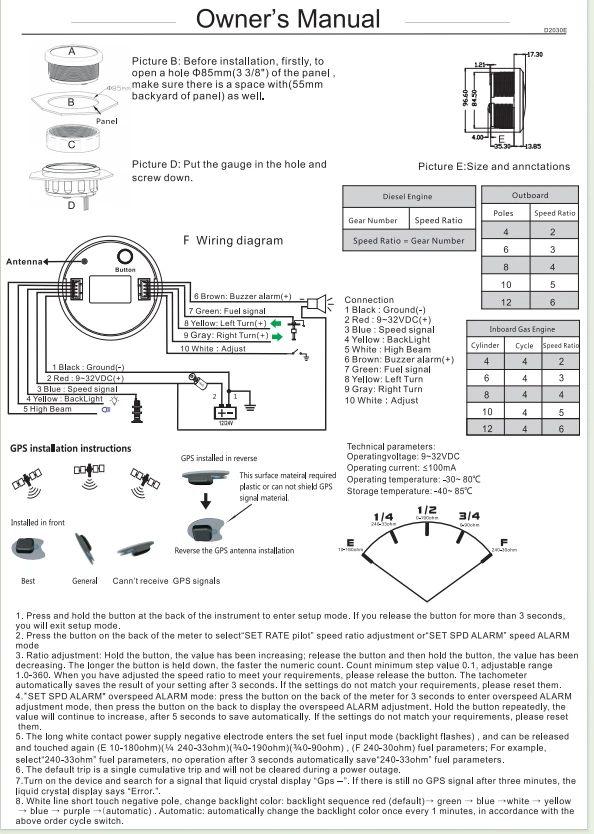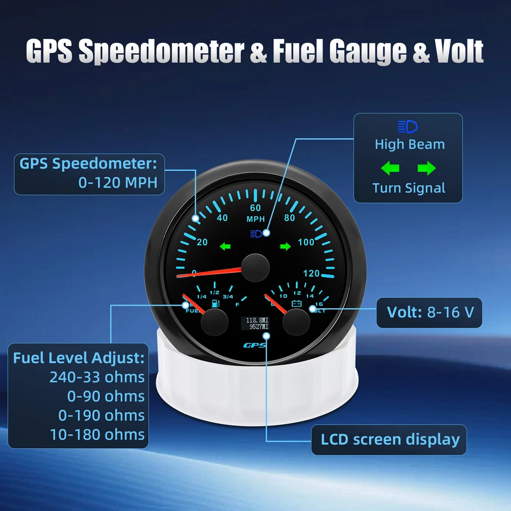 85mm GPS Speedometer 0-120MPH Fuel/Volt/Tacho/Oil Press/Water Temp with Senders 2 Gauge Set With Senders 85mm GPS Speedometer 0-120MPH Fuel Gauge Volt Tachometer 0-8000RPM Water Temp ℉ Oil Press PSI NOTES: The water temperature gauge, Oil pressure gauge does not support desktop testing. It is necessary to connect the SENDING UNITS in order to use it properly. Any helps, please do not hesitate to contact me. Thank you Features: RPM Tachometer Support : Car /Truck/ Boat /Diesel Generator Engine /Gasoline Engine Waterproof:IP67 Excellent anti-fogging function; 316 Stainless steel bezel with curved glass; Convenient Installation by multi-plug socket connecting way; With curved glass( with anti-fog function). 7 colors baclight for your choose (red (default)→green →blue →white →yellow →cyan →Purple→(automatic)),customers can adjust any color that you like Tachometer fit for Car /Truck/ Boat /Diesel Generator Engine /Gasoline Engine GPS Speedometer Specification: Size: 85mm GPS Speedometer: 0-120MPH Fuel level: 0-190ohms, 240-33ohms, 10-180ohms, 0-90ohms(Can be adjusted) Voltage: 8-16V Working voltage: 9-32VDC Working current: <100mA Working temperature: -30-80℃ Storage temperature: -40-85℃ Backlight :7 Color backlight Color: Black Tachometer Specification: Size: 85mm Tachometer: 0-8000RPM Oil pressure: 0-150PSI Water temperature: 100-250℉ Engine hours: 0.0-99999.9H Working voltage: 9-32VDC Working current: <100mA Working temperature: -30-80℃ Storage temperature: -40-85℃ Backlight :7 Color backlight Color: Black Input parameter Oil pressure sensor: 10~184ohms Temperature sensor: 301~22ohms Tachometer Connection 1 Black: Ground(-) 2 Red: 9-32vDC(+) 3 Blue:PRM signal 4 Yellow: Backlight 5 White: Oil pressure signal 6 Brown:Temperature signal 7 Green:Adjust GPS Speedometer Connection 1 Black : Ground(-) 2 Red : 9~32vDc(+) 3 Blue : Fuel signal 4 Yellow : BackLight 5 White : High Beam 6 Brown: Buzzer alarm(+) 7 Green: Nc 8 Yellow: Left Turn 9 Gray: Right Turn 10 white: External Button Package Included: 1 x 85mm 3 in 1 GPS Speedometer 1 x 85mm 3 in 1 Tachometer Gauge 1 x GPS Antenna 1 x 1/8NPT Temp sensor 1 x 1/8NPT Pressure sensor 2 x Cable 2 x Installation Instruction