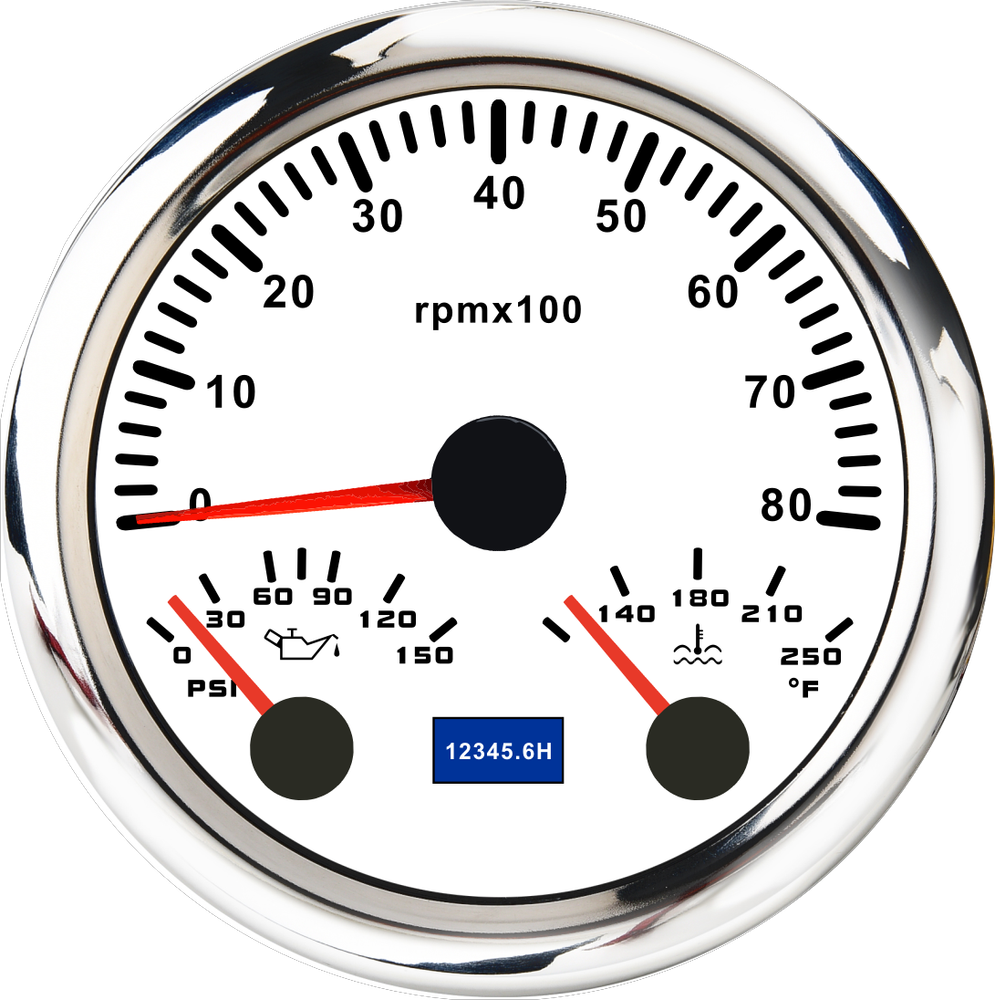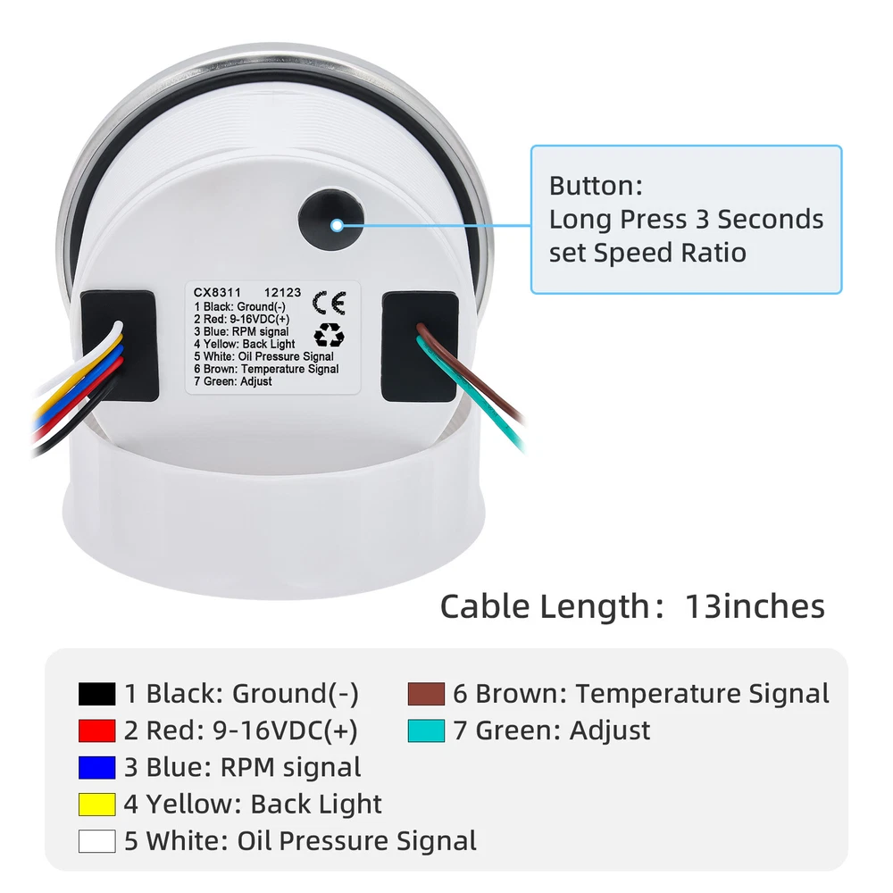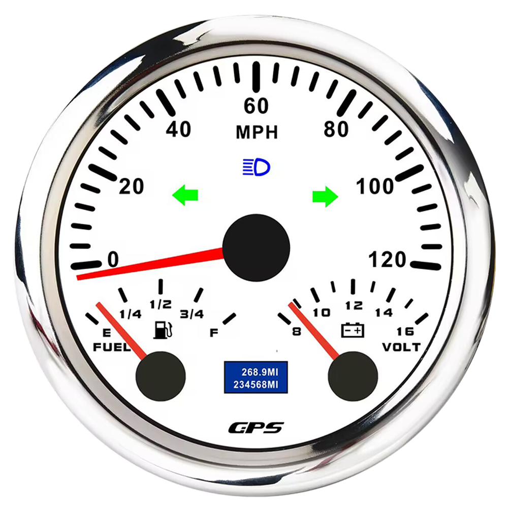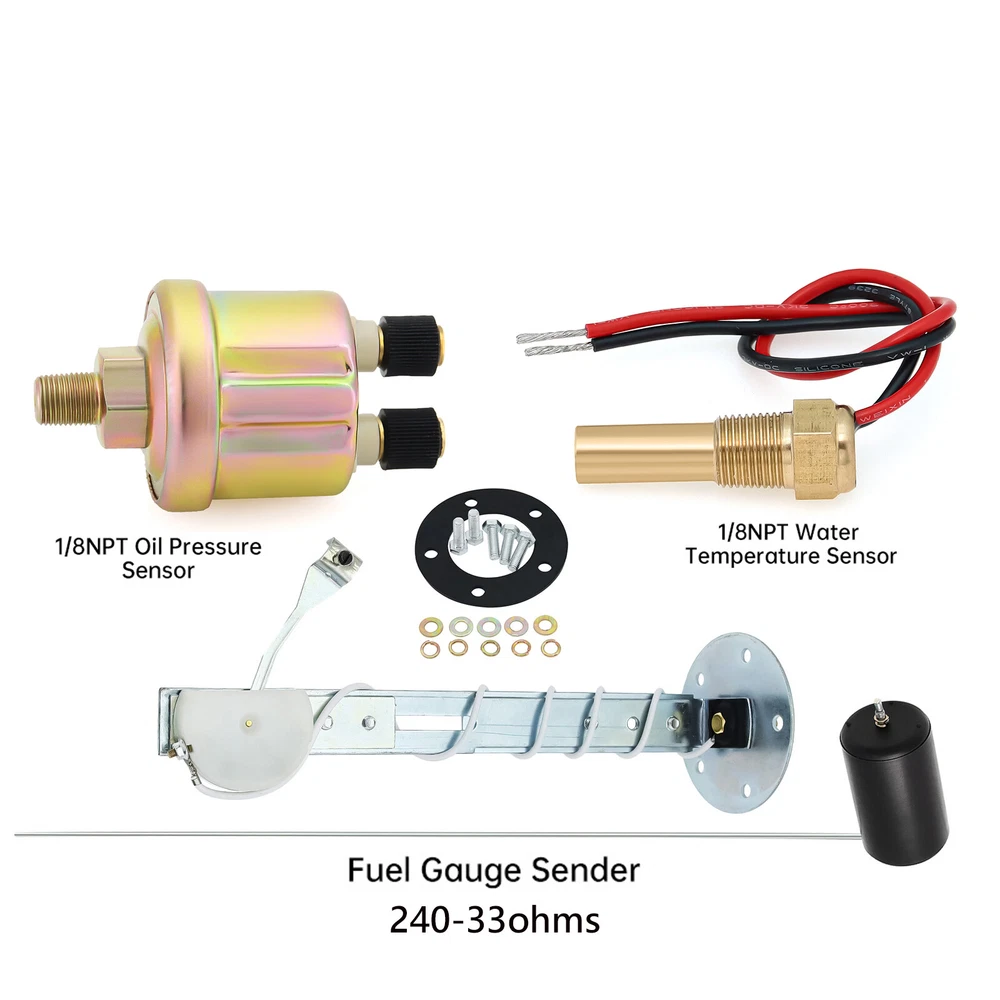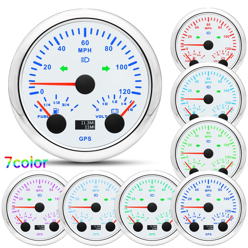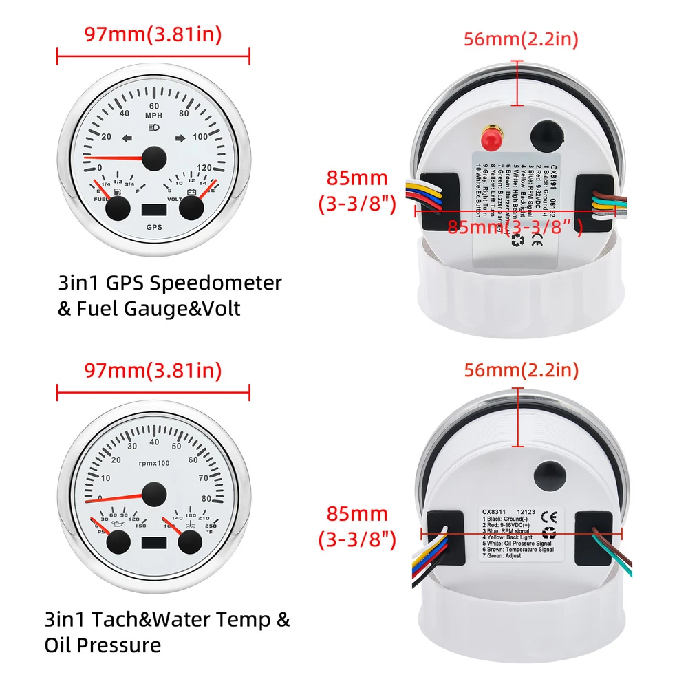 85mm GPS Speedometer 0-120MPH Fuel Gauge/Volt/Tacho/Oil/WaterTemp with Senders 2 Gauge Set With Senders 85mm GPS Speedometer 0-120MPH Fuel Gauge Volt Tachometer 0-8000RPM Water Temp ℉ Oil Press PSI NOTES: The water temperature gauge, Oil pressure gauge does not support desktop testing. It is necessary to connect the SENDING UNITS in order to use it properly. Any helps, please do not hesitate to contact me. Thank you Features: RPM Tachometer Support : Car /Truck/ Boat /Diesel Generator Engine /Gasoline Engine Waterproof:IP67 Excellent anti-fogging function; 316 Stainless steel bezel with curved glass; Convenient Installation by multi-plug socket connecting way; With curved glass( with anti-fog function). 7 colors baclight for your choose (red (default)→green →blue →white →yellow →cyan →Purple→(automatic)),customers can adjust any color that you like Tachometer fit for Car /Truck/ Boat /Diesel Generator Engine /Gasoline Engine GPS Speedometer Specification: Size: 85mm GPS Speedometer: 0-120MPH Fuel level: 0-190ohms, 240-33ohms, 10-180ohms, 0-90ohms(Can be adjusted) Voltage: 8-16V Working voltage: 9-32VDC Working current: <100mA Working temperature: -30-80℃ Storage temperature: -40-85℃ Backlight :7 Color backlight Color: White Tachometer Specification: Size: 85mm Tachometer: 0-8000RPM Oil pressure: 0-150PSI Water temperature: 100-250℉ Engine hours: 0.0-99999.9H Working voltage: 9-32VDC Working current: <100mA Working temperature: -30-80℃ Storage temperature: -40-85℃ Backlight :7 Color backlight Color: White Input parameter Oil pressure sensor: 10~184ohms Temperature sensor: 301~22ohms Tachometer Connection 1 Black: Ground(-) 2 Red: 9-32vDC(+) 3 Blue:PRM signal 4 Yellow: Backlight 5 White: Oil pressure signal 6 Brown:Temperature signal 7 Green:Adjust GPS Speedometer Connection 1 Black : Ground(-) 2 Red : 9~32vDc(+) 3 Blue : Fuel signal 4 Yellow : BackLight 5 White : High Beam 6 Brown: Buzzer alarm(+) 7 Green: Nc 8 Yellow: Left Turn 9 Gray: Right Turn 10 white: External Button Package Included: 1 x 85mm 3 in 1 GPS Speedometer 1 x 85mm 3 in 1 Tachometer Gauge 1 x Fuel level sending units 240-33ohms 1 x 1/8NPT Temp sensor 1 x 1/8NPT Pressure sensor 2 x Cable 2 x Installation Instruction