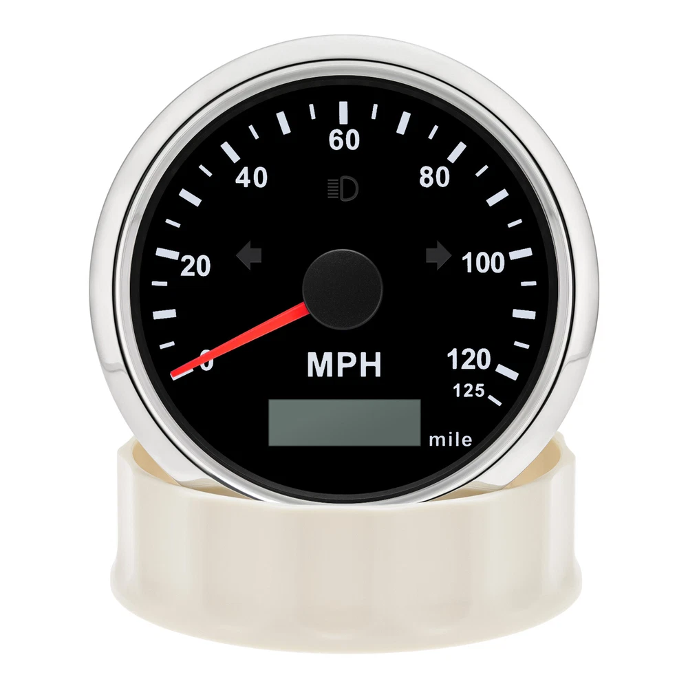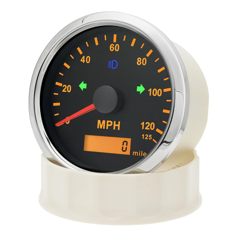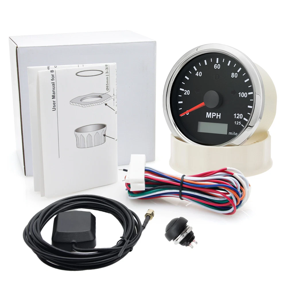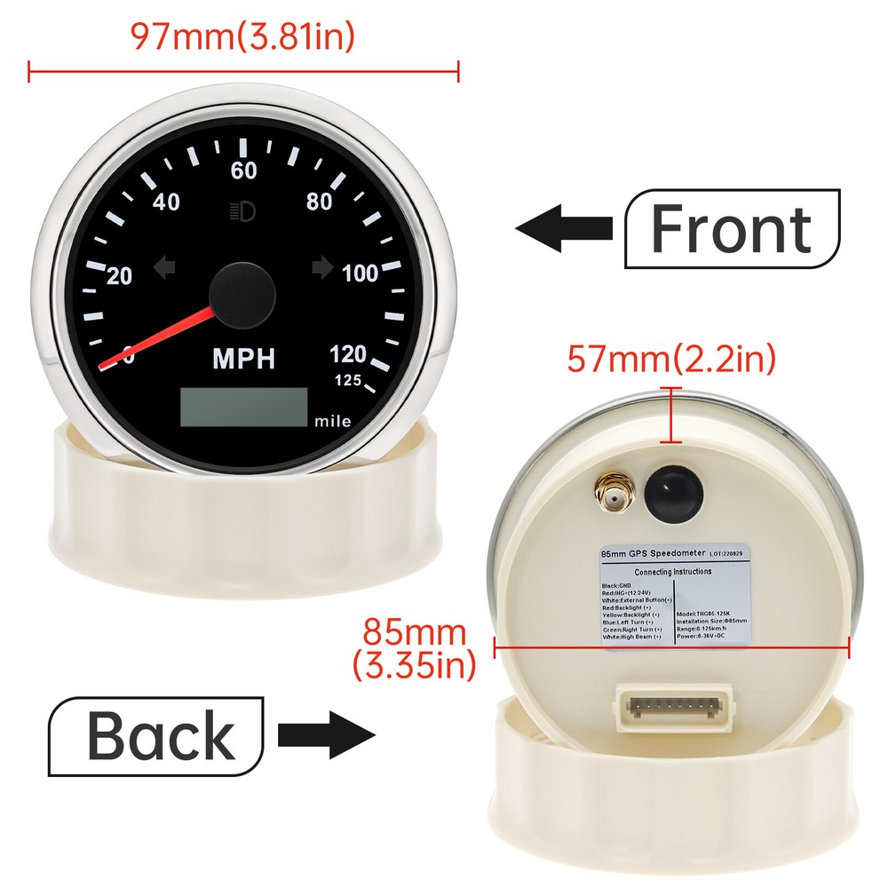 85mm GPS Speedometer 0-125MPH Gauge Turn Signal High Beam For Car Boat Truck 85mm GPS Speedometer 0-125MPH Odometer Gauge With Indicator Light For Boat Car Specifications: Fixing dimension: 85mm(3-3/8") Indicating Range: 0-125MPH Working Voltage: 12V/24V Total Mileage Range: 0-999999 miles GPS Blind Area Odometer Compensation OverSpeed Buzzer Alarm (Value Adjustable) Indication light: LEFT, HIGH BEAM, RIGHT Backlight: Red and Yellow available Working temperatures: - 40 to 85°C Operation mode: LCD display, stepper motor Features: Suitable for all vehicles and off-road vehicles The signal comes directly from the satellite signal receiver(GPS Antenna), don't need other speed sensor. The gauge has the advantages of high precision, quick location confirmation and short start up time. IP67 waterproof and dustproof grade Reverse polarity protection and anti-fogging performance No Stationery Drift Stepper motors used for full range of stepping gauges, great feature with its less power consumption, longer life, higher precision, etc. Installation: 1. Cut an 85mm (3 3/8") hole in the panel (II) and allow a clearance of 55mm (2 3/16”) behind the panel to fit the gauge. 2. Remove fastening ring (I), insert gauge through the panel from the front. Tighten gauge (III) using fastening ring (I) from the rear. 3. Connect cables according to the diagram. Choose either red or yellow wire for backlighting. 4. Securely fasten the GPS antenna, preferably outdoors (or inside front windscreen) so that it has a clear view of the sky to pick up satellite signal. Connect the antenna cable to socket in the back of the gauge. Do not cut cable. 5. After turning on the power, allow the gauge to search for satellite signal for 1 minute. Function Select: “ODO”,“BUZZ” Press and hold on the button at the back, then turn on the power supply. The LCD will show ODO, BUZZ, etc. You can select the function after releasing the button. 1.“ODO”(change total odometer) After selecting “ODO”, the LCD will show “5000” (for example 5000 km) , press the button to change the flashing digit from 0 to 999999 to set up the target odometer value. 2.“BUZZ”(change overspeed buzzer alarm threshold value) After selecting “BUZZ”, e.g. the LCD will show “B 80” (buzzer will be on when speed over 80km/h), press the button to change the flashing digit from 10 to 240 to set up target overspeed buzzer alarm threshold value. (Remarks: No.3 function is not ready in the prototype sent to BESTAS, but will be ready in mass production.) Note: After setting, you should disconnect both Power+ and GND, then reconnect the two cables , it will save the setting. If you just cut Power +, then it won’t work properly. Package Included: 1x GPS speedometer 1x GPS Antenna 1x Multi-plug socket 1x Installation Instruction Wholesale and drop shipping are both welcomed For wholesale, we will offer the discount or free express shipping which only takes 3-7 days to arrive. For drop shipping, We could send the goods to your customers directly and won't leave information about us if youd like to.