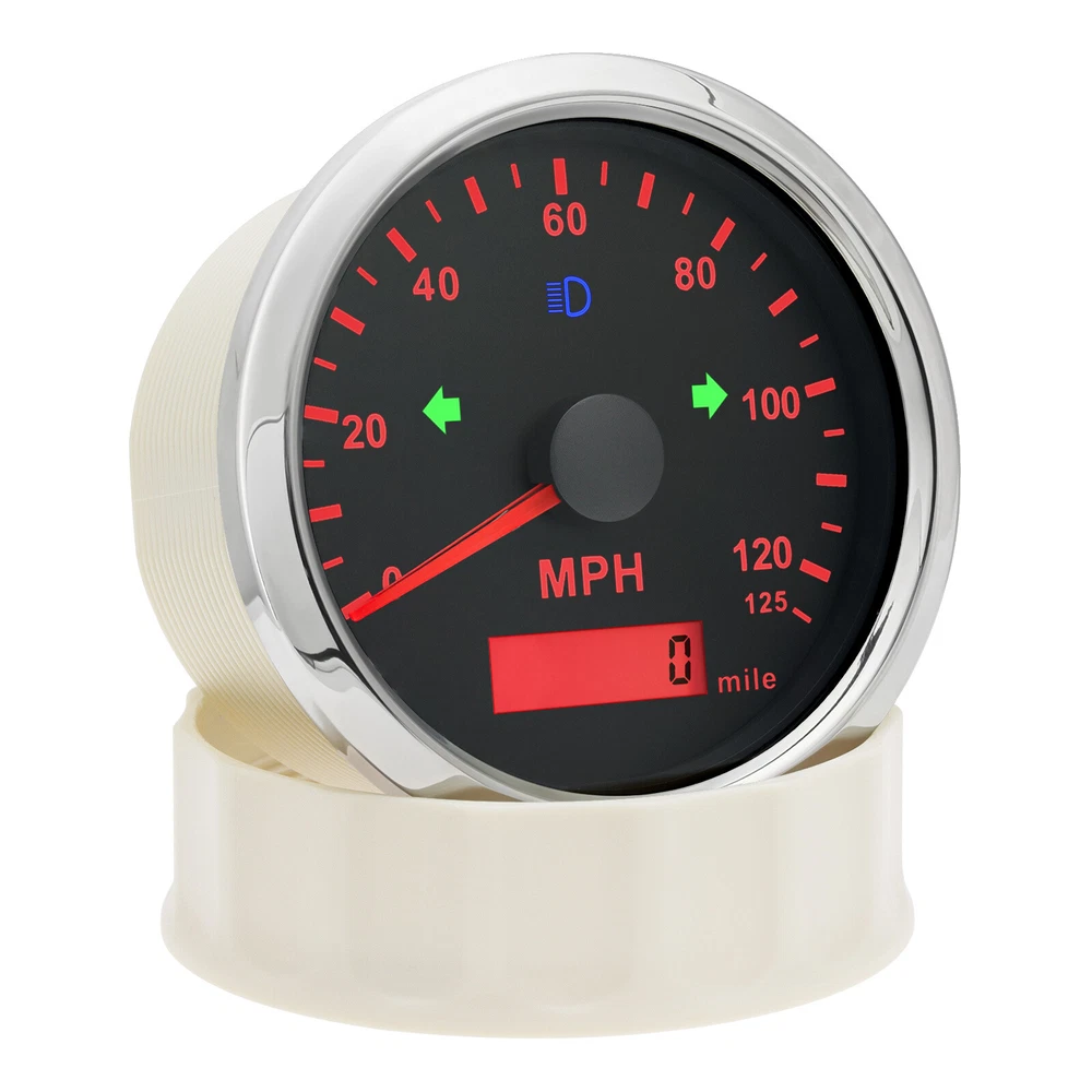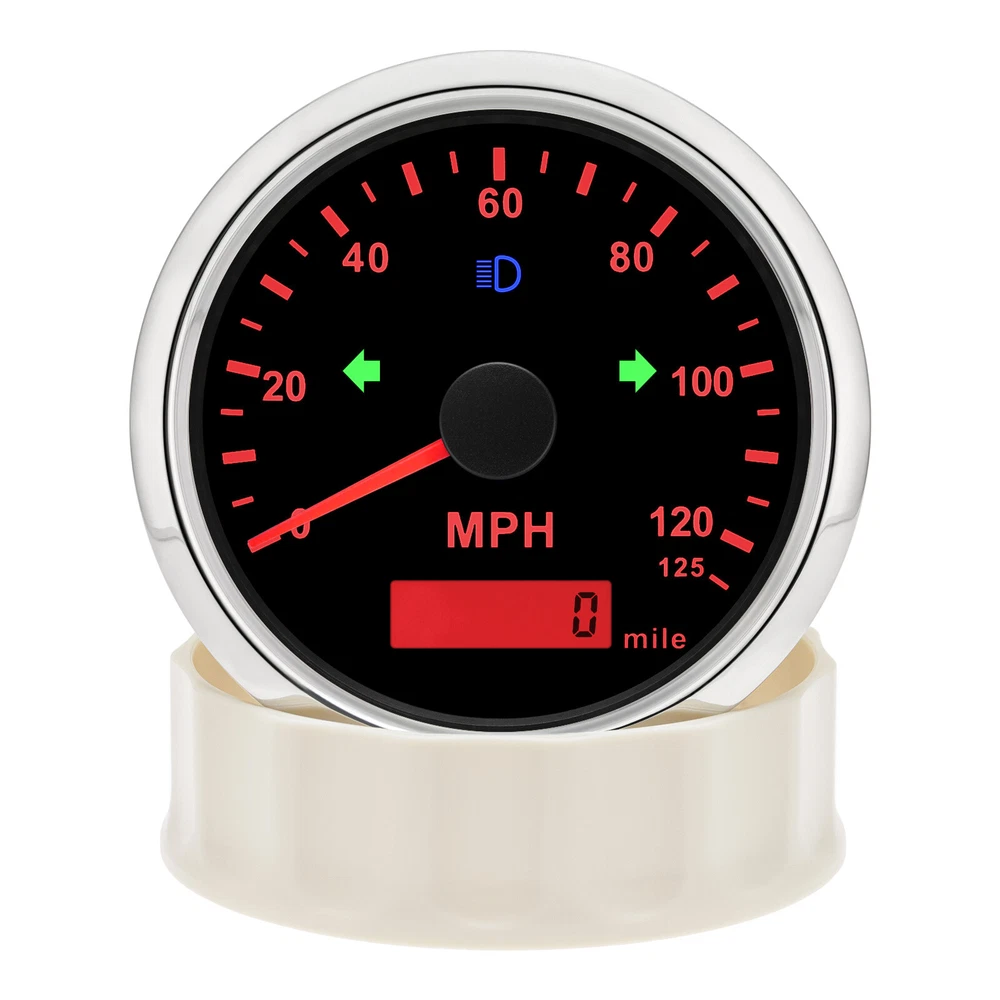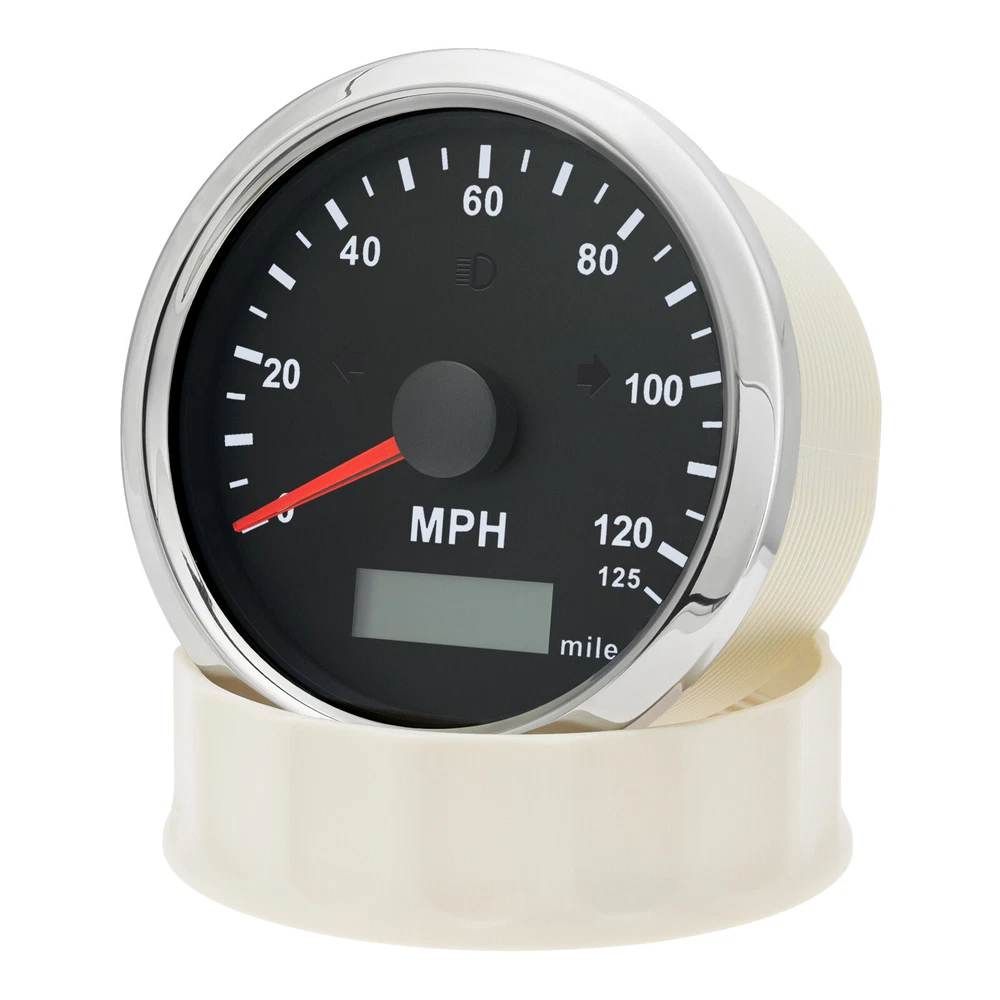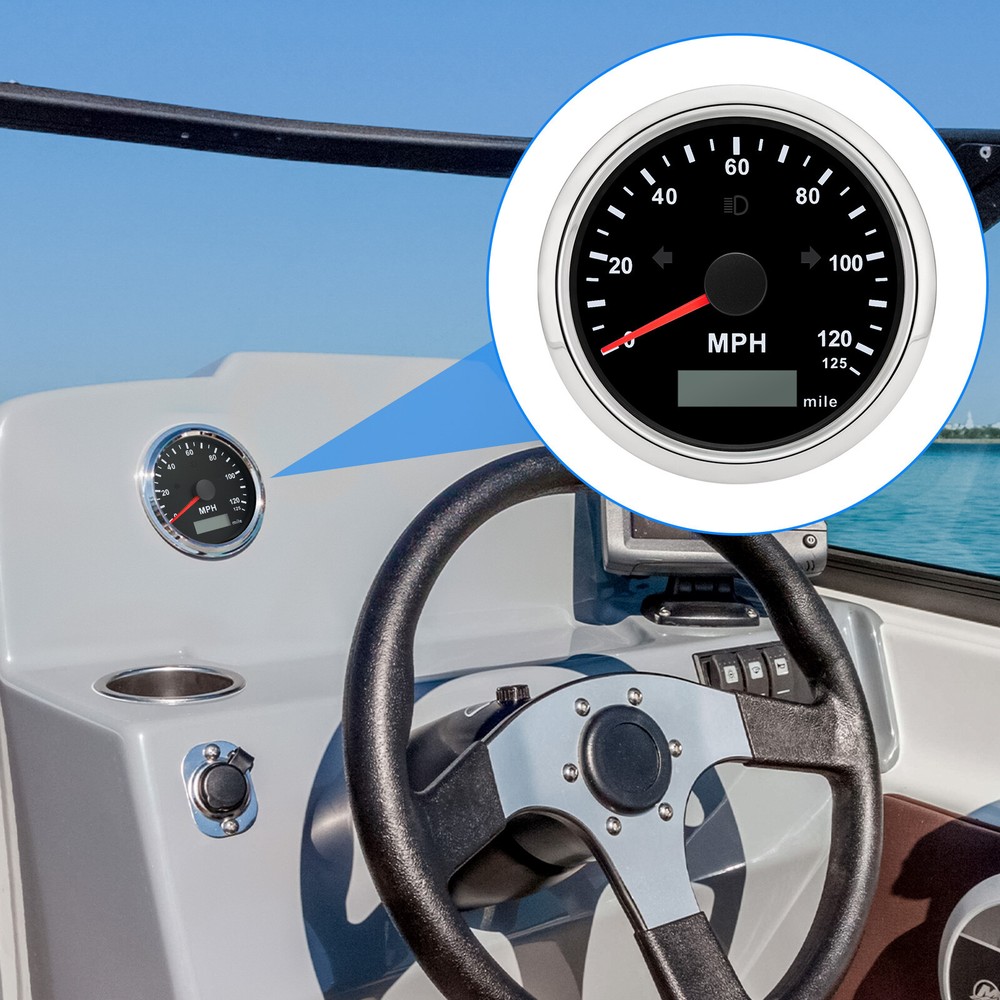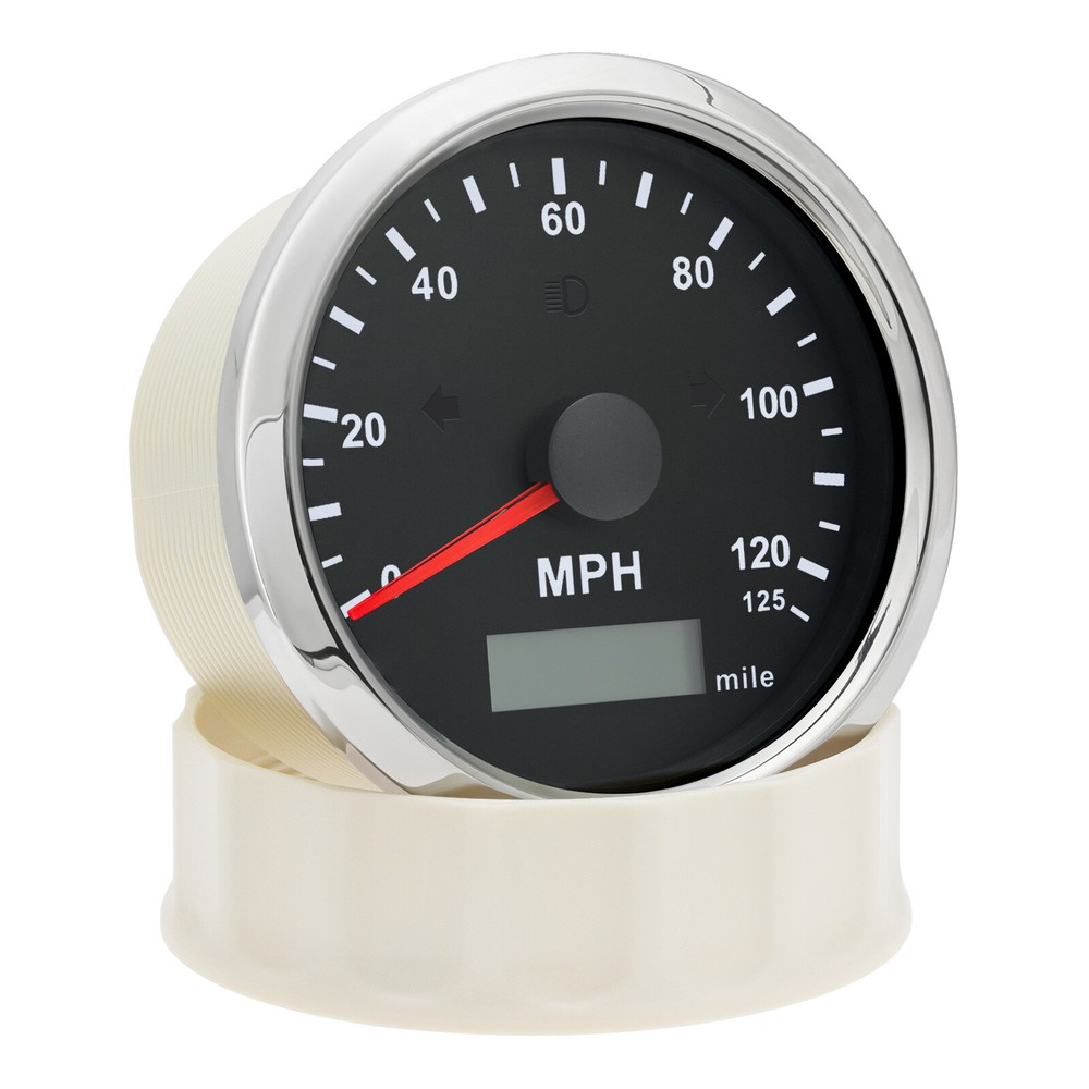85mm GPS Speedometer 0-125MPH Gauge Turn Signal High Beam For Car Boat Truck 85mm GPS Speedometer 0-125MPH Odometer Gauge With Indicator Light For Boat Car Specifications: Fixing dimension: 85mm(3-3/8") Indicating Range: 0-125MPH Working Voltage: 12V/24V Total Mileage Range: 0-999999 miles GPS Blind Area Odometer Compensation OverSpeed Buzzer Alarm (Value Adjustable) Indication light: LEFT, HIGH BEAM, RIGHT Backlight: Red and Yellow available Working temperatures: - 40 to 85°C Operation mode: LCD display, stepper motor Features: Suitable for all vehicles and off-road vehicles The signal comes directly from the satellite signal receiver(GPS Antenna), don't need other speed sensor. The gauge has the advantages of high precision, quick location confirmation and short start up time. IP67 waterproof and dustproof grade Reverse polarity protection and anti-fogging performance No Stationery Drift Stepper motors used for full range of stepping gauges, great feature with its less power consumption, longer life, higher precision, etc. Installation: 1. Cut an 85mm (3 3/8") hole in the panel (II) and allow a clearance of 55mm (2 3/16”) behind the panel to fit the gauge. 2. Remove fastening ring (I), insert gauge through the panel from the front. Tighten gauge (III) using fastening ring (I) from the rear. 3. Connect cables according to the diagram. Choose either red or yellow wire for backlighting. 4. Securely fasten the GPS antenna, preferably outdoors (or inside front windscreen) so that it has a clear view of the sky to pick up satellite signal. Connect the antenna cable to socket in the back of the gauge. Do not cut cable. 5. After turning on the power, allow the gauge to search for satellite signal for 1 minute. Function Select: “ODO”,“BUZZ” Press and hold on the button at the back, then turn on the power supply. The LCD will show ODO, BUZZ, etc. You can select the function after releasing the button. 1.“ODO”(change total odometer) After selecting “ODO”, the LCD will show “5000” (for example 5000 km) , press the button to change the flashing digit from 0 to 999999 to set up the target odometer value. 2.“BUZZ”(change overspeed buzzer alarm threshold value) After selecting “BUZZ”, e.g. the LCD will show “B 80” (buzzer will be on when speed over 80km/h), press the button to change the flashing digit from 10 to 240 to set up target overspeed buzzer alarm threshold value. (Remarks: No.3 function is not ready in the prototype sent to BESTAS, but will be ready in mass production.) Note: After setting, you should disconnect both Power+ and GND, then reconnect the two cables , it will save the setting. If you just cut Power +, then it won’t work properly. Package Included: 1x GPS speedometer 1x GPS Antenna 1x Multi-plug socket 1x Installation Instruction Wholesale and drop shipping are both welcomed For wholesale, we will offer the discount or free express shipping which only takes 3-7 days to arrive. For drop shipping, We could send the goods to your customers directly and won't leave information about us if youd like to.