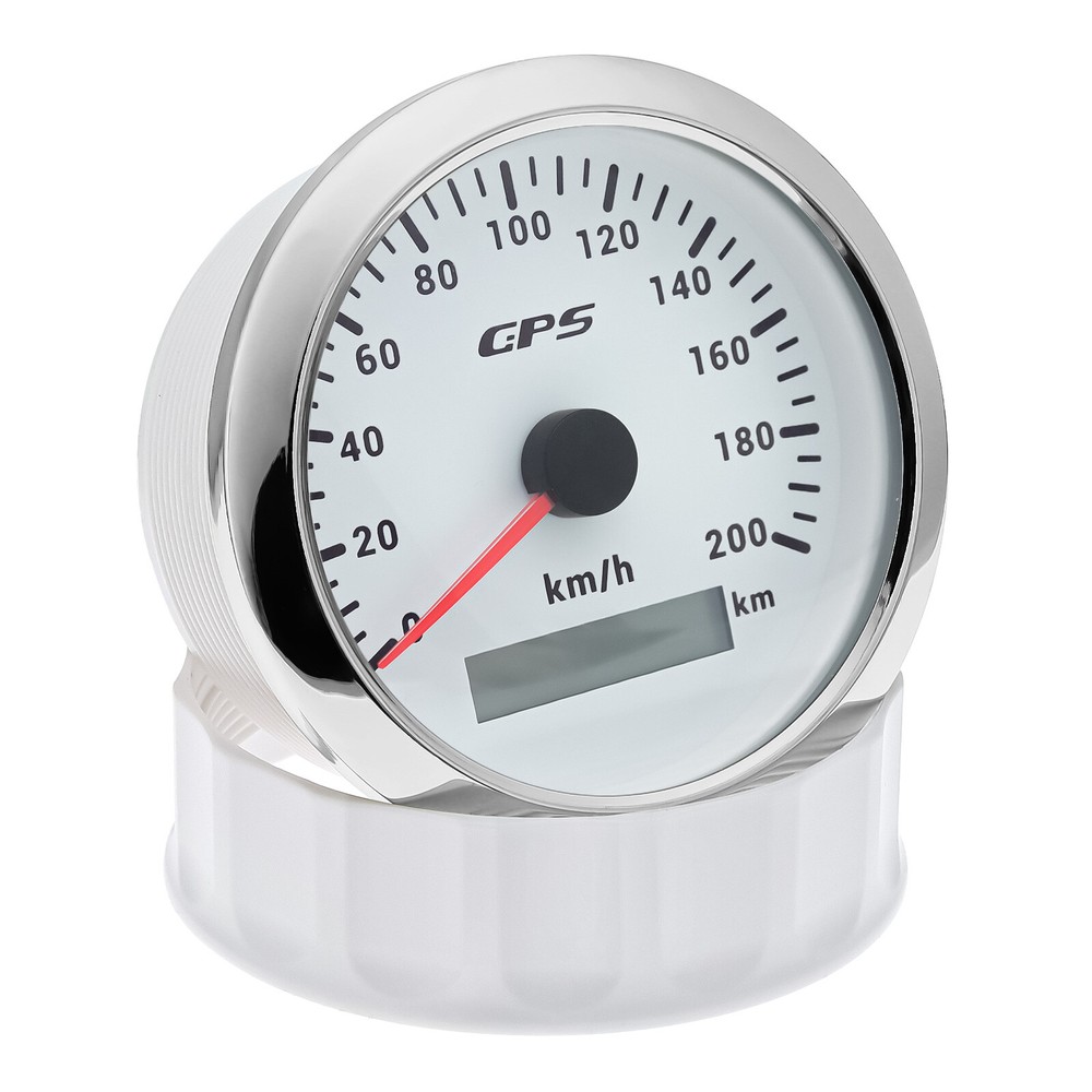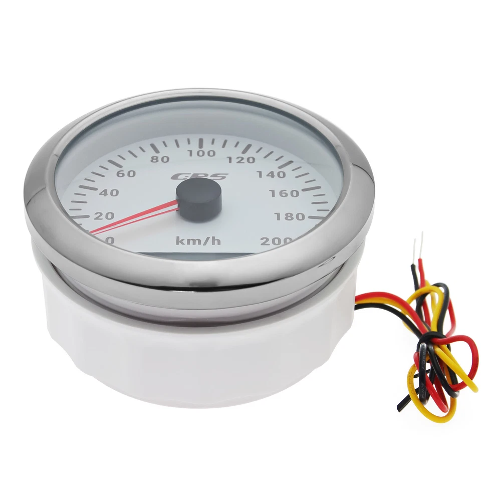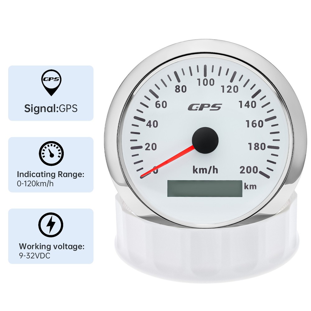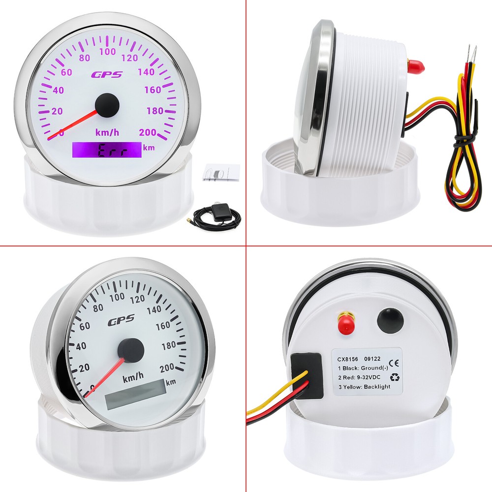85mm Boat GPS Speedometer 0-200Km/H Odometer Gauge 7 Colors LED For Car Marine 85mm GPS Speedometer Gauge 0-200km/h Odometer 7 Colors LE Display for Car Boat Motorcycle Product Specifications: Dial: White&Silver Material: Stainless Steel 316L Bezel + Anti-fog Glass Install Diameter: Φ85mm or 3-3/8" Signal: GPS Working Voltage: 9~32V DC Working Current: ≤100mA Operating Temperature: -30℃ ~ 75℃ Storage Temperature: -40℃ ~ 85℃ Size: 12x8x12cm / 4.72x3.1x4.75 inch IP67 waterproof and dustproof grade Indication Range: 0-200km/h Backlight:7 Colors Backligt Product Descriptions: High-brightness LED backlight. 316 stainless steel for long-term use even in acid-base, humid environment. IP67 waterproof and dust-proof grade. With curved glass( with anti-fog function). Suitable for all kinds of vehicle modification. Using stepper motor drive pointer, accurate display of the engine speed, and with the LCD display clear display mileage. -Gauges have many kinds backlight color (red,yellow,orange,green,blue,purple,white),customers can adjust any color that you like Connection: Black: Ground(-) Red: 9-32VDC(+) Yellow: Backlight(+) Package Includes: 1X 85MM Digital GPS Speedometer Gauge 1x Wire Harness 1X Instruction 1X GPS Antenna