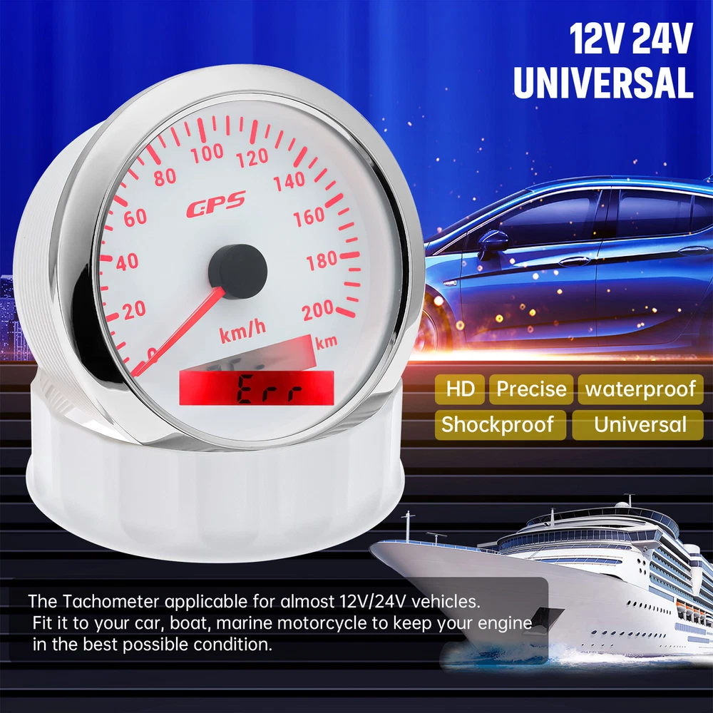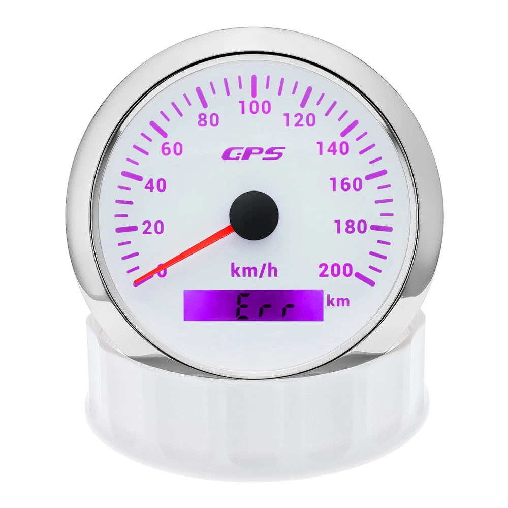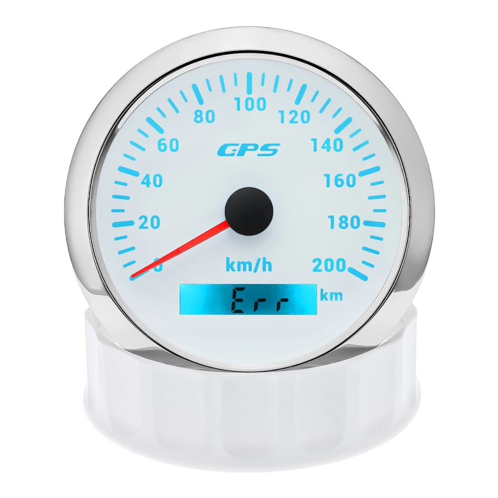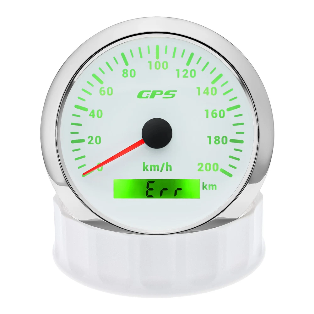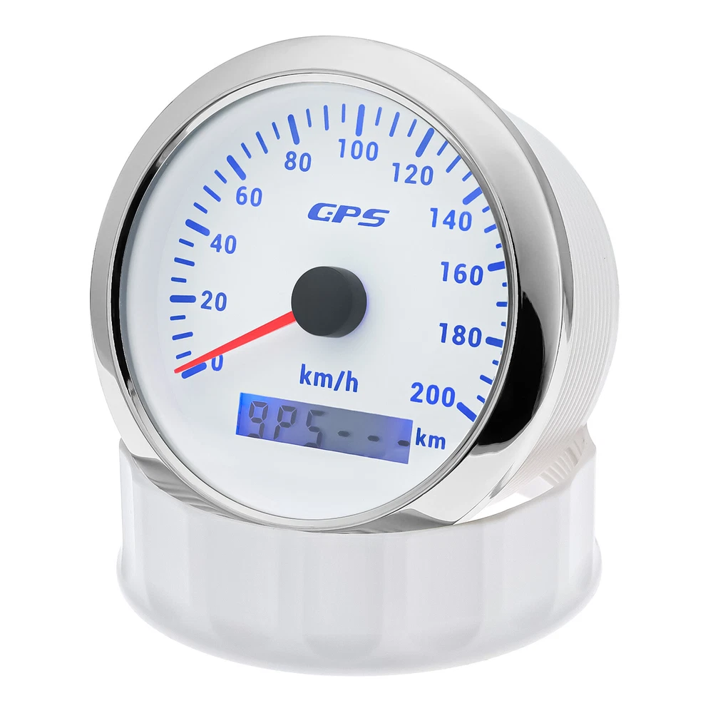 85mm Boat GPS Speedometer 0-200Km/H Odometer Gauge 7 Colors LED For Car Marine 85mm GPS Speedometer Gauge 0-200km/h Odometer 7 Colors LE Display for Car Boat Motorcycle Product Specifications: Dial: White&Silver Material: Stainless Steel 316L Bezel + Anti-fog Glass Install Diameter: Φ85mm or 3-3/8" Signal: GPS Working Voltage: 9~32V DC Working Current: ≤100mA Operating Temperature: -30℃ ~ 75℃ Storage Temperature: -40℃ ~ 85℃ Size: 12x8x12cm / 4.72x3.1x4.75 inch IP67 waterproof and dustproof grade Indication Range: 0-200km/h Backlight:7 Colors Backligt Product Descriptions: High-brightness LED backlight. 316 stainless steel for long-term use even in acid-base, humid environment. IP67 waterproof and dust-proof grade. With curved glass( with anti-fog function). Suitable for all kinds of vehicle modification. Using stepper motor drive pointer, accurate display of the engine speed, and with the LCD display clear display mileage. -Gauges have many kinds backlight color (red,yellow,orange,green,blue,purple,white),customers can adjust any color that you like Connection: Black: Ground(-) Red: 9-32VDC(+) Yellow: Backlight(+) Package Includes: 1X 85MM Digital GPS Speedometer Gauge 1x Wire Harness 1X Instruction 1X GPS Antenna