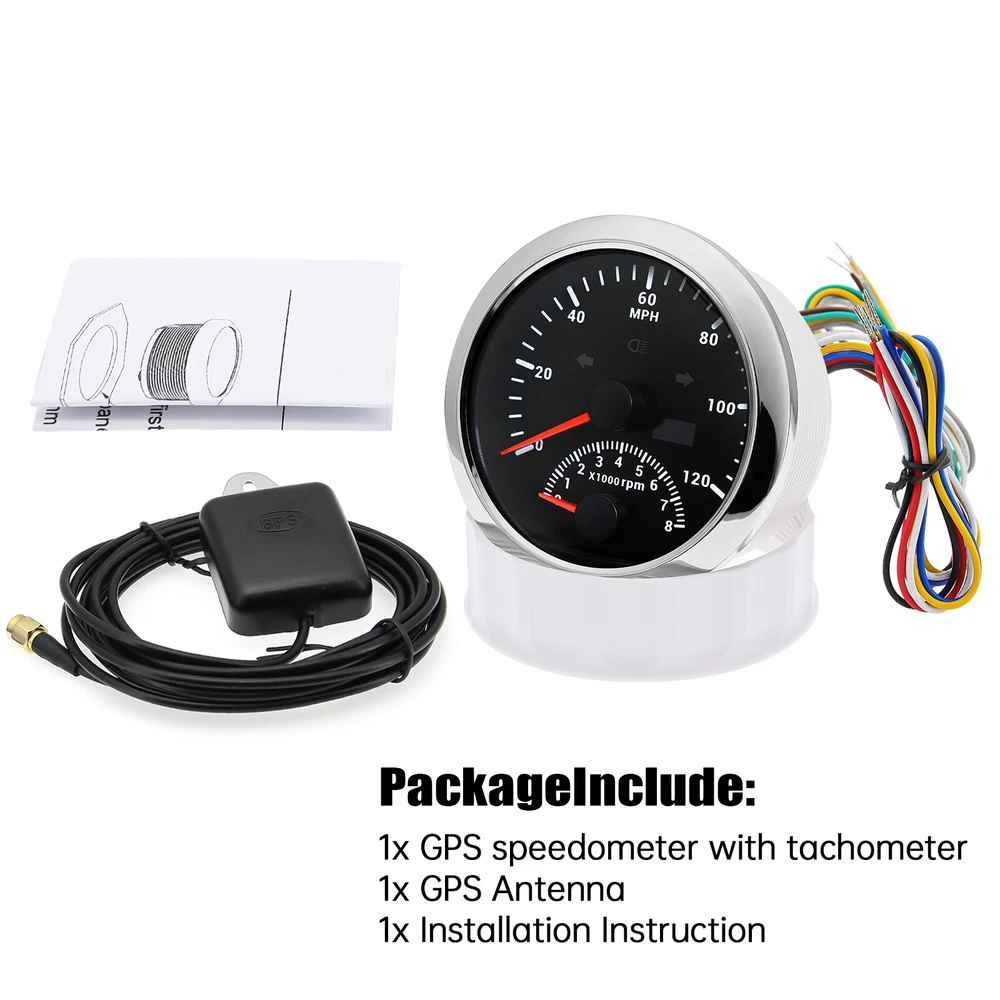 85mm GPS Speedometer 0-200MPH W/tachometer & 85mm 4 in 1 Gauge SET with Senders 2 Gauge Set With Senders 85mm GPS Speedometer 0-120MPH with 85mm Fuel Level Water Temp Oil Pressure Volt Features: Suitable for all vehicles and off-road vehicles The signal comes directly from the satellite signal receiver(GPS Antenna), don't need other speed sensor. The gauge has the advantages of high precision, quick location confirmation and short start up time. IP67 waterproof and dustproof grade Reverse polarity protection and anti-fogging performance Stepper motors used for full range of stepping gauges, great feature with its less power consumption, longer life, higher precision, etc. Most importantly, the gauge is easy to setup, and can be used in all vehicles, boats and off-road vehicles. GPS Speedometer Specifications: Application: Universal fit for Motorcycle/ Boat/Truck/Bus/Car Electronic Speedometer (stepper motor) No Mechanic Sensor, get speed signal from GPS Speed ≠0 and show accurate speed in tunnel with the help of accelerometer Total Mileage Adjustable GPS Blind Area Odometer Compensation OverSpeed Buzzer Alarm (Value Adjustable) Indication Light (Left, Right and High Beam Installation Diameter: 85mm (3 3/8") Speed Range: 0~120MPH RPM Range : 0~8000RPM Mileage Range: 0-99999.9miles Working Voltage: 12V/24V Working temperatures: - 40 to 85°C Protection rank: IP67 Waterproof Reverse polarity protection and anti-fogging performance 4 IN 1 Gauge Technical Data: Fixing dimension: 85mm Indicating Range: Oil press. meter: 0-150PSI Water temp. meter: 100-250℉ Fuel level meter: 0-190ohms/240-33ohms, empty-full; The signal can be adjusted Voltmeter: 8-16V Working Voltage: 12V Input Signal: 10-184ohms for 0-150PSIoil pressure meter; 0-190ohms for fuel level meter;(Default 0-190ohms, can adjust to 240-33ohms) 8-16V voltage meter; Input Signal 320-22ohms for water temperature meter Red backlight Protection grade is IP67, the whole body is completely waterproof; Excellent antifogging function; 316 Stainless steel bezel with curved glass; Convenient Installation by multi-plug socket connecting way; Accessories: matched with connectors, Installation Instruction Package Included: 1 x 85mm 4 in 1 Multifunctional Gauge 1 x 85mm GPS Speedometer Gauge 1 x M16*1.5 Tacho Sensor 1 x 1/8NPT Oil pressure Sensor 1 x 1/8NPT Water Temp Sensor 1 x GPS Antenna 2 x Cable 2 x Installation Instruction