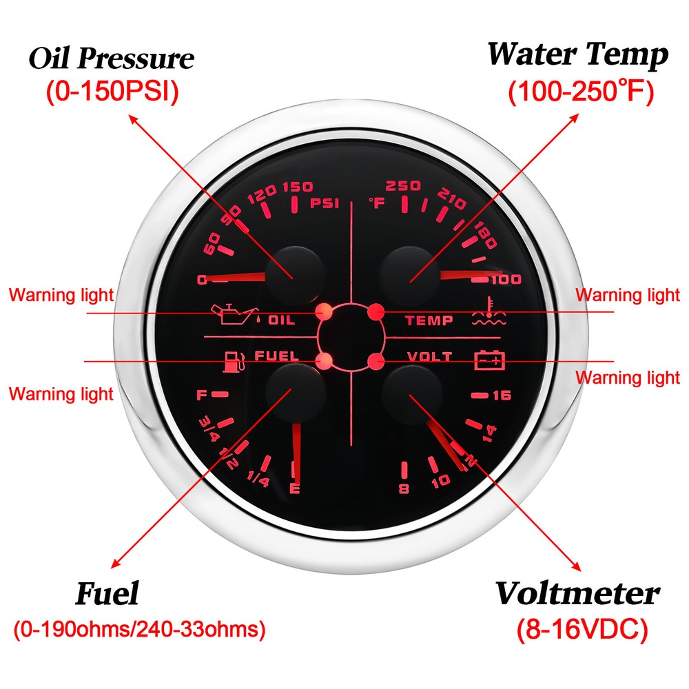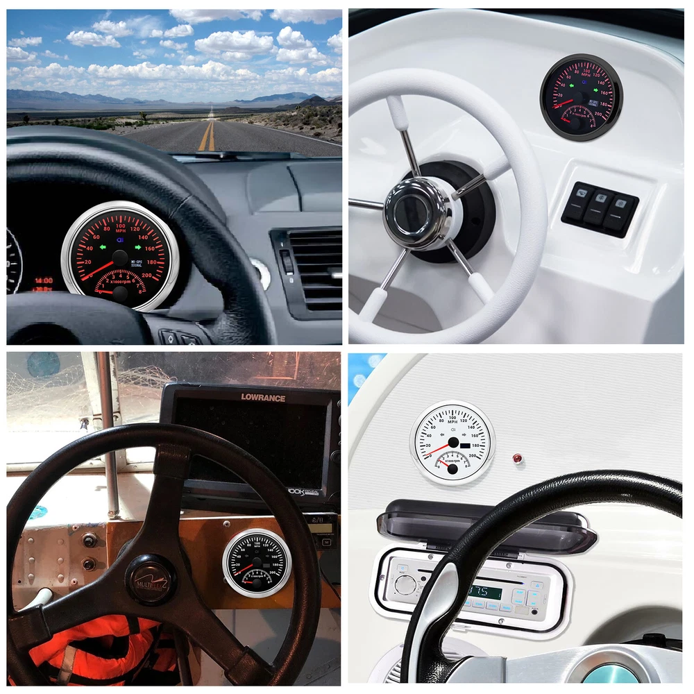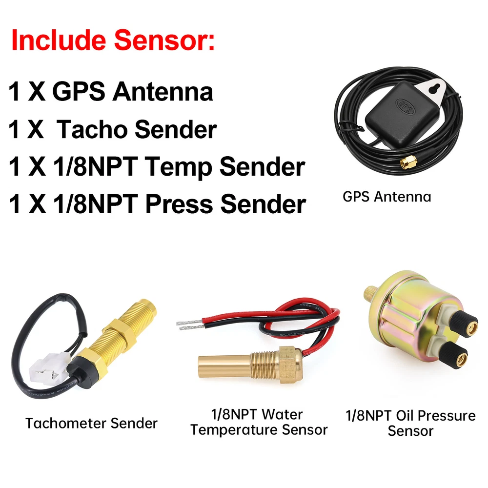 2 Gauge Set with Senders 85mm GPS Speedometer 200MPH W/tacho & 85mm 4 in 1 Gauge 2 Gauge Set With Senders 85mm GPS Speedometer 0-200MPH with 85mm Fuel Level Water Temp Oil Pressure Volt Features: Suitable for all vehicles and off-road vehicles The signal comes directly from the satellite signal receiver(GPS Antenna), don't need other speed sensor. The gauge has the advantages of high precision, quick location confirmation and short start up time. IP67 waterproof and dustproof grade Reverse polarity protection and anti-fogging performance Stepper motors used for full range of stepping gauges, great feature with its less power consumption, longer life, higher precision, etc. Most importantly, the gauge is easy to setup, and can be used in all vehicles, boats and off-road vehicles. GPS Speedometer Specifications: Application: Universal fit for Motorcycle/ Boat/Truck/Bus/Car Electronic Speedometer (stepper motor) No Mechanic Sensor, get speed signal from GPS Speed ≠0 and show accurate speed in tunnel with the help of accelerometer Total Mileage Adjustable GPS Blind Area Odometer Compensation OverSpeed Buzzer Alarm (Value Adjustable) Indication Light (Left, Right and High Beam Installation Diameter: 85mm (3 3/8") Speed Range: 0~200MPH RPM Range : 0~8000RPM Mileage Range: 0-99999.9miles Working Voltage: 12V/24V Working temperatures: - 40 to 85°C Protection rank: IP67 Waterproof Reverse polarity protection and anti-fogging performance 4 IN 1 Gauge Technical Data: Fixing dimension: 85mm Indicating Range: Oil press. meter: 0-150PSI Water temp. meter: 100-250℉ Fuel level meter: 0-190ohms/240-33ohms, empty-full; The signal can be adjusted Voltmeter: 8-16V Working Voltage: 12V Input Signal: 10-184ohms for 0-150PSIoil pressure meter; 0-190ohms for fuel level meter;(Default 0-190ohms, can adjust to 240-33ohms) 8-16V voltage meter; Input Signal 320-22ohms for water temperature meter Red backlight Protection grade is IP67, the whole body is completely waterproof; Excellent antifogging function; 316 Stainless steel bezel with curved glass; Convenient Installation by multi-plug socket connecting way; Accessories: matched with connectors, Installation Instruction Package Included: 1 x 85mm 4 in 1 Multifunctional Gauge 1 x 85mm GPS Speedometer Gauge 1 x M16*1.5 Tacho Sensor 1 x 1/8NPT Oil pressure Sensor 1 x 1/8NPT Water Temp Sensor 1 x GPS Antenna 2 x Cable 2 x Installation Instruction