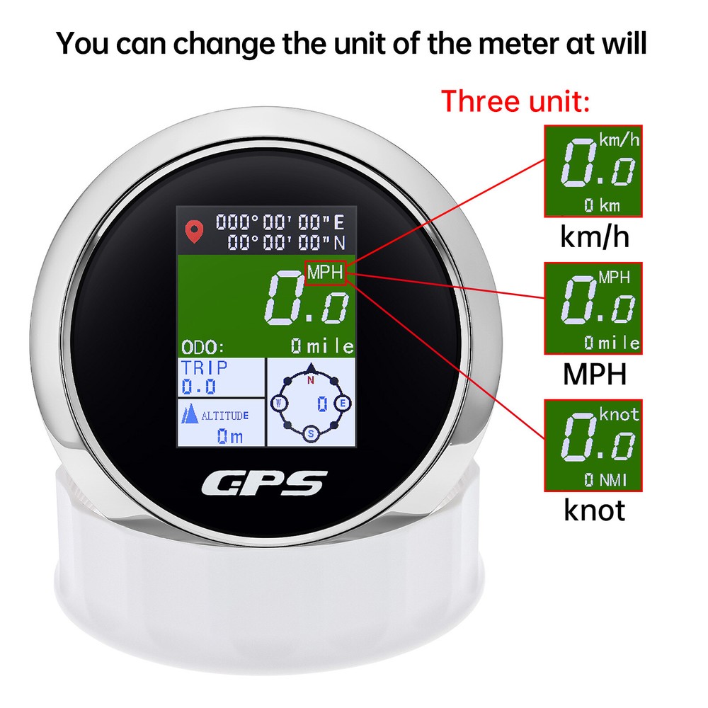 85mm Waterproof GPS speedometer Odometer Gauge For Car Truck Motorcycle Boat 85MM Digital GPS Speedometer Odometer Gauge for Marine Boat Car Waterproof NEW Feature: High-brightness LED backlight. 316 stainless steel for long-term use even in acid-base, humid environment. IP67 waterproof and dust-proof grade. With curved glass( with anti-fog function). Suitable for all kinds of vehicle modification. Using stepper motor drive pointer, accurate display of the engine speed, and with the LCD display clear display mileage. Specification Basic description of the instrument: Speedometer display range: 0-999,9mph Total mileage display range: 0-999999mph Indication range of daily kilometres: 0-999,9mph Digital compass: 0-359° Longitude and Latitude ODO: Accumulated mileage power outage data can be saved TRIP: Single mileagezero power down COG: Digital Compass Cog: heading, direction of travel (middle COG is accurate to a specific degree) Three unit can be swicthed: knot; mph; km/h (By touching the button on the back of the instrument, knot, MPH, km/h units can be switched and automatically saved.) Degree of Protection: IP67 Backlight: TFT Screen Input Parameter: GPS signal GPS antenna length 3 meter Dimensions: 85mm diameter (3-3/8'') Package Include: 1*GPS Speedometer 1*GPS Antenna 1*Multi-plug socket 1*Instruction Notes: 1. Please allow 1-3 CM differs due to manual measurement. 2. As different computers display colors differently, the color of the actual item may vary slightly from the above images. Thanks for your understanding.