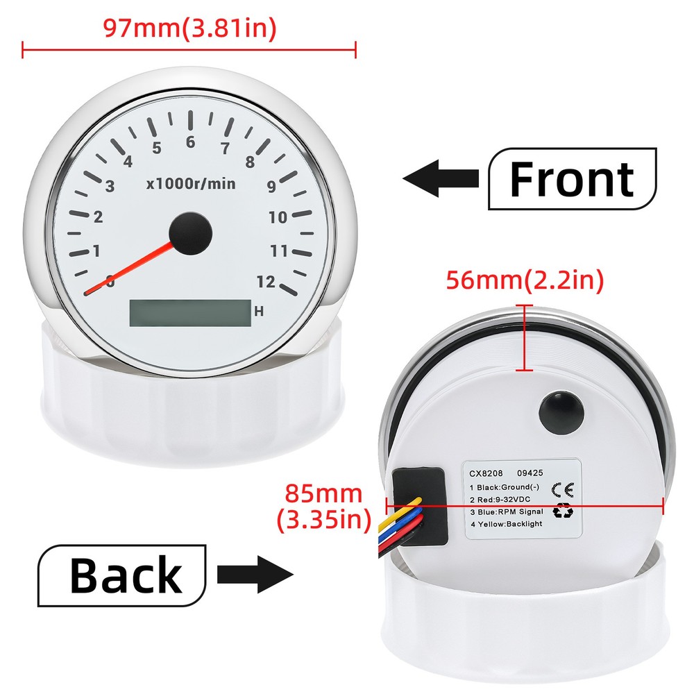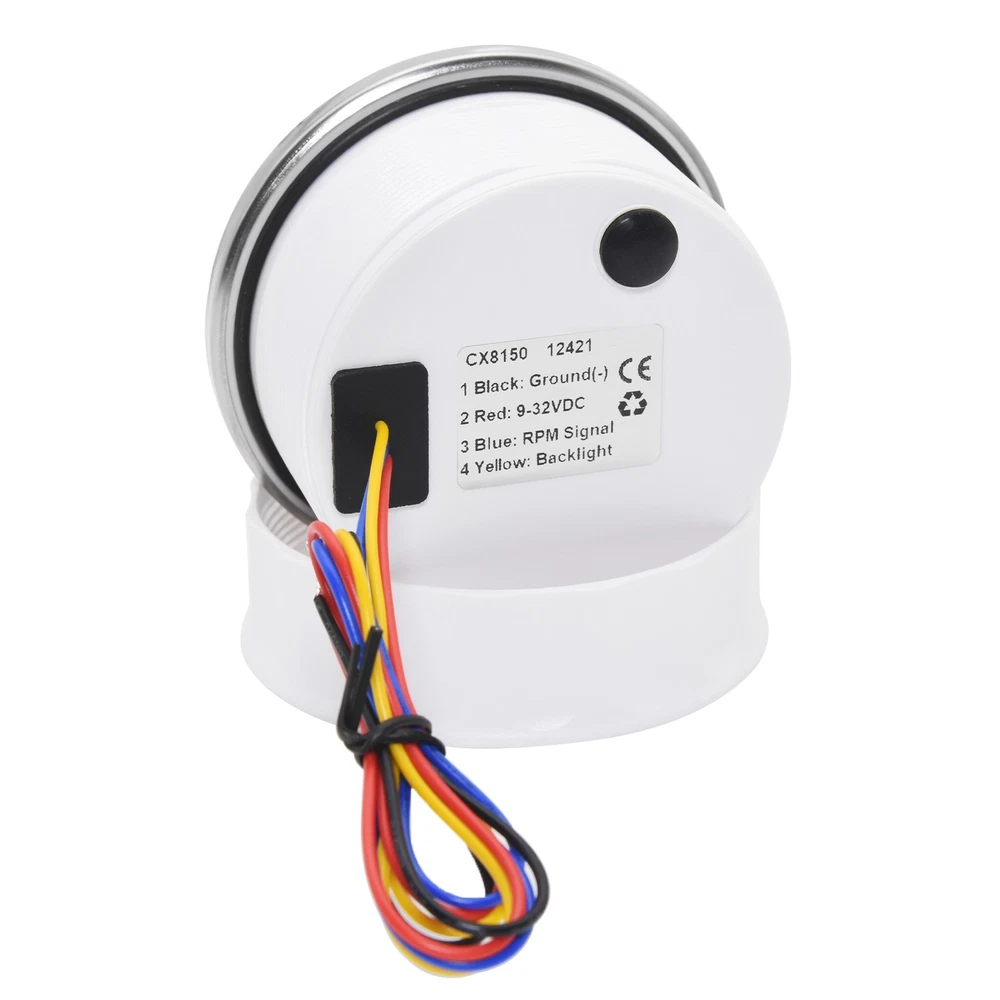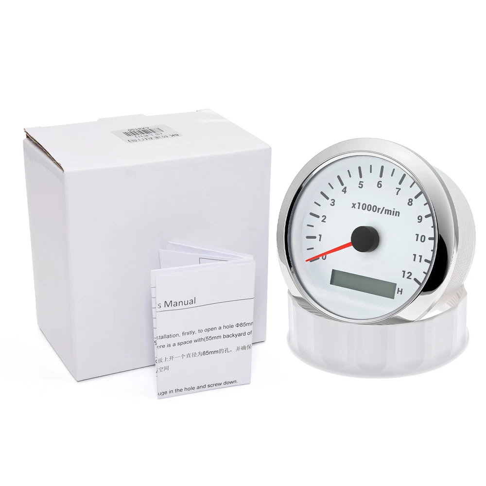 85mm White Tachometer Gauge 0-12000RPM Waterproof For Marine Boat Car Truck 85mm Car Tachometer 0-12000RPM LCD Digital Hourmeter With Red Backlight For Car Truck Motorcycle ATV UTV Marine Boat Yacht Specification: Fit For: Outboard Gas or Disel Engine Car Truck Motorcycle ATV UTV Marine Boat Yacht Face Color: White Face with Chrome bezel Bezel Materials: Stainless Steel Indicating Range: 0-12000RPM Operating Voltage:9-32VDC Operating Current:≤100mA Operating Temperature:-30~+75 ℃ Storage Temperature:-40~+85 ℃ Install diameter: 85mm(3-3/8") Grade of protection :IP67 Package Method :Neutral box Features: -100% Brand new and high quality. -Excellent anti-fogging performance. -316L Stainless steel bezel with curve glass. -Easy installation with multi-plug socket connection design. -RED LED Connection: Red--+9-32VDC Black--Ground(-) Orange--Backlight(+) Blue--Signal Input Package Included: 1xTachometer 1xWiring Harness 1x Instruction manual This tacho must be hooked up to the "W" terminal on vehicle alternator. Many diesel engines and most inboard gas boat engine alternator have this connection. It can also be working with tachometer sender or ECU of the car (pulse signal) Installation instructions: 1.Opening a hole in the panel (your cabin board and dashboard) with a diameter of 85mm,Insert meter into the hole,The panel corresponding to the instrument panel is marked with a convex table,and open a small notch in this location,To ensure that there is at least 85mm of the instrument panel at the back of the instrument. 2.After the instrument is mounted in the panel,Screw down with a fixed ring. 3.Connect the wire,the instrument housing is directly connected to the 12~24V power supply. 4.Insert wire harness,Firmly locked in the table. How to adjust the speed ratio? 1. Turn on the power supply first. 2. Press and hold the mode button for three seconds to enter the setting speed ratio mode. Then adjust the speed ratio of 1-300 according to your request. 3. After setting the data will be saved automatically. 4.If your sensor is installed on the flywheel plate, the speed ratio corresponds to the number of gears of the engine; If the speed signal comes from the W terminal, the speed ratio is equal to half the number of poles. 5.When the engine is idle, the rev counter will normally display 600-800 U.min, which means the transmission ratio is correct. If not, you can reduce or increase the gear ratio to check the speed difference.