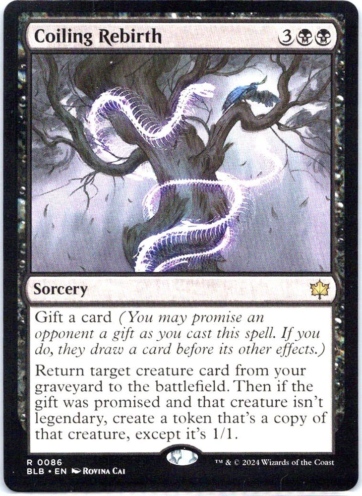 Manufacturer: MTG Type: Collectible Card Game Features: Rare Set: Promo Pack: Bloomburrow Card Name: Coiling Rebirth Character: Coiling Rebirth Rarity: Rare Card Number: 86 Graded: No Game: MAGIC_THE_GATHERING