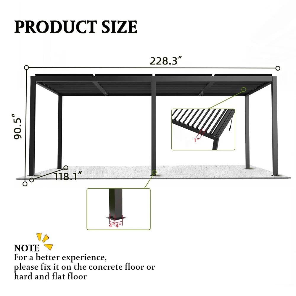Product Information Main Color: Black Main Material: Aluminum Product Dimensions Item Length (in.): 228.00 Item Width (in.): 118.00 Item Height (in.): 90.50 Weight (lbs.): 633.00 Package Size Length (in.): 111.00 Width (in.): 26.00 Height (in.): 27.90 Weight (lbs.): 720.00 Product Features Premium Material Construction: The pergola is made of a powder-coated aluminum frame and a tilting louvered roof of galvanized steel that withstands up to 73 mph winds.Durable construction for year-round use Innovative design: a louver roof with adjustable angles lets you control outdoor light and ventilation.Effortlessly open or close the louver roof with a simple crank, adapting to changing weather conditions. Integrated Drainage System: Rainwater will be diverted to the columns through the built-in integrated drainage system, where it will be drained through the notches in the base of the posts. Endless comfort: our pergola creates the perfect outdoor leisure space, fostering cherished memories with family and friends.Ideal for gardens, backyards, parties, and commercial/domestic BBQ use. Multipurpose outdoor solution. Easy to Assemble: Prefabricated rails and Louvers require no special rivets or welds for assembly, and can be stably attached to the ground through the supplied expansion bolts. Attention: Do not allow snow to accumulate on the louver roof. If moderate to heavy snow is expected, open the louvers. In the case of high winds or other extreme weather conditions, open the louvers and raise or remove any shade screen accessories that have been installed to avoid potential damage to your pergola.