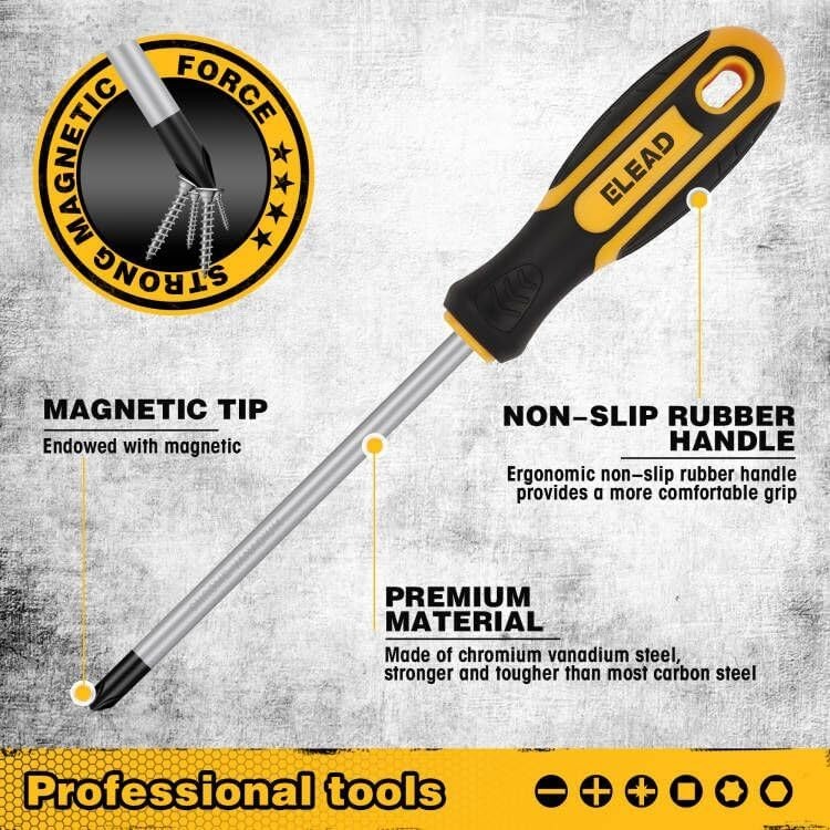 Magnetic Screwdriver Set with Case: 86-Piece Slotted Phillips, Yellow+black Product Details Brand: ELEAD Number of Items: 86 Head Style: Flat, Phillips, Hex, Torx Material: Chrome Vanadium Steel Color: Yellow+black Recommended Uses For Product: Screw Driving Special Feature: Ergonomic Manufacturer: SEDY Item Weight: 6.03 pounds Package Dimensions: 14.13 x 11.5 x 3.31 inches Country of Origin: China Item model number: 70027 Style: 86-Piece Magnetic Screwdriver Set with Case Special Features: Ergonomic Batteries Included?: No Batteries Required?: No Brand: ELEAD Number of Items: 86 Head Style: Flat, Phillips, Hex, Torx Material: Chrome Vanadium Steel Color: Yellow+black 【PREMIUM MATERIALS】Crafted with Chromium Vanadium Steel, our screwdriver set surpasses standard carbon steel in strength and durability. The chromium plating adds corrosion resistance and a sleek appearance. 【VERSATILE COLLECTION】This 86-piece set includes 14 Conventional and 9 Precision Screwdrivers, 40 Bits, 20 Nut Drivers, a Bit Holder, and a Magnetizer, housed in a handy case. Ideal for mechanics, electronics, and home projects. 【MAGNETIC CONVENIENCE】Equipped with a Magnetizer Demagnetizer tool, this set transforms any tool blade into a magnetic retriever, enhancing your work efficiency. Flexible socket extensions and a Magnetic Bit Holder expand its usability. 【ERGONOMIC DESIGN】Enjoy a comfortable grip with our non-slip, soft handle made of PP+TPR materials. The 360-degree rotating precision screwdrivers facilitate smooth screw rotation, reducing hand fatigue. 【ORGANIZED & PORTABLE】This comprehensive screwdriver set comes in a dedicated storage box, making it easy to carry and organize. It's the perfect gift for men who love DIY, offering a solution for a wide array of repair tasks.