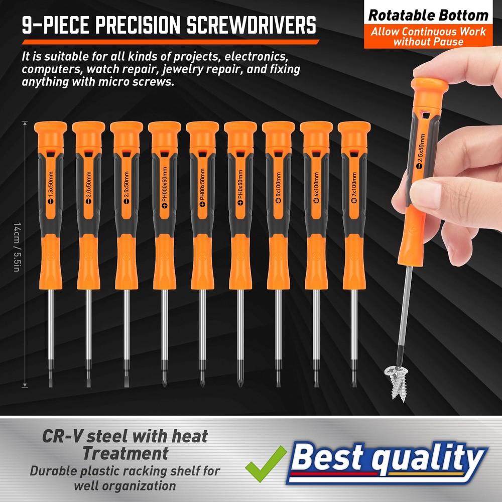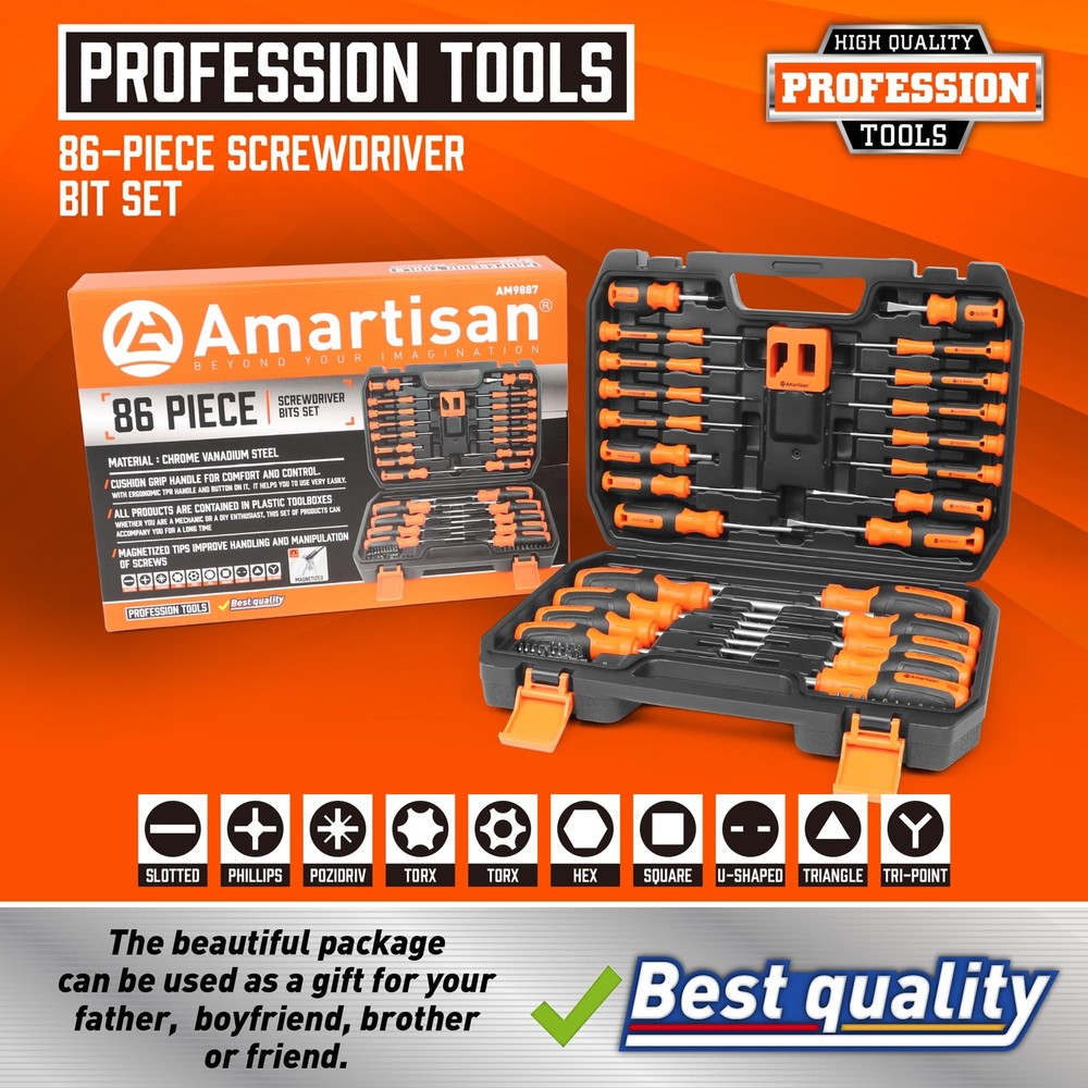86-Piece Magnetic Screwdrivers Set with Case, Includs Slotted, Phillips, Hex, Pozidriv,Torx and Precision Screwdriver Set, Magnetizer Demagnetizer Tools, Tools for Men . Number of Items 86 Head Style Flat Material Chrome Vanadium Steel Color Yellow Premium materials, Screwdriver bar made of 6150 chromium vanadium steel, stronger and tougher than most carbon steel;it is chromium plating treated for corrosion resisted and nice appearance. 86-piece magnetic screwdriver set consists of 10PC Conventional screwdriver,4PC Torx screwdriver,9PC Precision Screwdriver and 40PC screwdriver bits. including Phillips, Slotted, Torx, Hex and Pozidriv, 20PC Precision bits, 1 Magnetizer Demagnetizer Tools Magnetizer demagnetizer tool,Converts any tool blade to a magnetic retriever of screws, nuts and metallic particles. Ergonomic non-slip and soft handle which is made of pp+tpr materials, let you feel soft and comfortable at work.Each Precision screwdrivers has a 360 degree rotation that allows you rotate the screws smoothly. Equipped with a dedicated storage box for easy carrying. Meet your work needs, Suitable for all kinds of projects,electronics, computers, watch repair, jewelry repair, and fixing anything with micro screws. Premium materials, Screwdriver bar made of 6150 chromium vanadium steel, stronger and tougher than most carbon steel;it is chromium plating treated for corrosion resisted and nice appearance. 86-Piece Magnetic Screwdrivers Set with Case, Includs Slotted, Phillips, Hex, Pozidriv,Torx and Precision Screwdriver Set, Magnetizer Demagnetizer Tools, Tools for Men 86-Piece Magnetic Screwdrivers Set with Case, Includs Slotted, Phillips, Hex, Pozidriv,Torx and Precision Screwdriver Set, Magnetizer Demagnetizer Tools, Tools for Men 86-Piece Magnetic Screwdrivers Set with Case, Includs Slotted, Phillips, Hex, Pozidriv,Torx and Precision Screwdriver Set, Magnetizer Demagnetizer Tools, Tools for Men 86-Piece Magnetic Screwdrivers Set with Case, Includs Slotted, Phillips, Hex, Pozidriv,Torx and Precision Screwdriver Set, Magnetizer Demagnetizer Tools, Tools for Men 86-Piece Magnetic Screwdrivers Set with Case, Includs Slotted, Phillips, Hex, Pozidriv,Torx and Precision Screwdriver Set, Magnetizer Demagnetizer Tools, Tools for Men Shipping We offer FREE shipping on all orders! We ship within Three business days of payment, usually sooner. We use a selection of shipping services such as UPS, FedEx, USPS etc. We only ship to the lower 48 states, no APO/FPO addresses or PO Boxes allowed. Local pickups and combined shipping options are not provided at this time. Return You can return a product for up to 30 days from the date you purchased it. Any product you return must be in the same condition you received it and in the original packaging. Please keep the receipt. Payment We accept payment by any of the following methods: Payoneer Please pay as soon as possible after winning an auction, as that will allow us to post your item to you sooner! Feedback Customer satisfaction is very important to us. If you have any problem with your order, please contact us and we will do our best to make you satisfied. Contact Us If you have any queries, please contact us via ebay. We usually respond within 24 hours on weekdays.