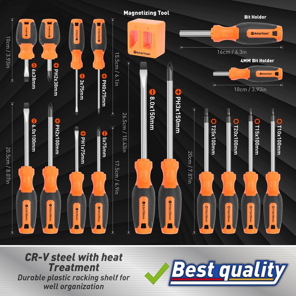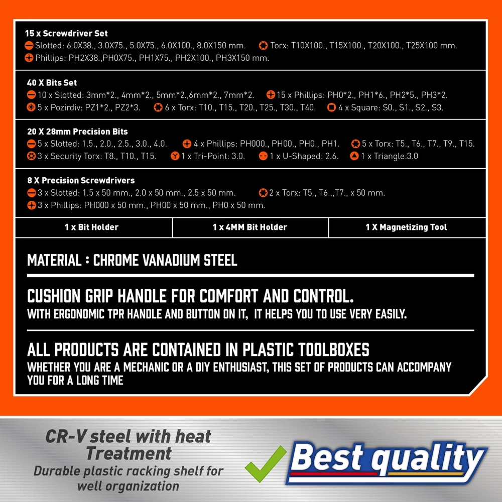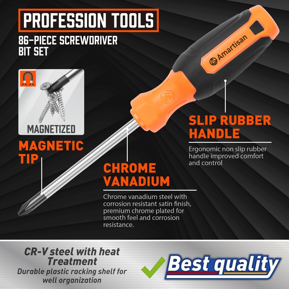 MPN: Does Not Apply UPC: Does not apply Country/Region of Manufacture: Unknown Features: Premium 6150 Chrome Vanadium Steel, corrosion-resistant, ergonomi Brand: Unbranded Model: Magnetic Screwdrivers Set with Case (86 Pieces). System of Measurement: Metric and SAE gtin13: Does not apply Type: Magnetic Screwdriver Set Drive Type: Slotted, Phillips, Hex, Pozidriv, Torx Number of Pieces: 86 Material: 6150 Chrome Vanadium Steel, PP+TPR handle. Color: Yellow.