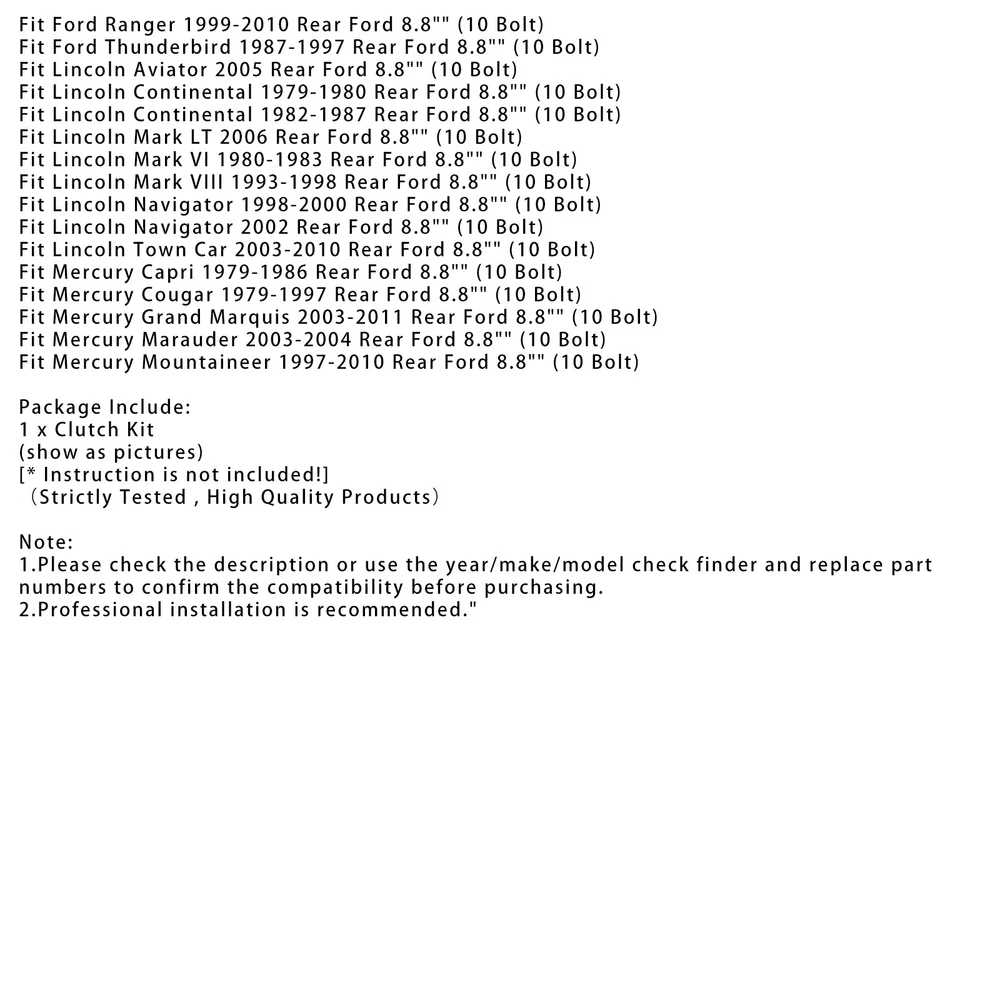 6L80 6L90 Transmission Rebuild 1-2-3-4 3-5-Reverse Clutch Seals Pack O-Rings 20.89 USD 21.99 USD Free shipping 5% off Gas Tank Fuel Cock Valve Petcock fit for Yamaha YZF R1 XJ900 YZ80 4KM-24500-00 18.76 USD Free shipping NEW Set of 4 Door Handles Chrome For Chrysler 300 & 300C 2005-2010 4589009AH USA 74.87 USD Free shipping For BMW E46 323i 325i 328i 330i M3 305 02-06 LHD Center Console Trim Base BE F13 70.61 USD 74.33 USD Free shipping 5% off Oil Cooler Filter Housing Seal Gasket O-ring 21304-JA11A For Nissan Armada Titan 10.68 USD Free shipping 7" LCD Digitizer Touch-Screen C070EAT01.0 For Uconnect Radios VP2 2018-2022 83.4 USD 87.79 USD Free shipping 5% off 02E Automatic Trans 6 Speed DSG Clutch Repair Kit For VW Audi MK5 MK6 TDI 2.0T 299.87 USD Free shipping Magneto Stator Generator Base For Yamaha YZ 125 YZ125 YZ125T1 2005 1C3-85560-00. 62.99 USD Free shipping Trunk Release Switch 2229050409 for Mercedes W205 W213 W222 W253 16.9 USD 17.79 USD Free shipping 5% off 1pcs Fuel Injectors 7561277 13537561277 Fit BMW N45 N46N E93 320I 2.0L 17.87 USD Free shipping Front Headlight Lens Protection Cover Clear Fit For Suzuki Gsx-S 1000F 15-21 18.79 USD Free shipping U150 U151 U250 Transmission Valve Body 7 Solenoid For Toyota Lexus 2004-2014 142.99 USD Free shipping A Fantastic Shop Send us a message Our Store Seller Profile Feedbacks Save this seller Contact 8.8" Traclok Posi Clutch Pack Kit Lsd Spider Gears For Ford 8.8" Truck Rearend 8.8" Traclok Posi Clutch Pack Kit Lsd Spider Gears For Ford 8.8" Truck Rearend Feature: 1: According to the original factory specifications,perfect match for the original car. 2: Own different test machines to design exact accurate parameter for our products.All items were tested for performance. 3: Made by high quality material, lightweight, anti-rust, colorfast and durable. 4: Aftermarket product with premium quality. 5: Stable performance, high reliability,suitable for replacing your broken one. Specifics: Condition: 100% Brand New Material: Metal+Plastic Color:show as pictures Manufacturer Part Number: F8.8CPK, ZIKF8.8-T/L-31 Interchange Part Number: F8.8CPK, ZIKF8.8-T/L-31 Other Part Number: F8.8CPK, ZIKF8.8-T/L-31 Type: Gear Axle Spline: 31 Compatible Carrier: Factory Traclok posi carrier only (7/8" cross pin) Placement on Vehicle:Rear Fitment Type: Direct Replacement Fitment: For Ford 8.8" Truck rearend (10 bolt cover) (ears on clutch plates measure 1/2" tall) Vehicle Information: Fit Ford Bronco 1983-1996 Rear Ford 8.8" (10 Bolt) Fit Ford Crown Victoria 2003-2009 Rear Ford 8.8" (10 BoltFit) Fit Ford E-100 Econoline 1983 Rear Ford 8.8" (10 Bolt) Fit Ford E-150 2003-2014 Rear Ford 8.8" (10 Bolt) Fit Ford E-150 Econoline 1983-2002 Rear Ford 8.8" (10 Bolt) Fit Ford E-250 Econoline 1983-1998 Rear Ford 8.8" (10 Bolt) Fit Ford Expedition 1997-2001 Rear Ford 8.8" (10 Bolt) Fit Ford Explorer 1991-2001 Rear Ford 8.8" (10 Bolt) Fit Ford Explorer Sport Trac 2002-2005 Rear Ford 8.8" (10 Bolt) Fit Ford Explorer Sport Trac 2007-2010 Rear Ford 8.8" (10 Bolt) Fit Ford F-150 1983-2014 Rear Ford 8.8" (10 Bolt) Fit Ford Granada 1979-1982 Rear Ford 8.8" (10 Bolt) Fit Ford LTD 1979-1986 Rear Ford 8.8" (10 Bolt) FFit ord LTD Crown Victoria 1987-1991 Rear Ford 8.8" (10 Bolt) Fit Ford Mustang 1994-2004 Rear Ford 8.8" (10 Bolt) Fit Ford Mustang 2006-2014 Rear Ford 8.8" (10 Bolt) Fit Ford Ranger 1999-2010 Rear Ford 8.8" (10 Bolt) Fit Ford Thunderbird 1987-1997 Rear Ford 8.8" (10 Bolt) Fit Lincoln Aviator 2005 Rear Ford 8.8" (10 Bolt) Fit Lincoln Continental 1979-1980 Rear Ford 8.8" (10 Bolt) Fit Lincoln Continental 1982-1987 Rear Ford 8.8" (10 Bolt) Fit Lincoln Mark LT 2006 Rear Ford 8.8" (10 Bolt) Fit Lincoln Mark VI 1980-1983 Rear Ford 8.8" (10 Bolt) Fit Lincoln Mark VIII 1993-1998 Rear Ford 8.8" (10 Bolt) Fit Lincoln Navigator 1998-2000 Rear Ford 8.8" (10 Bolt) Fit Lincoln Navigator 2002 Rear Ford 8.8" (10 Bolt) Fit Lincoln Town Car 2003-2010 Rear Ford 8.8" (10 Bolt) Fit Mercury Capri 1979-1986 Rear Ford 8.8" (10 Bolt) Fit Mercury Cougar 1979-1997 Rear Ford 8.8" (10 Bolt) Fit Mercury Grand Marquis 2003-2011 Rear Ford 8.8" (10 Bolt) Fit Mercury Marauder 2003-2004 Rear Ford 8.8" (10 Bolt) Fit Mercury Mountaineer 1997-2010 Rear Ford 8.8" (10 Bolt) Package Include: 1 x Clutch Kit (show as pictures) [* Instruction is not included!] (Strictly Tested , High Quality Products) Note: 1.Please check the description or use the year/make/model check finder and replace part numbers to confirm the compatibility before purchasing. 2.Professional installation is recommended. About US About Our Items We strive to describe all items accurately and thoroughly, with the utmost care and attention to detail. However, to ensure a mutually satisfactory transaction, we kindly ask for your assistance in thoroughly reviewing the item description and photos, and addressing any questions before placing a bid. Customer Satisfaction We stand behind our commitment with exceptional service, a 100% money-back guarantee, and a dedication to customer satisfaction. I am readily available to address any inquiries or concerns you may have, both before and after your purchase. Our aim is to ensure your shopping experience is enjoyable and that you're delighted with your purchase. Feedback Your feedback is crucial to our business's success. If you're satisfied with your purchase and the service you received, we would greatly appreciate your positive feedback, along with an overall Detailed Selling Rating (DSR) of 5. Please take a moment to leave us positive feedback. Our eBay account is set up to automatically reciprocate positive feedback once yours is received. If you're considering leaving neutral/negative feedback or opening an eBay/PayPal case, we encourage you to reach out to us immediately. We're committed to resolving any issues to the best of our ability. Shipping Parcel will be shipped using Standard shipping method. For security purposes, items will be shipped exclusively to the confirmed address on Paypal.