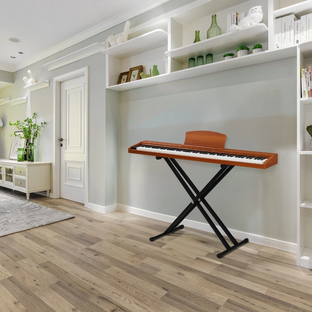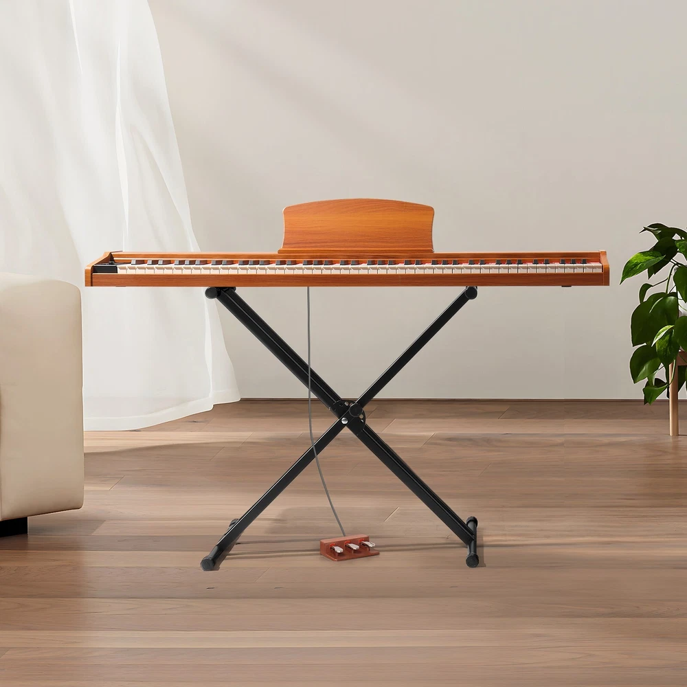Our service! 5-7 Fast delivery days. Free shipping with Local warehouse. 30 Days Free Returns and Exchanges. 7*24 customer service. Brand new with good conditions. Introductions: 88 Key Digital Piano Full Size Semi-Weighted Keyboards Design adopts superior quality custom Dream Sound source, which can bring you the most striking sound effects. Our 88 key piano with two Dual Bluetooth,MP3 Bluetooth and MIDI Bluetooth,Connect a COMPUTER or tablet with a USB cable for multimedia interaction. After the piano is turned on, bluetooth will be automatically turned on. The mobile phone can search the MIDI Bluetooth signal of this piano. After the connection, the playing software on the mobile phone can realize the wireless connection with the piano. it can also be used as a gift for relatives and friends, or as a prop for theatrical performances. Features: Superior Quality Custom Dream Sound Source 64 Polyphony/ 80 Demo Songs/ 128 Rhythm/ 128 Timbre Built-in two 15 W Stereo Speakers 3 Pedal System:Soft pedal-Soften the tone;Sustain pedal-Continuously increasing lengths of sustained notes,from slight to full;Sostenuto pedal-Press the pedal halfway down to get a partial damper effect Dual Bluetooth,MP3 Bluetooth and MIDI Bluetooth,Connect a COMPUTER or tablet with a USB cable for multimedia interaction. After the piano is turned on, bluetooth will be automatically turned on. The mobile phone can search the MIDI Bluetooth signal of this piano. After the connection, the playing software on the mobile phone can realize the wireless connection with the piano. Supports Cubase,FI Studio,Logic,Live ect. arrangement software Specifications: Piano Color: Walnut Color Music Stand:15.7 in x 5.7in x 0.39in Piano Dimensions:50.3inx10.78inx3.14in (without metal stand) Keyboard key Dimensions: White key width is 0.866in Package Dimensions:56.69 in x 16.53 in x 7.28 in Package Weight: 34.43 lbs/ 15.65kg Model:GPP-107 Keyboard: Number of keys: 88 Key (A1-C9) Action: Full Size Semi-Weighted Action Key Type: Piano-style Metronome:Yes Touch control: Yes Sounds: Sound Source:Superior Quality Custom Dream Sound Source Polyphony (max): 64-note Demo Songs:80 Rhythm:128 Timbre:128 Connectivity: MIDI Connectivity: MIDI over USB Bluetooth:MP3 Bluetooth and MIDI Bluetooth USB MIDI Connectivity: Yes Recording:Yes Headphone Jacks: 1 (1/8" Jack) Storage type: FLASH 128M Expandability Available: No AUX Input: Yes Line Output: Yes Line Input: Yes 3 Pedal System: Soft/Sustain/Sostenuto Pedal Onboard Features: Recording/Playback MIDI Sequencer Accompaniment Styles: Comprehensive Chord Accompaniment Preset Songs: 80 Display: LED Built-in speakers: Yes (2* 15W) Dual-tube X-Shape Keyboard Stand: Diameter: 0.78in(20mm) Wall thickness: 0.019in(0.5mm) Variable Height Positions: 38.4", 36.0", 32.7", 28.5", 23.6" and 18.1" Variable Side-to-side Dimensions: 12.20", 17.9", 23.6", 28.3", 32.7" and 35.8" Folding Dimensions: (17.3 x 39.4 x 2.4)" / (43.94 x 100.08 x 6.10)cm (L x W x H) Package Includes: 1 x Digital Piano 1 x Power Adapter 1 x Triple Pedals 1 x Headphone 1 x Headphone Adapters 1 x USB Cable 1 x Android Cable 1 x Piano Cloth 1 x Piano Cover 1 x Keyboard Sticker 1 x Music Clip 1 x Screwdriver , Screw Accessories And Manual Product Details: