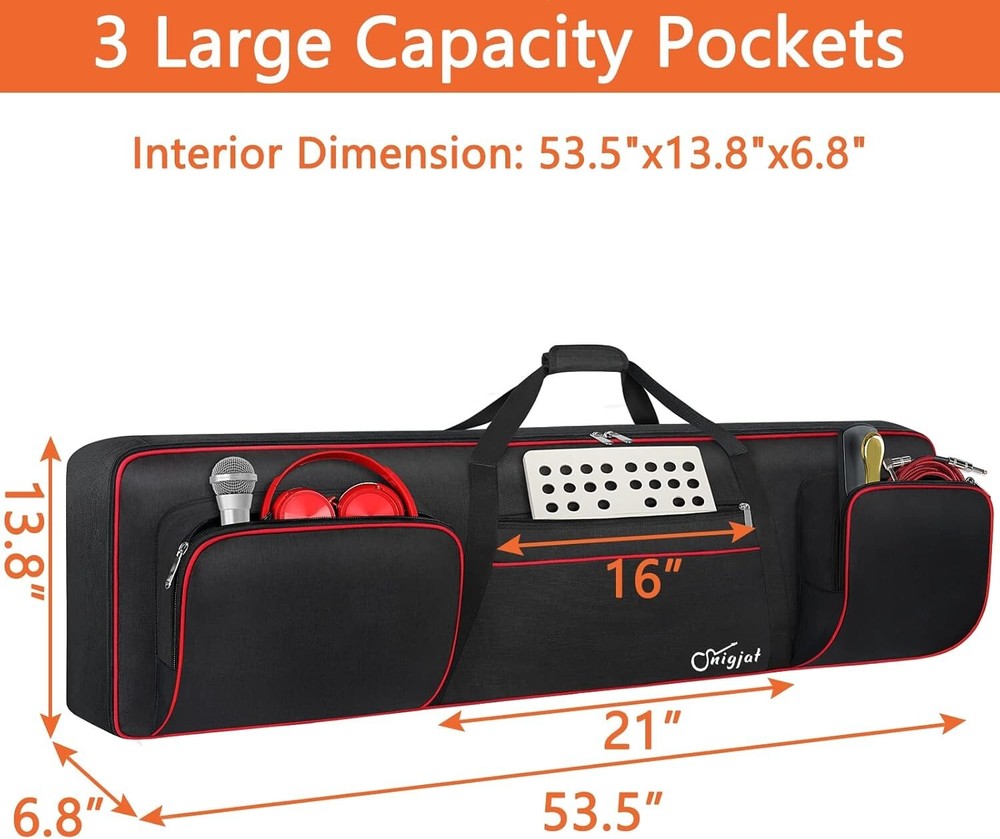 88 Key Keyboard Case Soft (Size: 53.5"x13.8"x6.8"), Padded Piano Case with Handle and Adjustable Shoulder Straps, Keyboard Gig Bag with 3 Pockets for Music Sheet Stand, Sustain Pedals, Cables Interior Size: 53.5 x 13.8 x 6.8 inch. Please check the size of your keyboard before purchasing. 88 Key Keyboard Case: The keyboard bag 88 key fits for most popular model 88-key keyboard. The large piano case owns 3 exterior zippered storage pockets, provides plenty of room for music sheet stands that are smaller than 16 inch, music books, pedals, cables, iPads, etc. You can store or transport the beloved keyboard and organize musical accessories anytime and anywhere 2 Ways for Easy Carrying: The keyboard gig bag 88 key features firm adjustable shoulder straps and handles, bringing 2 ways of carrying as a backpack or handbag. Rugged nylon handles is solid enough to carry with 1 hand. The piano keyboard case with adjustable shoulder straps is appropriate for musicians, keyboard players, wife, husband, family Organized Shoulder Straps with Fixing Tie: Under kinds of carrying ways, the 88 keyboard bag designed a more humanized way for people in different situation, providing an adjustable hook and loop fastener at the backside for gathering the shoulder straps. Musicians can make those straps concealed until needed, without worrying and annoying of stepping on and smudging the straps Instrument Safe and Security: The keyboard 88 keys case designed with 2 interior adjustable security belts to tight your keyboard, avoid shaking and other damage during transport between gigs or practice, ensure your keyboard stays safe. Whether you are a teacher, musician, keyboardist, or other musical instrument players, the piano case is the worry-free way to keep your musical instruments safe and clean to ensure the best effect no matter in performance or transportation 600D Waterproof and Dustproof Fabric: To protect your favorite instruments, the keyboard gig bag features the waterproof and scratch-resistant material to ensure the keyboard avoids collision and scratches, and prevents from wet. Thanks to the enduring structure, the piano keyboard case keeps keyboard dry and against dust. With the ultra-lightweight solution, the keyboard bag 88 keys is portable to carry in transporting, gigging, and traveling