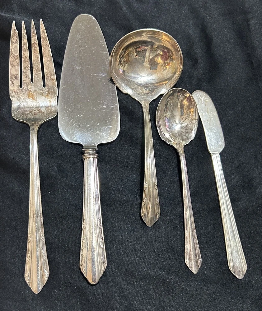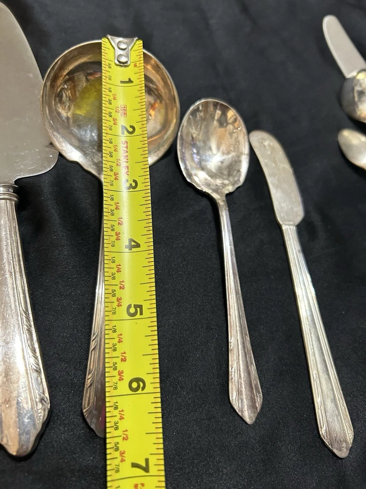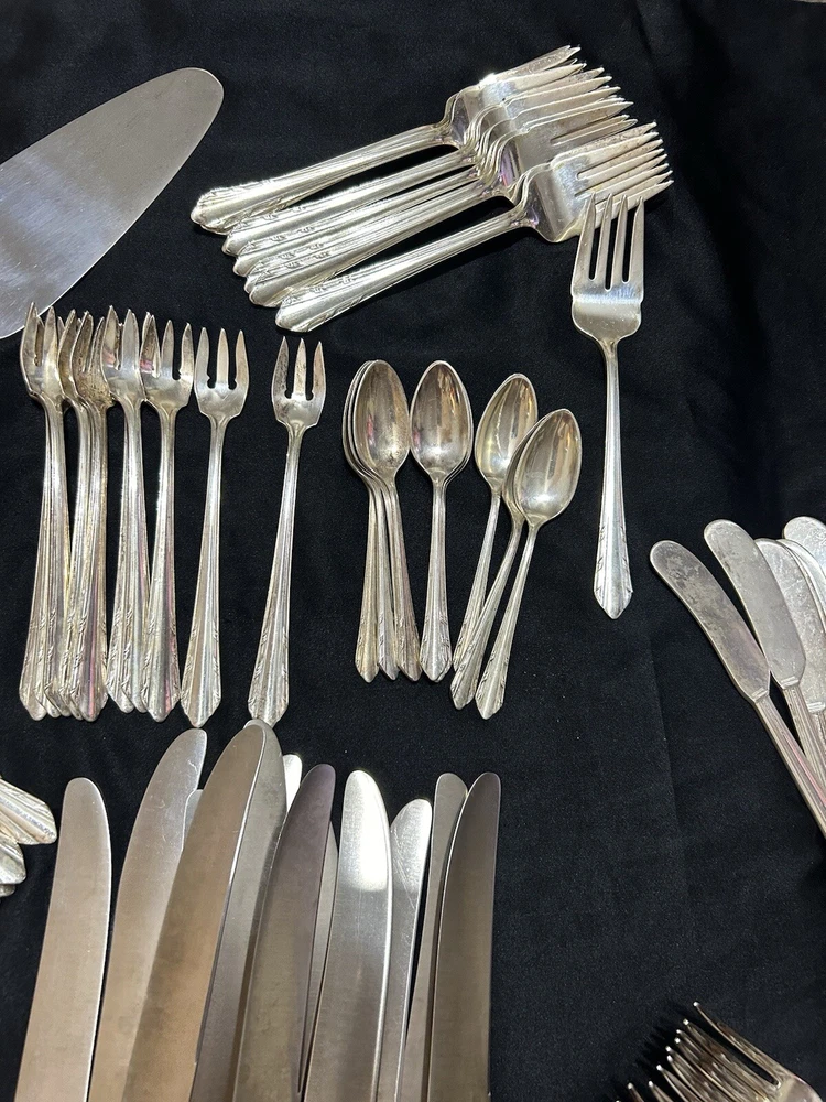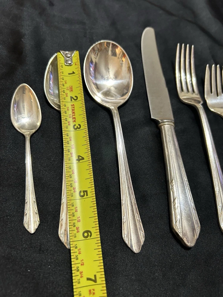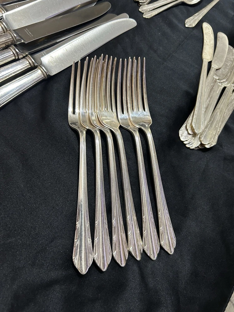 88Pc Reed & Barton Madamoiselle Mademoiselle 1932 Art Deco Dinner Dessert Set 6 Dinner Forks 12 Dinner Knives 12 Dinner Gumbo Spoons 11 Salad Forks 12 Dessert Spoons Teaspoons 10 Demitasse Spoons 10 Seafood Cocktail Forks 11 individual Butter Knives 1 Serving Fork 1 Ladle spoon 1 Pie slice server 1 Sugar spoon Good vintage condition. Normal signs of wear and aging. Minor scratches, patina and discolorations. Please study pictures carefully before purchasing Feel free to ask us any questions. Thank you for visiting our store! Bag138