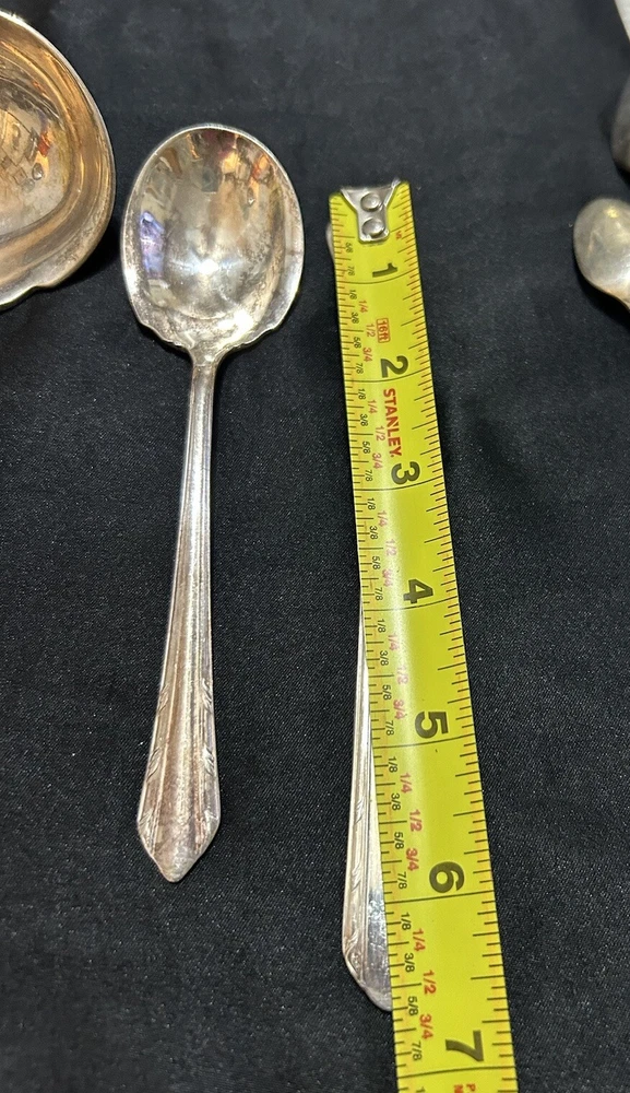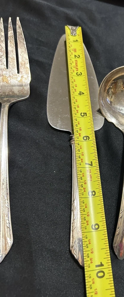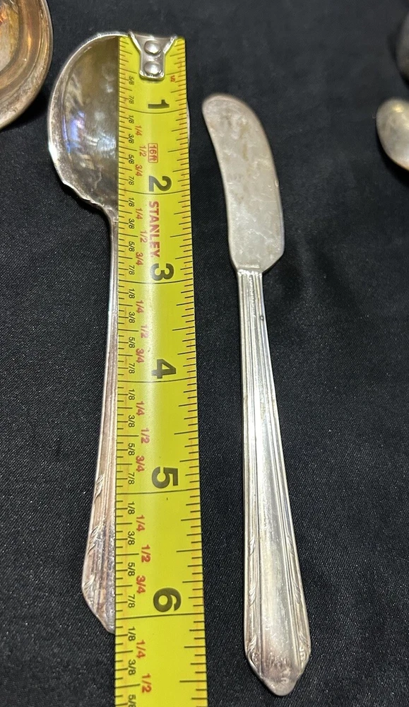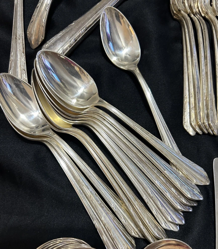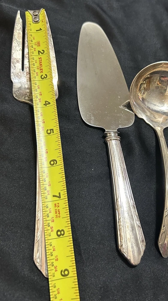 88Pc Reed & Barton Madamoiselle Mademoiselle 1932 Art Deco Dinner Dessert Set 6 Dinner Forks 12 Dinner Knives 12 Dinner Gumbo Spoons 11 Salad Forks 12 Dessert Spoons Teaspoons 10 Demitasse Spoons 10 Seafood Cocktail Forks 11 individual Butter Knives 1 Serving Fork 1 Ladle spoon 1 Pie slice server 1 Sugar spoon Good vintage condition. Normal signs of wear and aging. Minor scratches, patina and discolorations. Please study pictures carefully before purchasing Feel free to ask us any questions. Thank you for visiting our store! Bag138