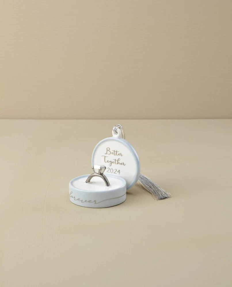 After the question is popped and the champagne is poured, relive that special engagement with this beautiful ring box ornament. A simulated diamond sits at the center, while silver script text reads "Better forever" inside the lid and "forever" along the outside of the box. It's the perfect way to remember that wonderful engagement day every time you see it on the tree. WHY IT'S SPECIAL: 's ring box ornament is the perfect way to remember that wonderful engagement day every time you (or they!) see it on the tree. After the question is popped and the champagne is poured, this ornament captures the feeling forever. Silver script text reads "Better Together" inside the lid and "forever" along the outside of the box. WHO IT'S PERFECT FOR: This ring box ornament makes a wonderful gift for couples. Give it as a thoughtful gift during the holidays or on the couple's special day. WHAT'S IN THE BOX: Includes (1) ring box ornament which measures 2"L x 2.25"W x 2.25"H. WHAT IT'S MADE OUT OF: 's ring box ornament is crafted of beautiful porcelain with 24K gold accents and a gold cord for hanging. HOW TO CARE FOR IT: This Christmas ornament is meant for display on the tree during the holiday season, but you can keep it around all year to maintain an atmosphere of cheer!