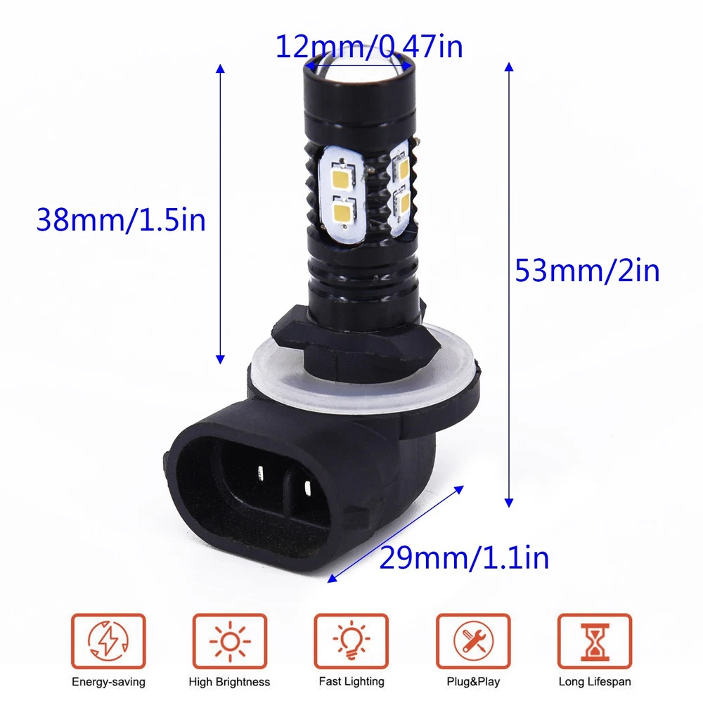 896 Lights Bulbs Lamps 898 886 888 Auto Car Driving Daytime Running Degrees DESCRIPTION Features: *Ultra Bright Car LED Fog Driving Lights *Can be used as Fog Driving Lights/ Daytime Running Light for DRL *Super bright white light, giving your car an extra glow *Faster on/off response, no delay to light up *Easy to install, and play *Low power consumption, energy saving and *Long lifespan, waterproof& vibration resistance, to use * brand new and high quality Specifications: *Light Color: White(As Pictures Show) *Color Temperature: 6500K *LED Type: 2323LED *LED Number: 10 *Lumen: 1200LM *Beam Type: for 360 Degrees *Power: 50W *Lifespan: 50000 hours *Waterproof Grade: IP68 *Interchange Number:, L,, 889, 862, 894, 894X, 896, 898, 886, 888 *Dimension: 53*12mm(Approx.) Package Contents: 2pcs Fog Lights Note: The real color of the item may be slightly different from the pictures shown on website caused by many factors such as brightness of your monitor and light brightness. POLICES Shipping Payment WARRANTY We only ship to confirmed Paypal addresses. Please comfirm that your paypal address is in line with your shipping address. Please kindly note that the c ombined shipping is not provided because the shipping fee is calculated by weight. Also, the each additional item means exactly the the same color and size. It takes about 7 -15 working days to US; about 10-30 working days to other countries. Transit time may be a little delayed because of the bad weather and customs inspection . If you do not receive your item within 30 working days since payment finished, please contact us immediately for further assistance. We accept payment via Paypal only. Payment must be made within 5 days, Non-payment may result in an UPI (Unpaid Item), eBay will automatically close your account if you accumulate 4 UPI's total. Import cutoms duties or taxes which are not included in item price, if any, are on buyer's responsibility. You can check with your local customs office for further information prior to bidding/buying. We strive for 100% customer satisfaction! Positive Feedback is very important to us. If you have any questions, p lease feel free to contact us via "Ask seller a question" . We will reply your email within 24 working hours.