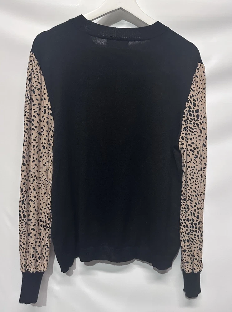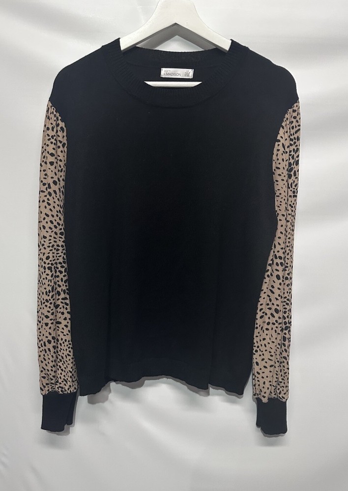 MEASUREMENTS length-23.5” bust-23” Elevate your wardrobe with this stylish and versatile sweater top from 89th & Madison. Featuring a classic crew neck and long balloon sleeves, this sweater is perfect for any occasion, whether it be a casual day out or a business meeting. The tight-knit polyester and rayon material makes it lightweight and easy to care for with machine washable instructions. The black and tan color scheme adds a touch of city and classic vibe to your outfit, while the regular fit ensures comfort and flattery. With its size L and regular size type, this sweater is perfect for any women's department. Whether you're traveling or enjoying the winter, summer, or fall season, this sweater is a must-have addition to your wardrobe.