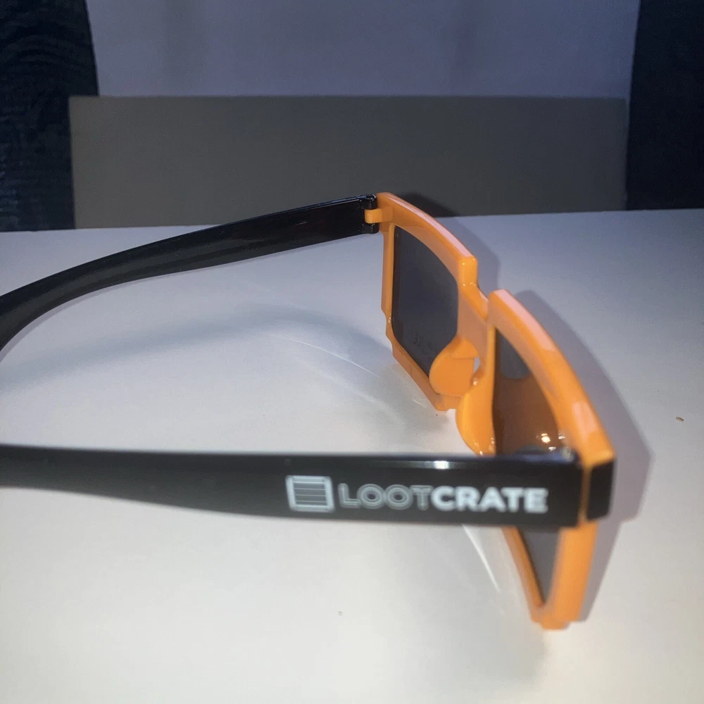 These exclusive Loot Crate 8-Bit Pixel Orange Sunglasses feature a rectangular style with black tinted lenses. Designed for both men and women, these sunglasses provide UV400 protection. The frame is made of plastic in an orange color, perfect for fans of the Minecraft theme. Perfect for adding a fun and stylish touch to your outfit.