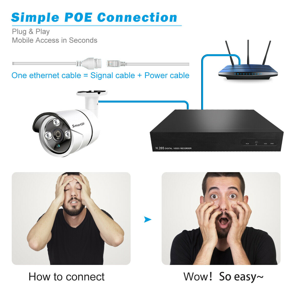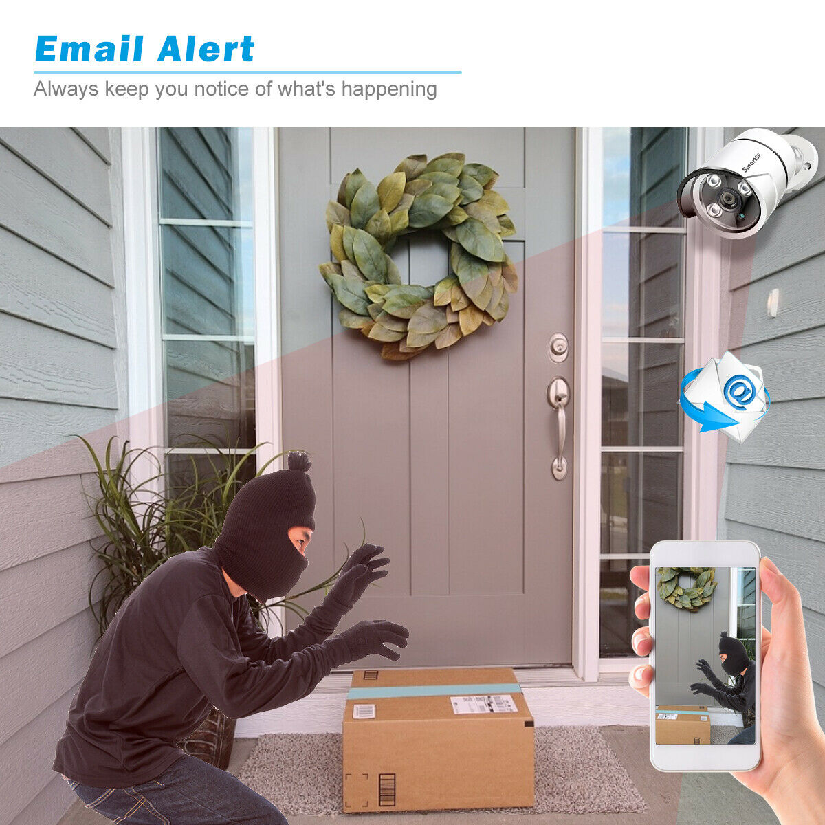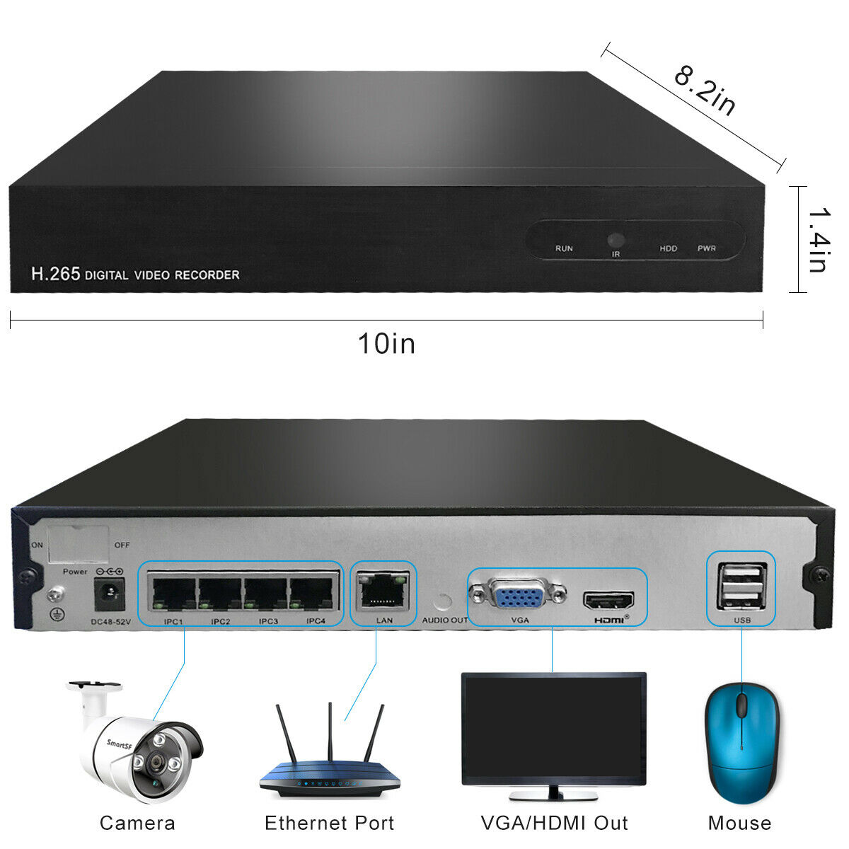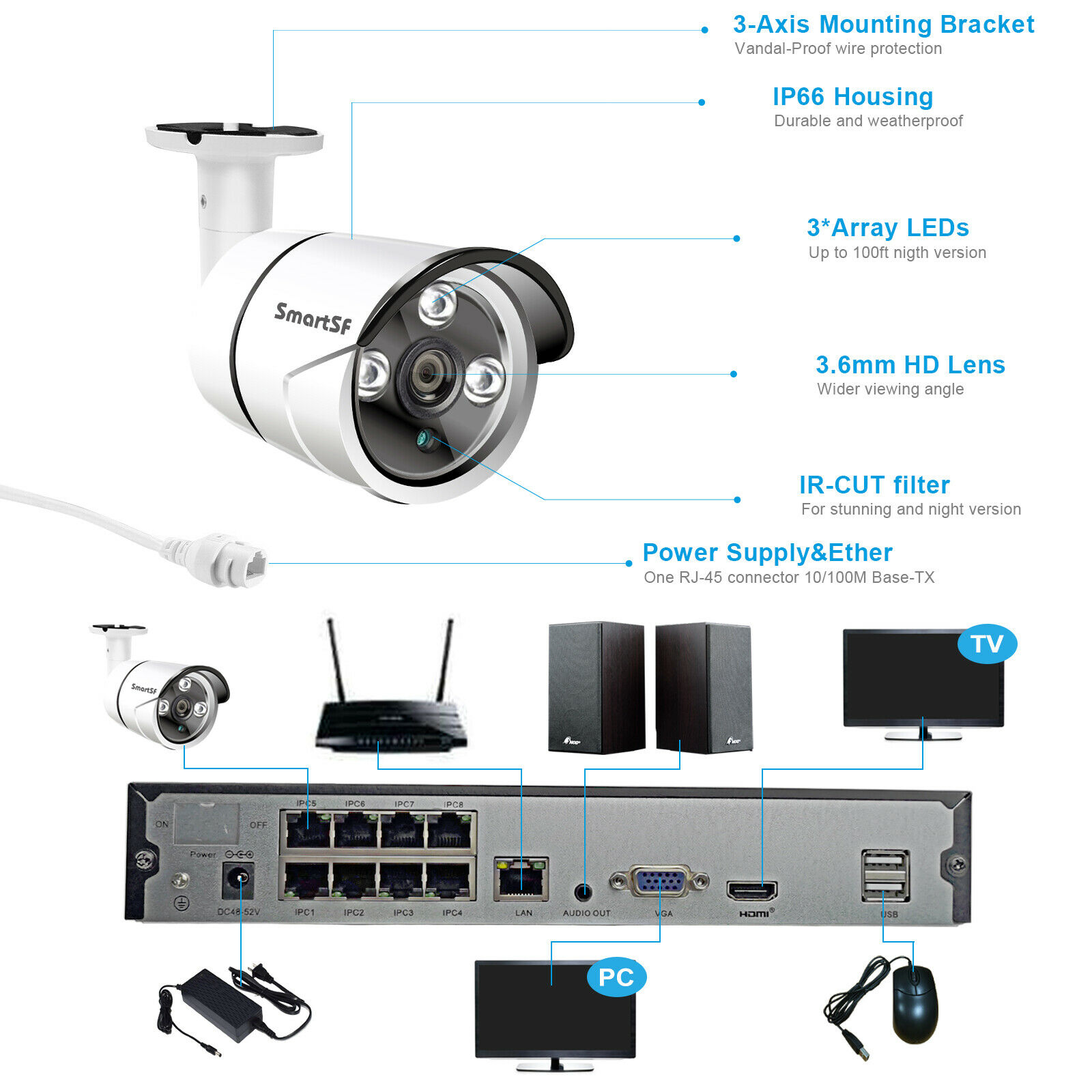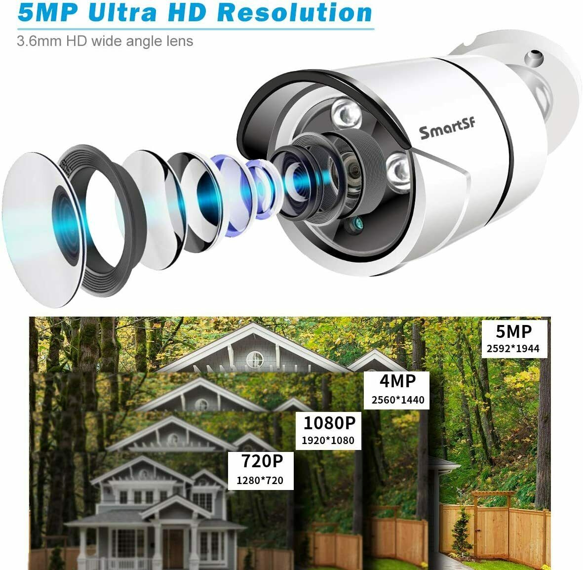 SmartSF 8 Channel 5-Megapixels 2560*1920P Outdoor PoE IP Security Camera System Features: 【Super HD 5-Megapixel High Resolution】 5.0MP IPG5520-F with a pixel resolution of 2560x1920, that is, nearly 2.4X the resolution of 1080p Full HD, and even 1.3X the resolution of 1440p. It sees and records your home security more clearly, with more details. 【Excellent Night Vision, Up to 100ft】 Great cameras aren't just measured by images in daytime. SmartSF 5.0MP security camera kit stands out for its incredibly excellent images at night. Infrared LEDs enable long night vision distance (up to 100ft). Captures crystal clear video evidence of theft and vandalism that occur in low-light conditions. Reliable Solution for Home, Business and Projects. 【Waterproof Works Perfectly Outdoor/Indoor】 The 4 Bullet cameras 5.0MP IPG5520-F have solid aluminum bodies and housing, with an IP66 waterproof rating. So you can feel free to install them outdoors, like in your garage, backyard, or anywhere else. It can stand harsh weather conditions, including rain, snow, intense cold and heat. Rain or shine, hot or cold, these cameras never quit. 【PoE–Easy Setup, Eve n for a Beginner 】 A real plug and play security system! It features PoE (Power over Ethernet), with a single network cable connecting each IP camera to the NVR for both power supply and video signal transmission. Easy wiring – the wiring process can’t be simpler for DIY enthusiasts and beginners. 【Remote Viewing, Anytime, from Anywhere】 No matter where you are, you can remotely access the security camera to see live streaming and stay connected. Remotely view the IP camera via free “IP Pro” App on your mobile device, free “E-see Net” CMS Client on your computer, web browser. Even when you are in your office or travelling, you can check what's happening to your home/business on the go. PoE Network Video Recorder Specifications: IP Video Input: supports 4 IP cameras Video Output: Monitor or HDTV via VGA, HDMI Compression Format: H265+, H.265 and H.264 Playback: 4 cameras play simultaneously HDD: Not included HDD Capacity: 1x internal SATA port, up to 6TB Power over Ethernet Sockets: RJ45 x 4 USB Port: 2x USB 2.0 (mouse control, backup, firmware upgrade) Remote Access: iPhone, Android Phone, Windows PC PoE IP Camera Specifications: Image Sensor: 1/2.8" CMOS Sensor Effective Pixels: 2560 x 1920 (5.0 Megapixels) Frame Rate: Main Stream@25fps, Sub Stream@6fps Day & Night Vision: Auto / Color / BW Output Interface: RJ45 Operating temperature: Up to +60℃ What’s In Box: 1x 8CH 5MP NVR 1x 4pcs 5MP cameras 1x USB mouse 1x DC 48V3A power supply for NVR 4x 18m network video cable for IPC 4x Screw kit for IPC installation 1x User manual