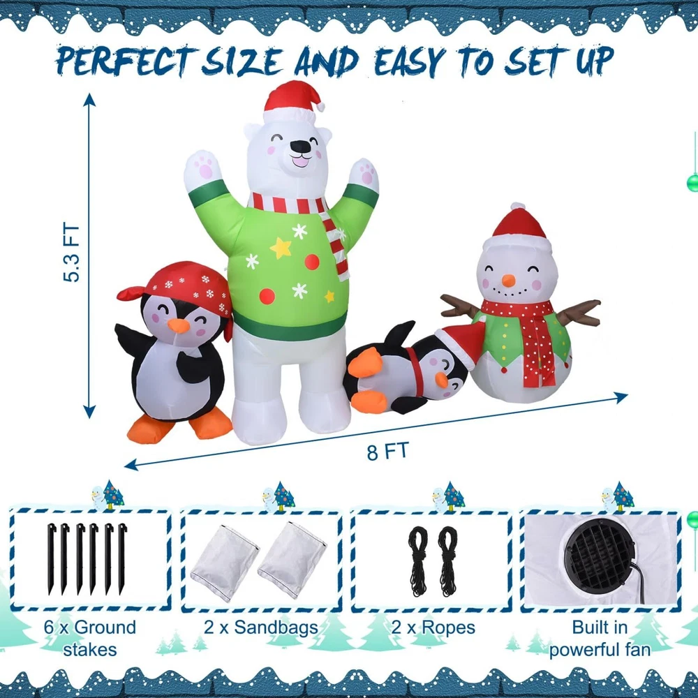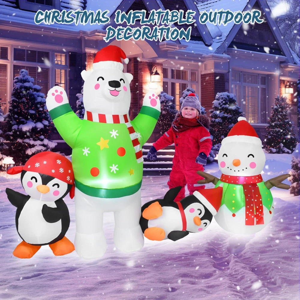 8FT Christmas Inflatable Outdoor Decoration Inflatable Snowman Plays with Penguin Polar Bear Christmas Decorations Outside Blow Up Christmas Decorations Outdoor Christmas Inflatables for Yard Cute And Festive Christmas Decorations: The Christmas outdoor inflatables are made up of snowmen, polar bears and penguins in different shapes. Cute & charming. Christmas decorations create a strong festive atmosphere and are deeply loved by kids High Quality: Christmas blow up yard decorations made of high-quality polyester, weatherproof and fade resistant. Equipped with 2 windproof ropes and 4 ground stakes, and built-in sandbags to ensure a more stable stand when used outdoors Super Bright LED Lights: The Christmas yard inflatables decorations are Built-in super bright LED lights, 8 FT long. Illuminate your lawn garden house at night and make your yard more eye-catching. Kids and adults alike will love it Quick Inflatable: Our outdoor inflatable christmas decorations are equipped with a powerful built-in fan, just plug it into the socket and in seconds you will have a glowing inflatable Christmas decoration. Easy to install and disassemble Perfect Christmas Gift: Perfect for Christmas outdoor decorations. You can place it in your garden, front, backyard or party, etc. to give your friends and family a stronger Christmas atmosphere. Can also be used as Christmas gifts
