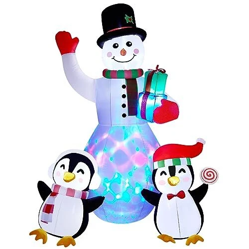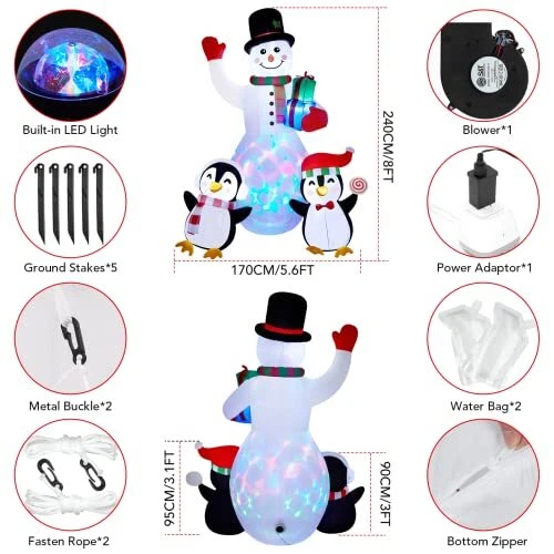 30 Days Return Policy Fast Delivery Trusted seller 8FT Christmas Inflatables Christmas Yard Decorations with LED Lights, Outdoor Inflatable Christmas Snowman Penguin Xmas Blow Up Decor for Holiday Outdoor Decorations Christmas Product Description ⛄️Gorgeous Christmas Decorations - This pretty 8-foot tall Christmas inflatable snowman wears a loving adorable top hat and with sweet warm smile, just like welcoming guests. It will definitely attract their attention and delight them when your kids or your guests come at the door or garden. Perfect for winter Christmas outdoor yard decorations, Christmas event decoration, Holiday blow-ups, Christmas Eve night decor. ⛄️Built-in Super Bright Lights - This friendly blow up snowman built-in bright RGB ball light, which makes it look sparkly and very beautiful even in dark night. It will definitely light up your yard or lawn, bring you surprises and joy, make your home full of festive mood. 8FT is big enough to make your yard stand out, it will be the coolest decoration in the whole neighborhood! ⛄️Excellent Craftsmanship - giant inflatable snowman is made of IP44 waterproof 210T high-density thick polyester material, which is very wrinkle-resistant and not easy to be pierced by sharp and hard things, the excellent stitching improves improves its durability. With a 6.56 foot power cord, you can flexibly inflate the inflatable snowman near your house, or add an extension cord to decorate anyw in your yard. ⛄️Stable and Secure - This cute inflatable snowman come with 4 stakes, 4 ropes and built-in 2 sandbags, which will keep this cute snowman firmly fixed to the ground. What’s more, in order to enhance the decoration effect of the Christmas snowman, the built-in sandbags allow it to stand without support when t is no wind. It's a great gift for your children and friends! ⛄️Easy & Safe to Use - Equipped with a powerful blower, inflates fast and doesn't make much noise. Just plugging into the power, Christmas snowman self-inflates within 1 minute. Unplug the power, it can also deflate easily. After deflated, it's easy to storage and save space, wait for next Christmas and winter to use it. Shipping Returns Payment Shipping Shipping is FREE to all addresses other than APO/PO boxes in the lower 48 states. All our stock ships from US-based warehouses. Shipped via USPS or UPS (depending on location and package weight) Unless stated otherwise, all orders will ship within 24-72 hours of your payment being processed. Check our feedback to see the great reviews of FAST shipping we offer. Returns As our valued customer, we will do our best to make sure the product you receive arrives to you on time and as expected. If you are not satisfied with your purchase, please contact us within 30 days of receiving your order to process a return. Payment We currently accept payment via eBay managed payments only. Once payment is cleared, we will dispatch your shipment within 1-3 business days. Please refer to the "Shipping" tab for more information regarding shipping speed to your destination.