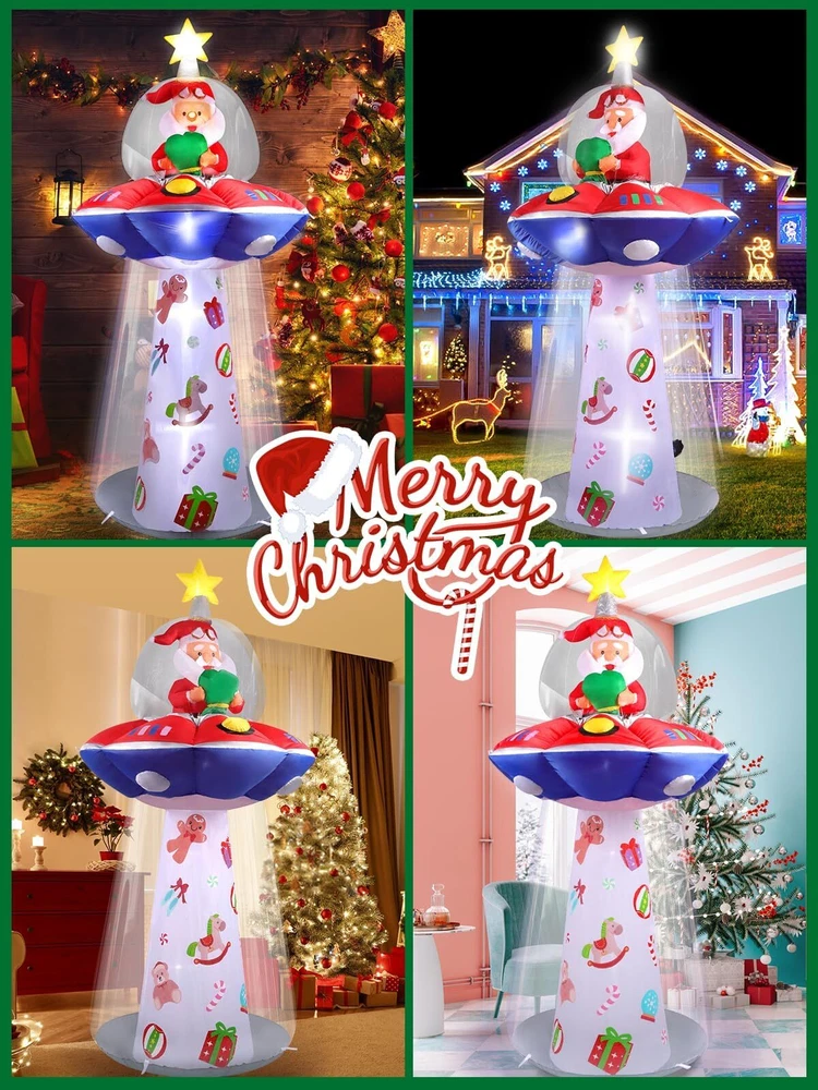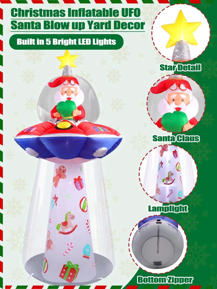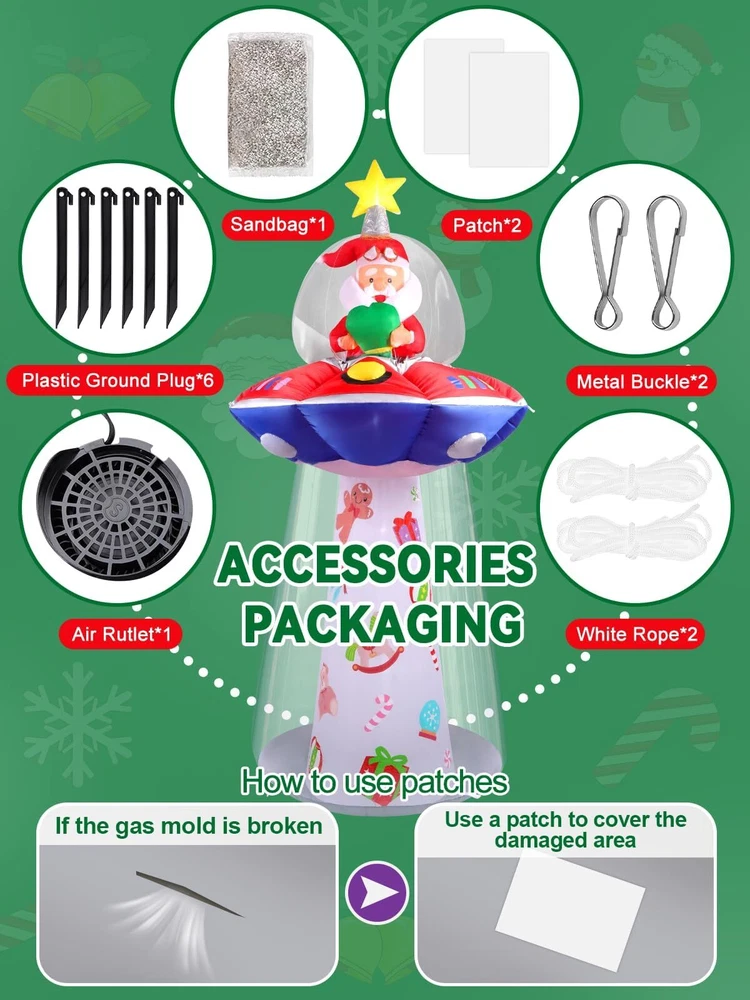 8FT Christmas Santa Claus UFO Blow Up Decoration with Built-in LED Lights for Outdoor and Indoor Feature: 1.Santa Claus inflatable decoration are made of high quality, polyester material, reliable and reusable, sturdy and watertight, easy to use and strong, not easy to break, tear or fade. 2.The unique design style, Santa Claus riding a UFO spaceship, full of childlike appearances, is charming and Imaginative. 3.In a short time, the Christmas Inflatables UFO Santa can be inflated and stand up. Turn on the switch to light up the night, enjoy yourself and guests. Package Includes: 1 x Blow up UFO Santa Claus 5 x LED lights 6 x Ground stakes 2 x Carabiners clips 2 x 2.5 Meters long ropes 1 x Sand bag 1 x UL adapter 1 x Built-in fan 2 x Patch Specification: Type: UFO with Santa Claus Inflatable Material: Watertight polyester and pvc Color: Red, green, white, blue,yellow Size: App.3.8ft long x 3.8ft wide x 8ft tall (Please allow 1-3cm error due to manual measurement. please make sure you do not mind before you want.) How to Inflate: 1.Be sure the zipper is closed in order to figure to fully inflate 2.Plug in and allow to inflate 3.Secure tethers and stakes 🎅🏻【Christmas Inflatables Outdoor Decorations】Eye-catching design 8FT high Christmas Santa Claus on UFO yard decoration, is perfect for Christmas use indoor or outdoor decor, Christmas party and Christmas haunted house. Use it for a party, stage prop, office, yard and more. Light up the night with the internal LED light and give the scenes a glowing spirit. Bring extra holiday cheer to your home and yard. 🎅🏻【Built-in 5 LED Lights】The Christmas inflatables UFO Santa Claus holding a gift bag outdoor decorations build-in eye-catching white LED Lights glow in the dark, creating a very festive and imaginative atmosphere, catching your eyes at the first sight. 🎅🏻【Watertight & Sturdy】Christmas yard inflatables is made of high strength watertight material which is sturdy, reliable and reusable against rips and tears, the excellent stitching improves the durability of the inflatable decoration. In addition, this outdoor inflatable is providing with a powerful-duty blower to continuous airflow inflate the decoration, it also come with a storage box for you. 🎅🏻【Easy to Inflate & 】Inflate the blow up Christmas decorations until there is enough air inside. Then fix it to the ground with stakes and sand bag to keep stable. Zip up the bottom zipper to avoid air leakage or open the zipper for fast deflation, and it is easy to fold up and after holiday. 🎅🏻【Perfect Size & Components】The Christmas Santa Outdoor Indoor Decorations, is 3.8ft long x 3.8ft wide x 8ft tall. Except the blower, transformer and storage box, it comes with 6*stakes, 2*hook up, 2*8.2ft ropes, 2*patch and 1* sand bag to secure it on the ground or wall. No worries about if the Santa Claus inflatable might fly away by the wind.
