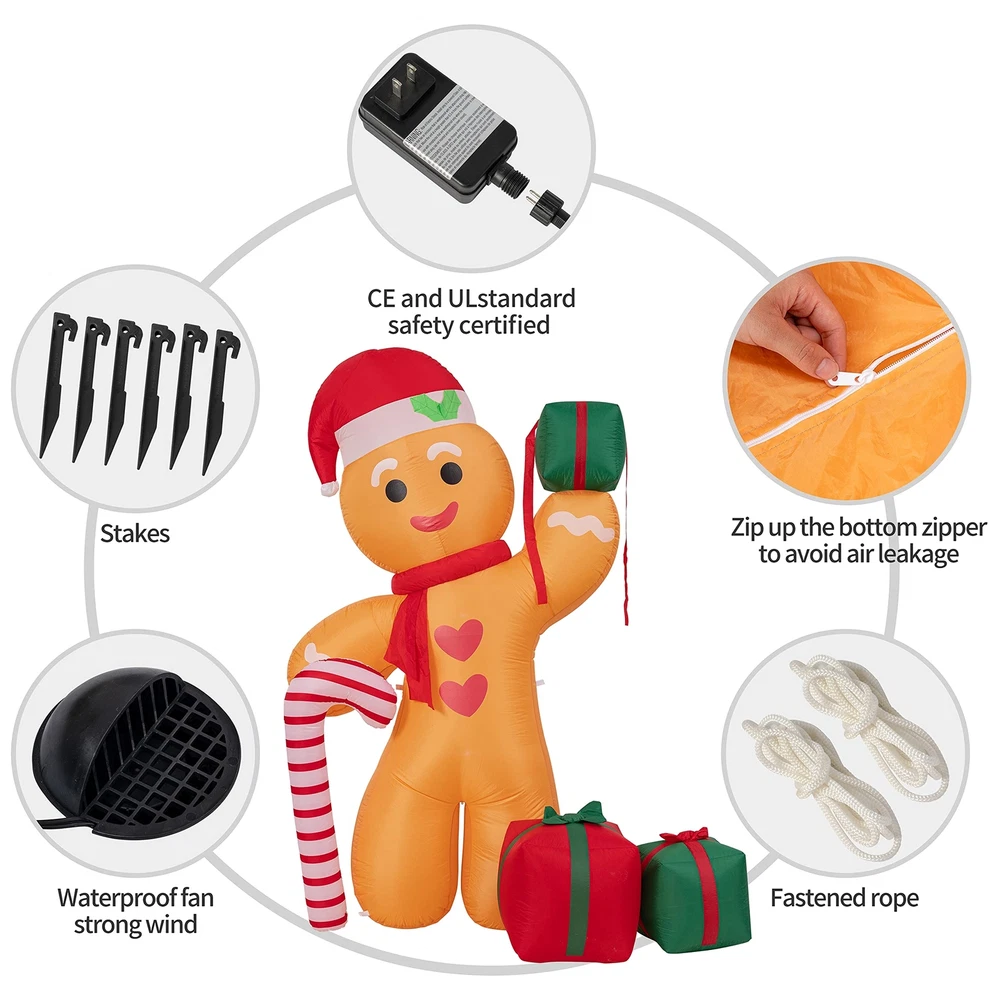 Dimension:Inflatable gingerbread man is 8ft height,5.5 ft wide,huge and durable enough.Outdoor christmas decorations with LED light up,not only attractive in the daytime with the big size,but also amusing at night with the LED light. Lovely Appearance:Smiling face,one hand with candy cane and the other hand with a green gift box,santa’s hat,glove,two sweet heart shape at the front,another two gift boxes beside the feet of inflated gingerbread man,decorating with this inflation festival gingerbread man will attract your neighbors and guests’ attention. Stable And Quick Inflation:Outdoor decoration include 6 stakes and 2 ropes to secure it to the ground,keep away from flying away with the wind.It is easy to inflate and deflate.Giving you a simple operation to decorate the christmas gingerbread man Widely Used:The christmas inflation decoration is suitable indoor and outdoor,especially outdoor because of the height 8ft.Not your home,but also fit with restaurant,yard, porch, lawn and garden, party etc. Good Gift:The inflation christmas gingerbread man is nice and good for festival celebration,you can also send it to your children and friends as christmas gifts,having a good enjoyment during the christmas festival.