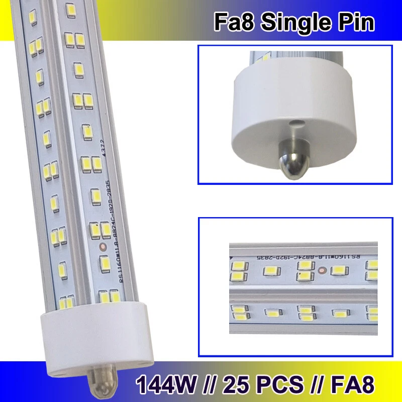 FAST DELIVERY - Ship from New Jersey or Los Angeles Warehouse via FedEx , 3-7 Days Delivered Your Door . SCIENTIFIC DESIGN - 8Ft LED Shop Lights Fixture is Made of 6500K Cold White SMD2835 LED Chip ,Plastic Clear Cover , Aluminum Bracket Housing ,and AC85-277V Constant Current Driver . It can work in -68F to 120F Temperature Conditions EASY INSTALLATION - The Integrated Tube Fixture Can be Install on Wall or Ceiling ,Easily Replace Traditional Fluorescent Tube Bulb . Plug and Play , Free Accessories (Power Cords, Connector , Extension Cords , Clip and Screw ) Come with Tube Lights Together WIDE APPLICATION - Linkable 8Ft Bulbs Widely Used in Garage Ceiling , Barbershop , Schools, Hospitals Basement , Factory Warehouses , Supermarkets Cooler Door , Offices, Shops,Hotels, etc 8FT LED Tube Light FA8 T8 Single Pin 144W LED Shop Light 8Foot Bulbs 6500K 25P 【No RF & FM Interference】LED Driver have passed Electromagnetic Magnetic Compatibility EMC tests,No cause EMI ,No longer subject to any RF & FM jamming. Never interfering with the signal of your garage roller shutter door,No make noise when you listen radio 【Easy to Install】Just simply bypass the ballast and connection AC85-277V AC power . Not compatible with single-ended powered sockets 【Wide Application】 - 8Ft 144W V Shaped FA8 HO LED Bulb fitted to replace traditional F96T12 T8 T10 T12 fluorescent bulbs. Widely used in Garage,supermarkets, offices , convenience stores , gas stations , warehouse,parking lot,shops, hotels,Refrigerator,coolers or freezers illumination,etc 【High Output】8Ft 144W 18000LM FA8 【Rotate Cap & Swivel End】 Easy Adjust rotated Lighting Direction within 180 degree after Installation