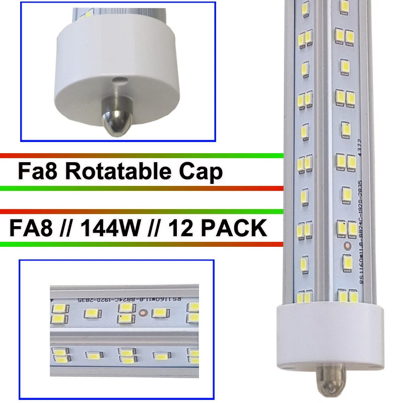FAST DELIVERY - Ship from New Jersey or Los Angeles Warehouse via FedEx , 3-7 Days Delivered Your Door . SCIENTIFIC DESIGN - 8Ft LED Shop Lights Fixture is Made of 6500K Cold White SMD2835 LED Chip ,Plastic Clear Cover , Aluminum Bracket Housing ,and AC85-277V Constant Current Driver . It can work in -68F to 120F Temperature Conditions EASY INSTALLATION - The Integrated Tube Fixture Can be Install on Wall or Ceiling ,Easily Replace Traditional Fluorescent Tube Bulb . Plug and Play , Free Accessories (Power Cords, Connector , Extension Cords , Clip and Screw ) Come with Tube Lights Together WIDE APPLICATION - Linkable 8Ft Bulbs Widely Used in Garage Ceiling , Barbershop , Schools, Hospitals Basement , Factory Warehouses , Supermarkets Cooler Door , Offices, Shops,Hotels, etc 8FT Led Tube Light 144W FA8 T8 Single Pin LED Shop Light 8FT Bulbs 6500K 12PC 【No RF & FM Interference】LED Driver have passed Electromagnetic Magnetic Compatibility EMC tests,No cause EMI ,No longer subject to any RF & FM jamming. Never interfering with the signal of your garage roller shutter door,No make noise when you listen radio 【Easy to Install】Just simply bypass the ballast and connection AC85-277V AC power . Not compatible with single-ended powered sockets 【Wide Application】 - 8Ft 144W V Shaped FA8 HO LED Bulb fitted to replace traditional F96T12 T8 T10 T12 fluorescent bulbs. Widely used in Garage,supermarkets, offices , convenience stores , gas stations , warehouse,parking lot,shops, hotels,Refrigerator,coolers or freezers illumination,etc 【High Output】8Ft 144W 18000LM FA8 【Rotate Cap & Swivel End】 Easy Adjust rotated Lighting Direction within 180 degree after Installation
